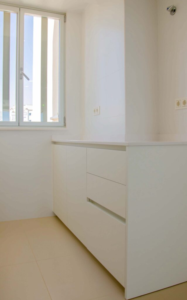 El modelo seleccionado para este proyecto es Ak_Project de Arrital en el acabado super mate blanco láser y puertas de 22 mm de espesor. Este acabado destaca por ser un blanco puro un agradable tacto aterciopelado. Para la encimera, se ha elegido un Silestone Iconic White en 2 cm de espesor, de igual manera se han recubierto las paredes en el mismo material tanto en la zona de aguas como en la zona de cocción.