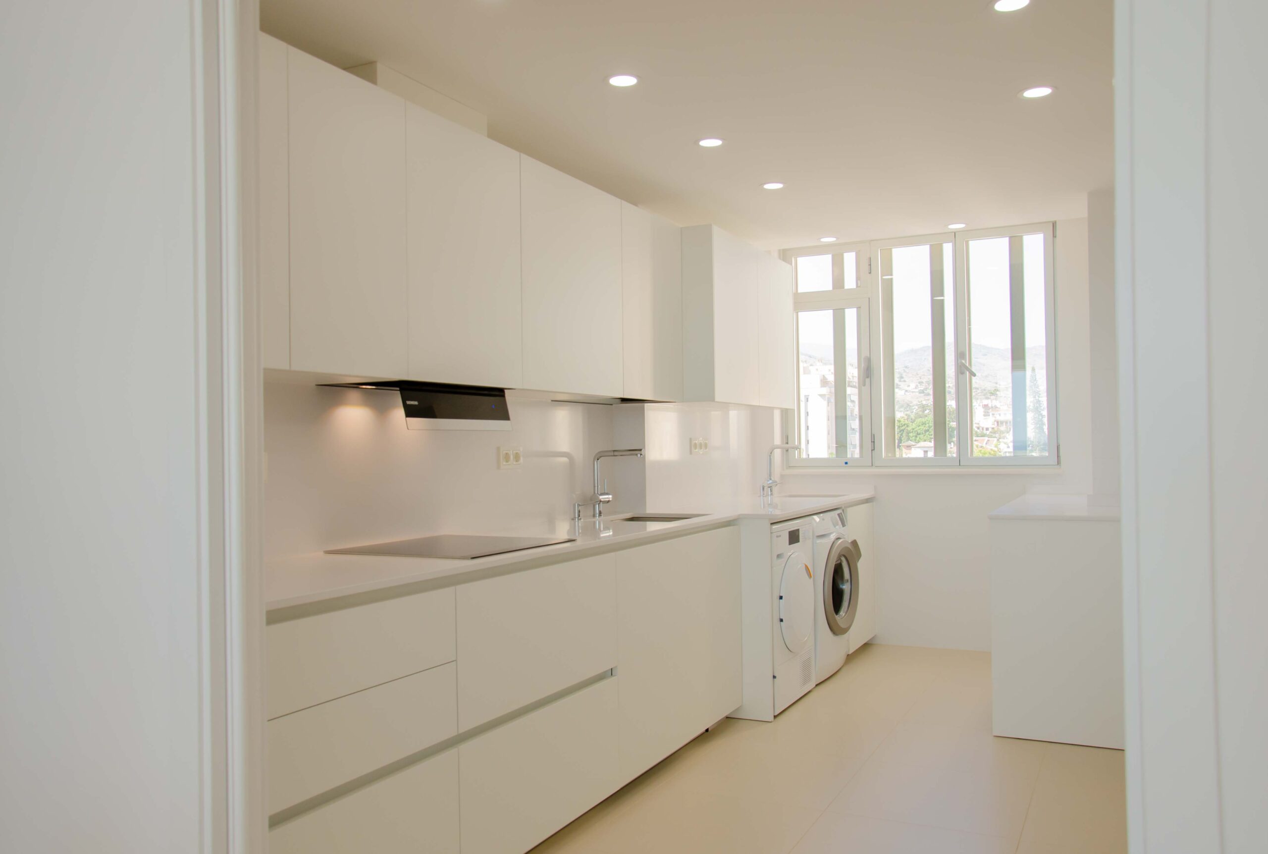 Respecto a los electrodomésticos, de Siemens se ha elegido la inducción modelo EX675LJC1E, el horno pirolítico modelo HB673GBS1, el microondas modelo BF634RGS1 y la campana integrada modelo LJ67BAM60. De Miele se ha elegido el lavavajillas completamente integrado modelo G5260SCVI y la secadora modelo TCC220WP.
