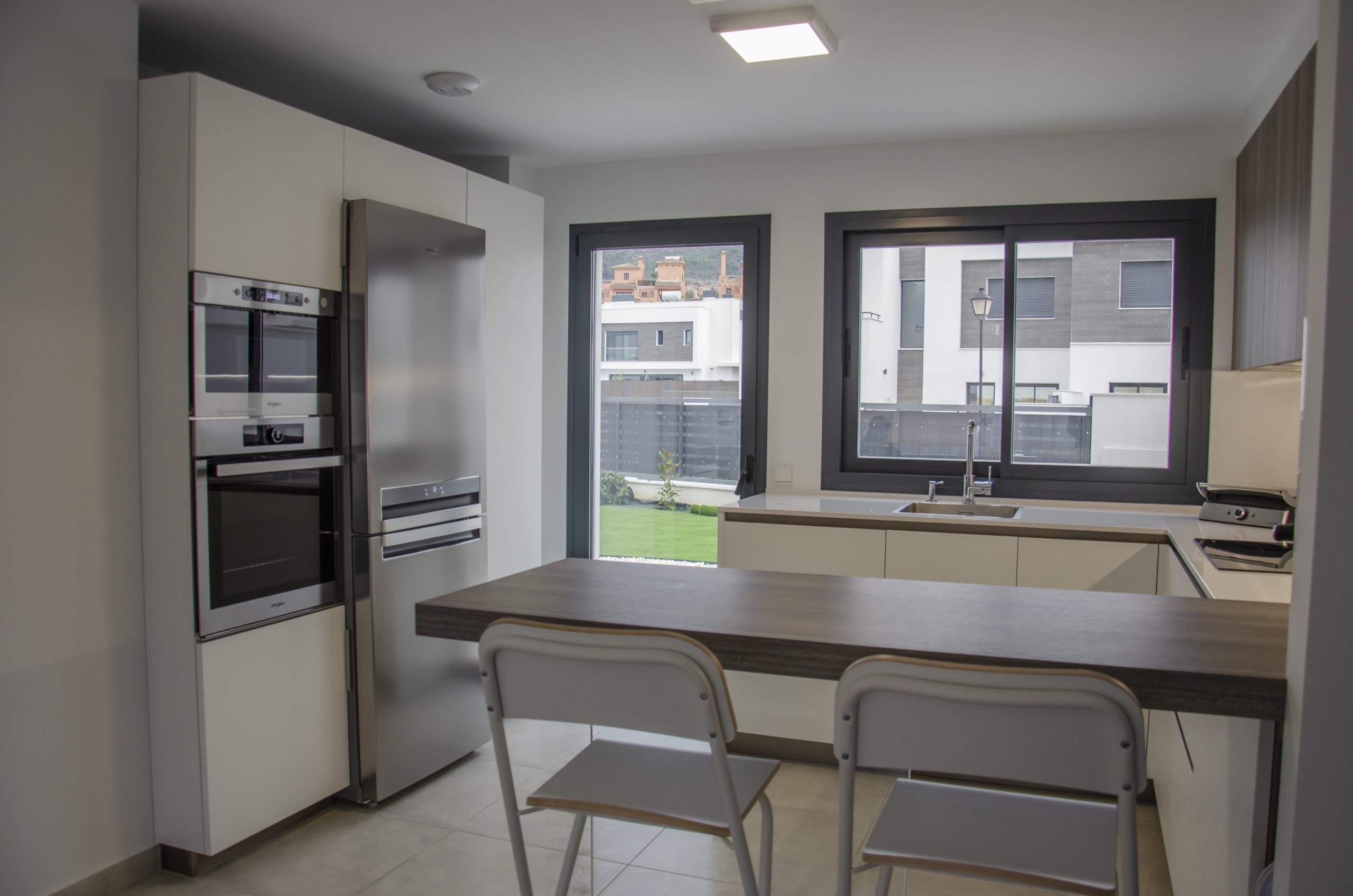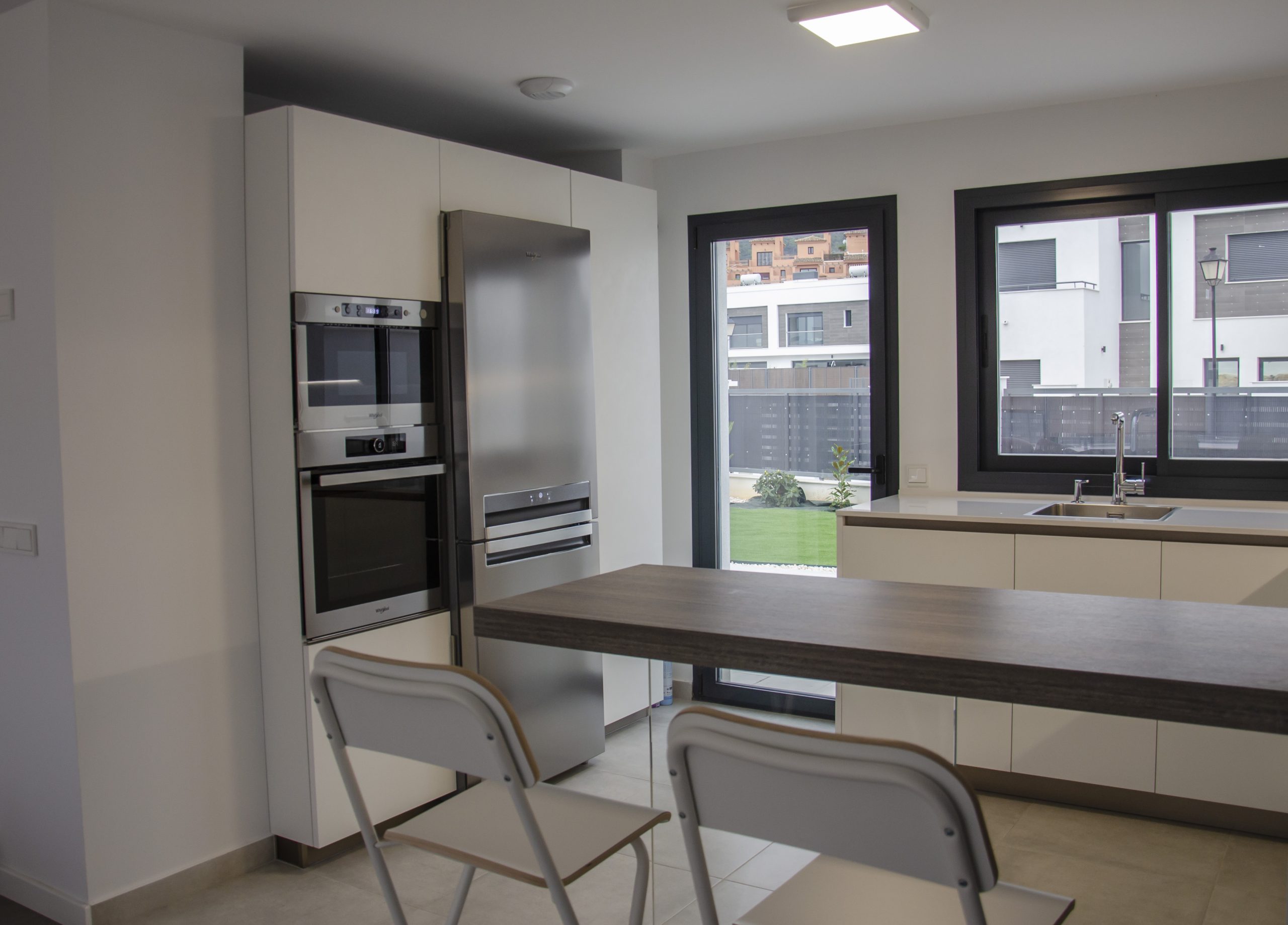 Se ha elegido un pack de Whirpool que está compuesto por la inducción de tres fuegos modelo ACM803BA, un lavavajillas integrable modelo WIC3C26, un frigorífico combi en acero inoxidable modelo BTNF5323O y en columna el horno modelo AKZ96220 y el microondas modelo MW439IX. Para la extracción se ha elegido una campana escondida que queda integrada debajo del mueble.