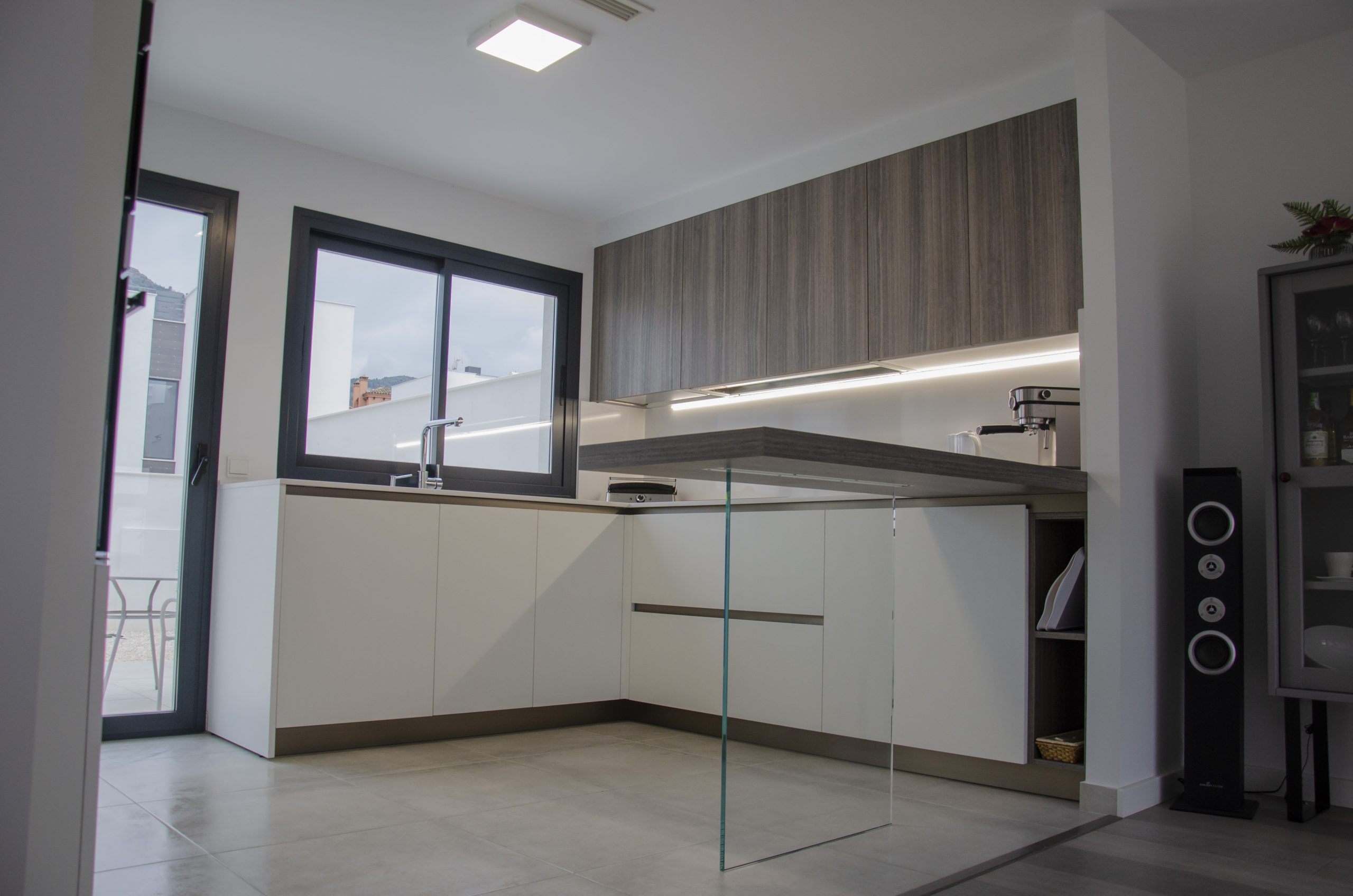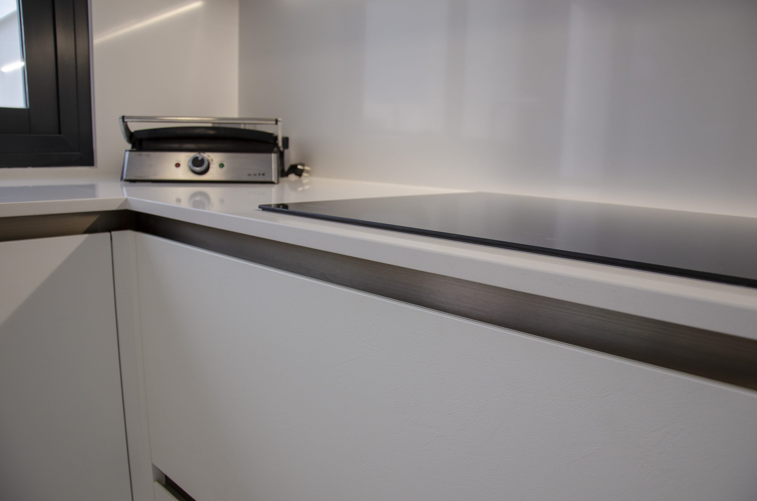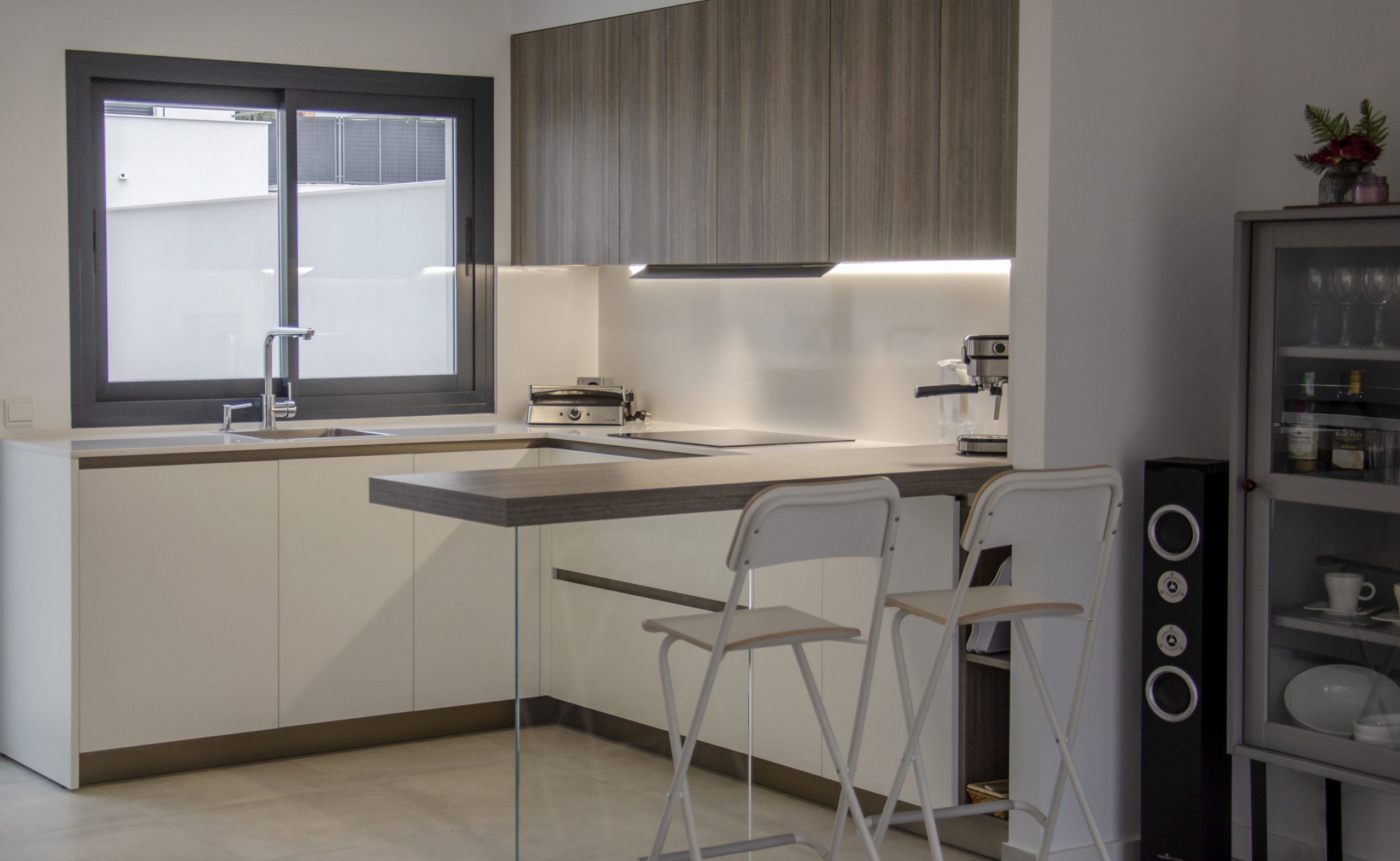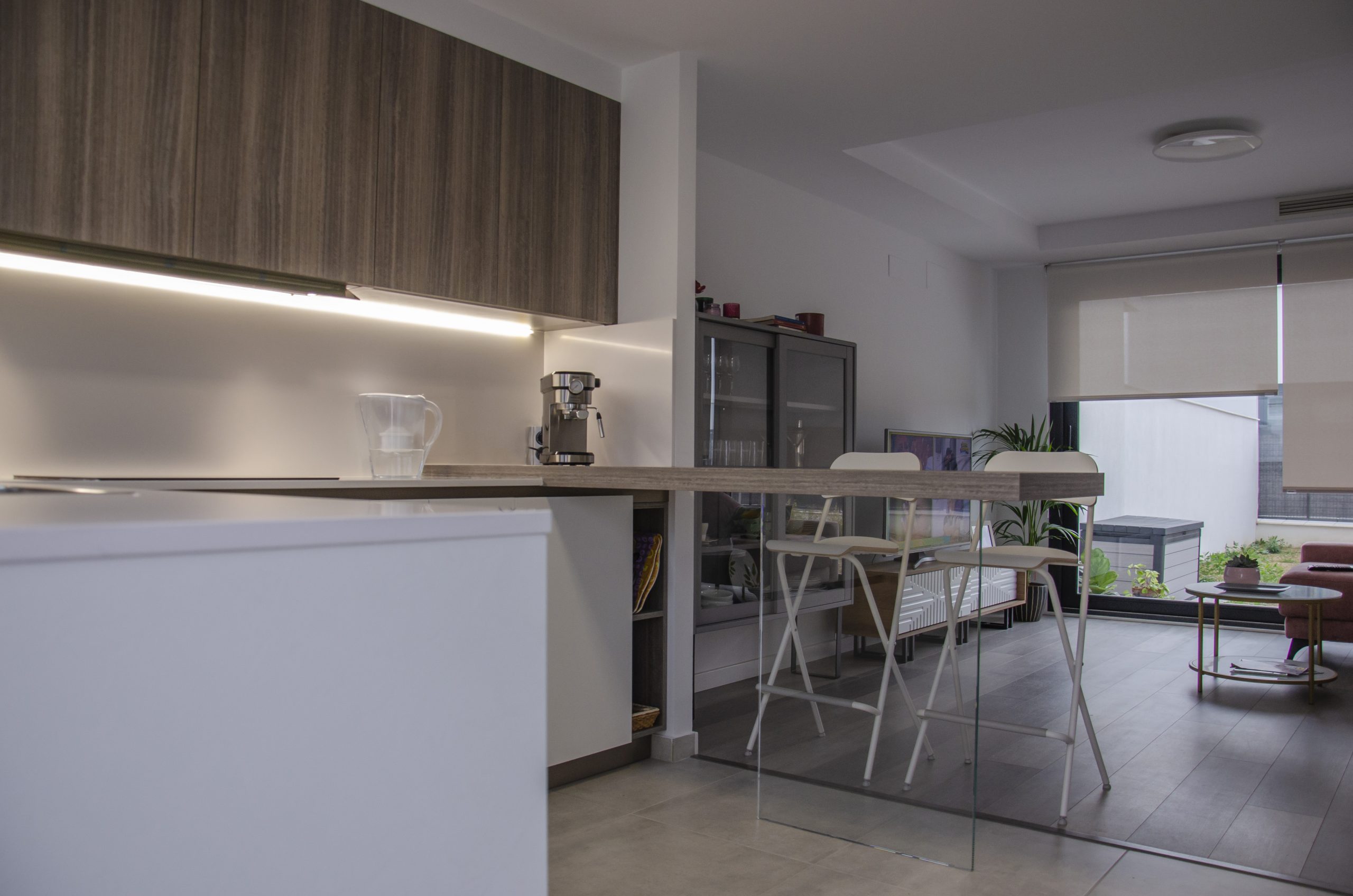 El modelo seleccionado ha sido Ak_Project by Arrital buscando contraste con la puerta Wall 73 y la imitación a madera en acabado termoestructurado. Tanto el zócalo de la cocina como los uñeros se han elegido en el tono champagne que combina muy bien con toda la composición. Para la encimera se ha elegido de Silestone el modelo Miami White en 2 cm de grosor, también recubriendo la trasera de la zona de cocción para evitar salpicaduras y facilitar su limpieza diaria. Tenemos una barra de desayunos bastante amplia imitando a madera a juego con los muebles altos, destacamos sin duda la «pata» de cristal que la sostiene que aporta elegancia y no entorpece la visión del resto de la estancia haciendo mucho más ligera la composición.