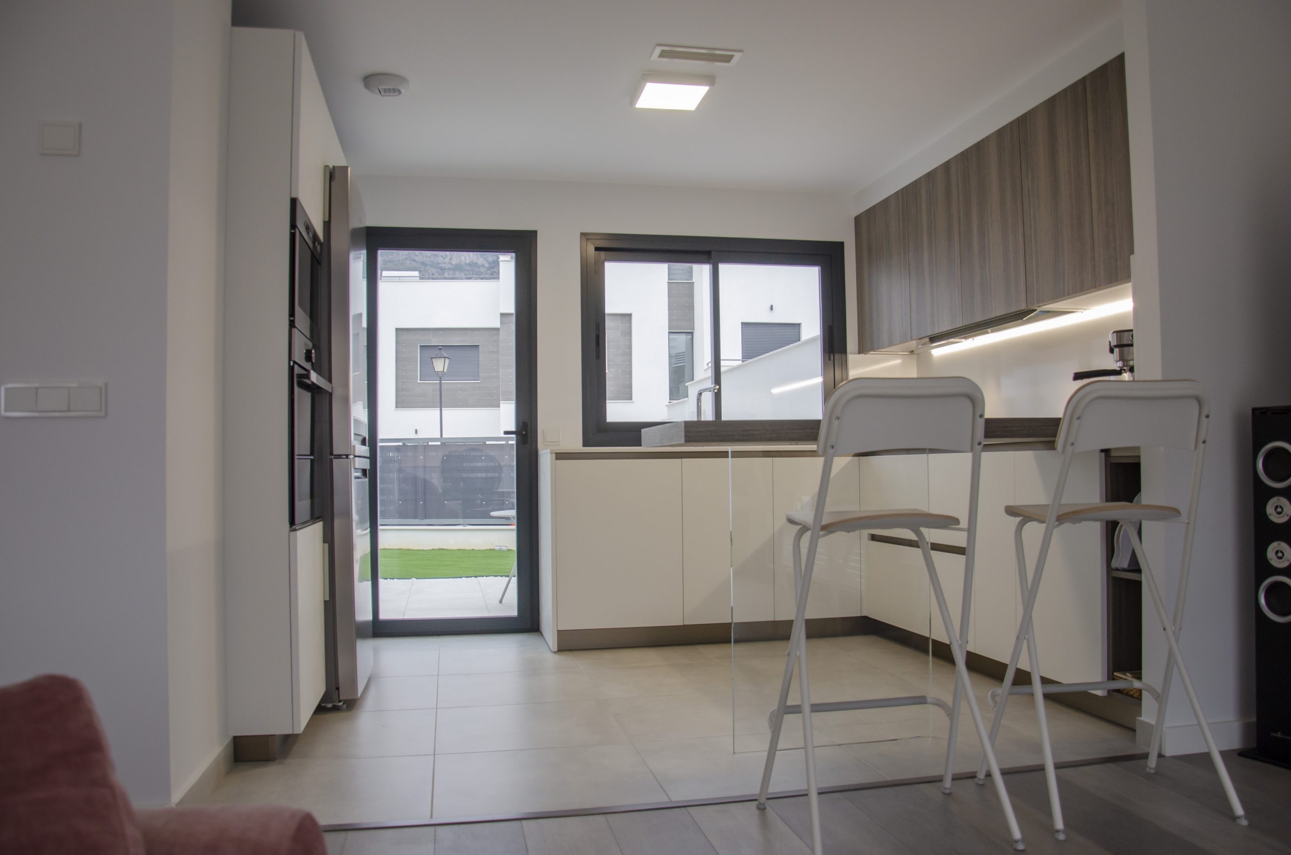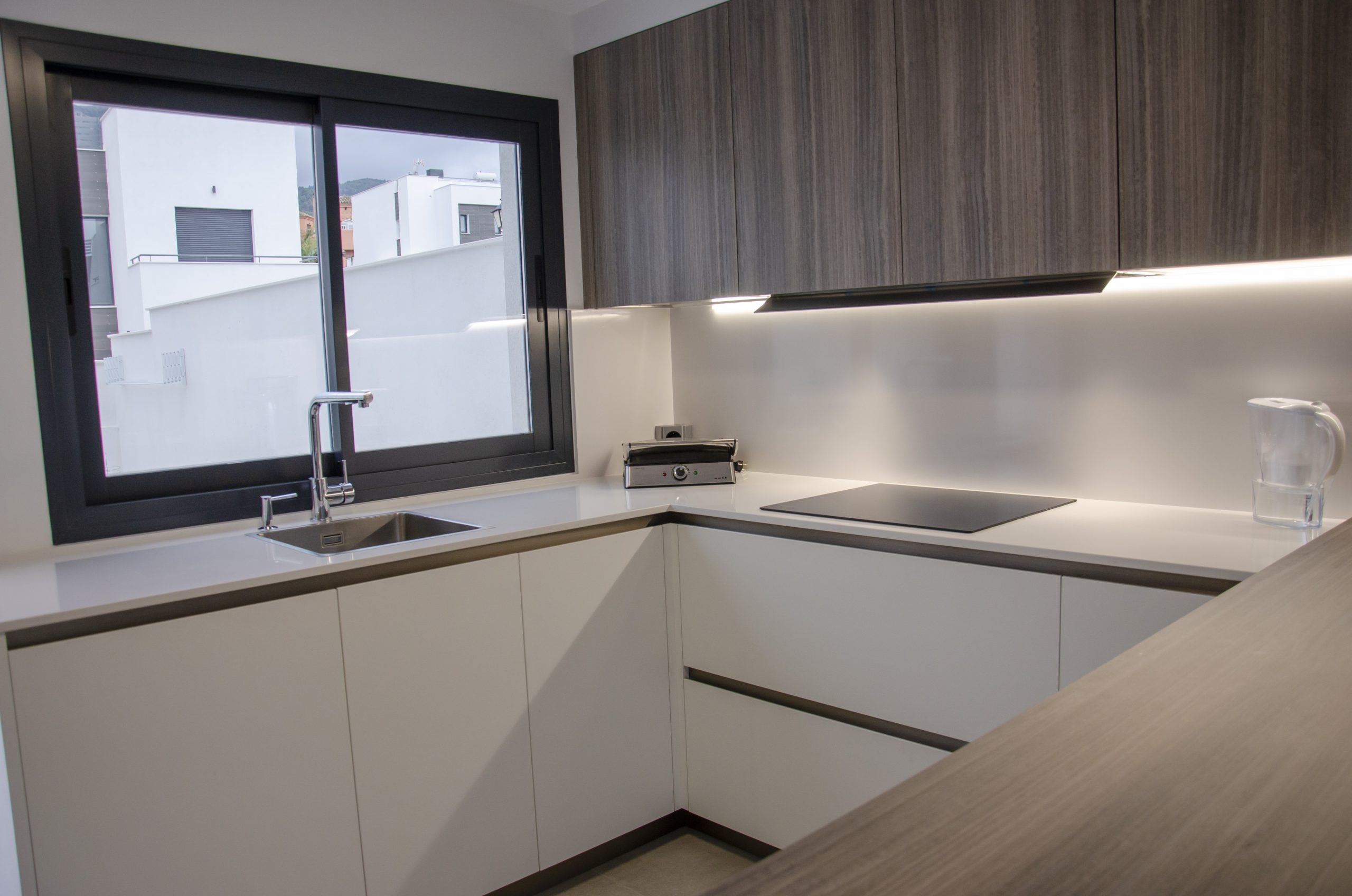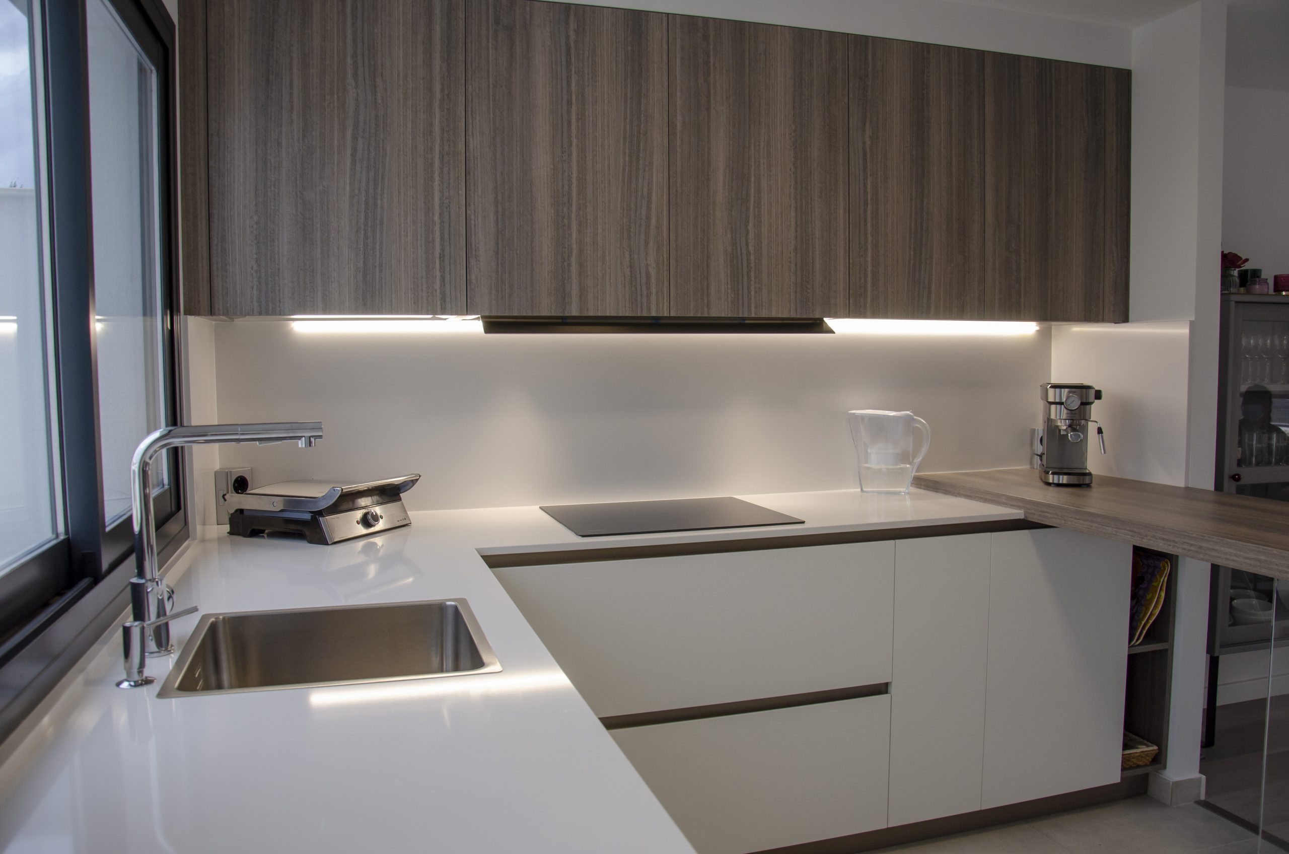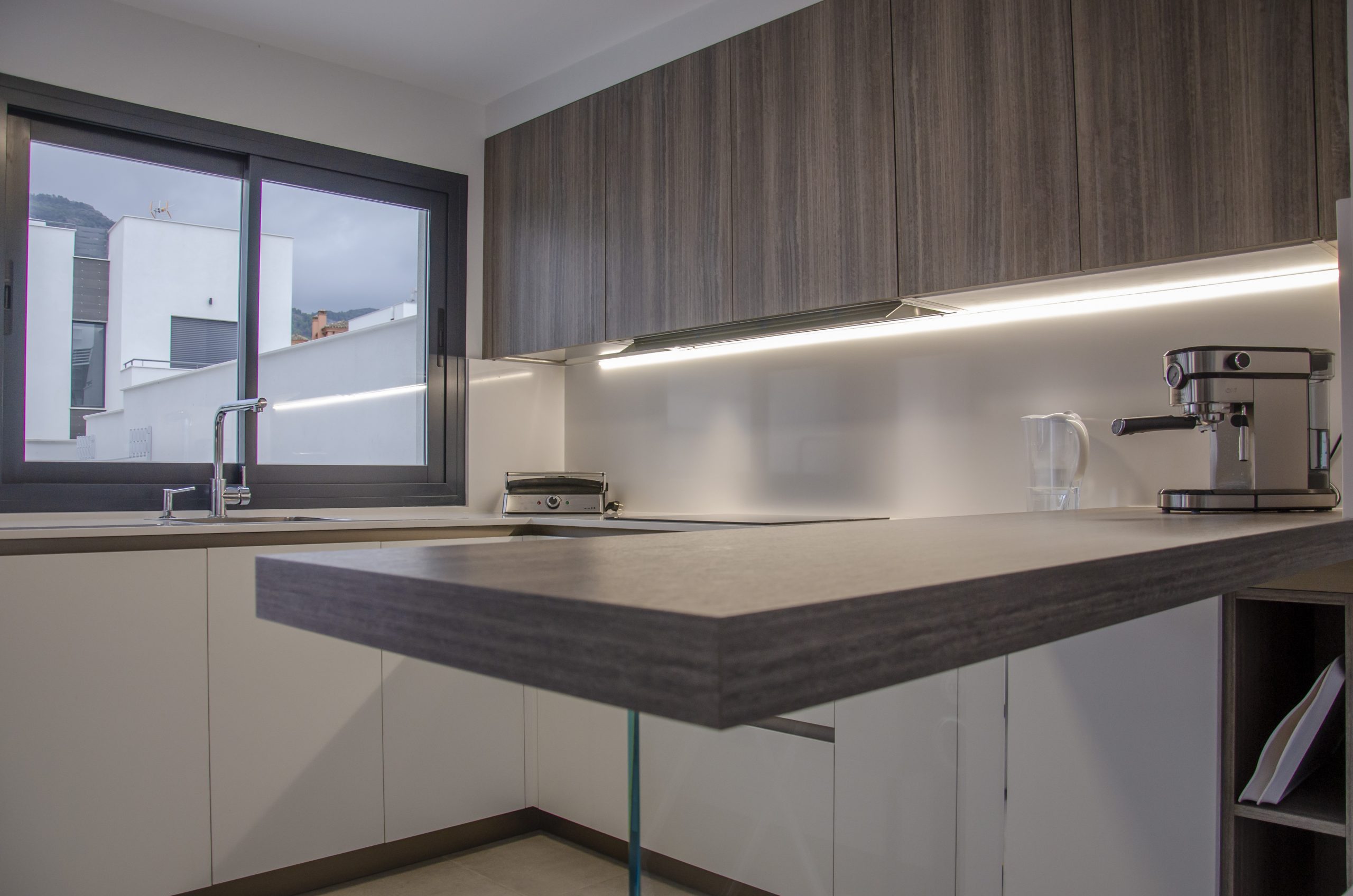 El modelo seleccionado ha sido Ak_Project by Arrital buscando contraste con la puerta Wall 73 y la imitación a madera en acabado termoestructurado. Tanto el zócalo de la cocina como los uñeros se han elegido en el tono champagne que combina muy bien con toda la composición. Para la encimera se ha elegido de Silestone el modelo Miami White en 2 cm de grosor, también recubriendo la trasera de la zona de cocción para evitar salpicaduras y facilitar su limpieza diaria. Tenemos una barra de desayunos bastante amplia imitando a madera a juego con los muebles altos, destacamos sin duda la «pata» de cristal que la sostiene que aporta elegancia y no entorpece la visión del resto de la estancia haciendo mucho más ligera la composición.