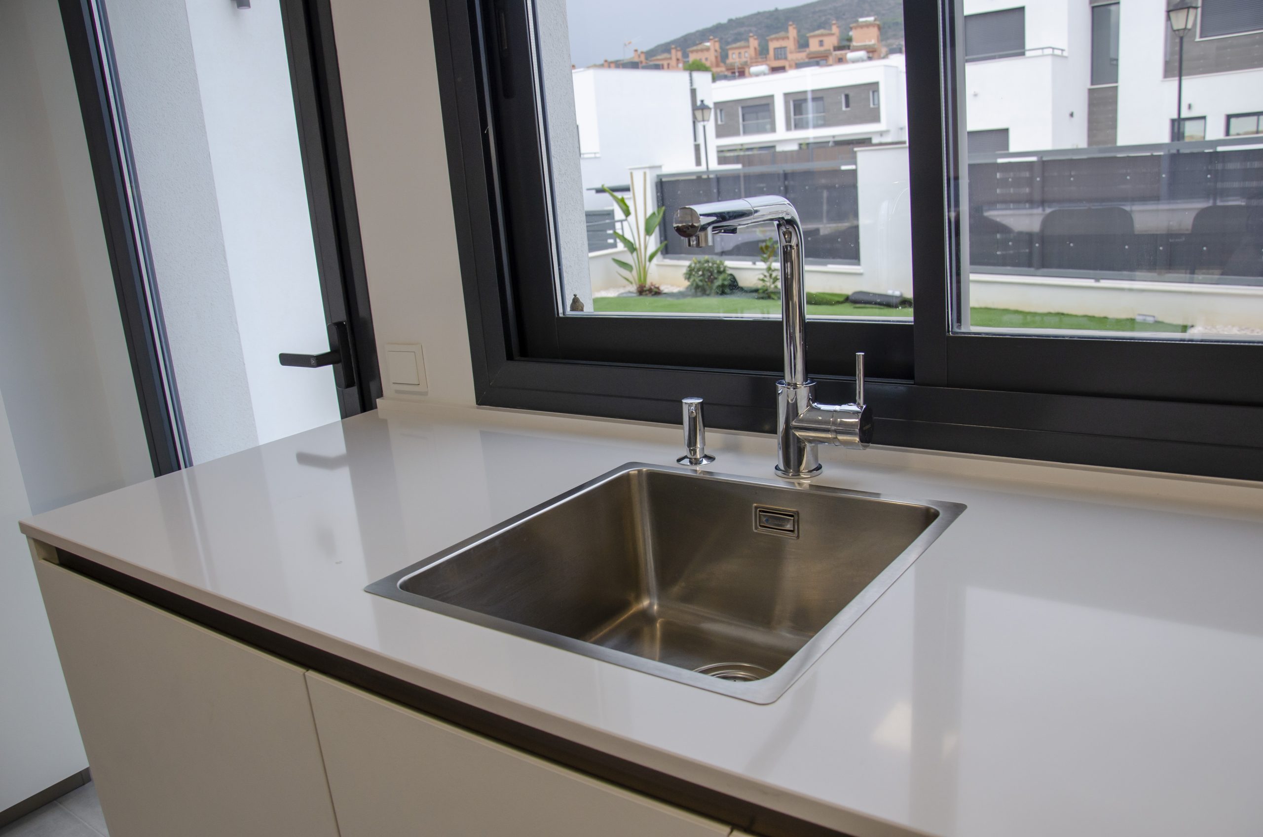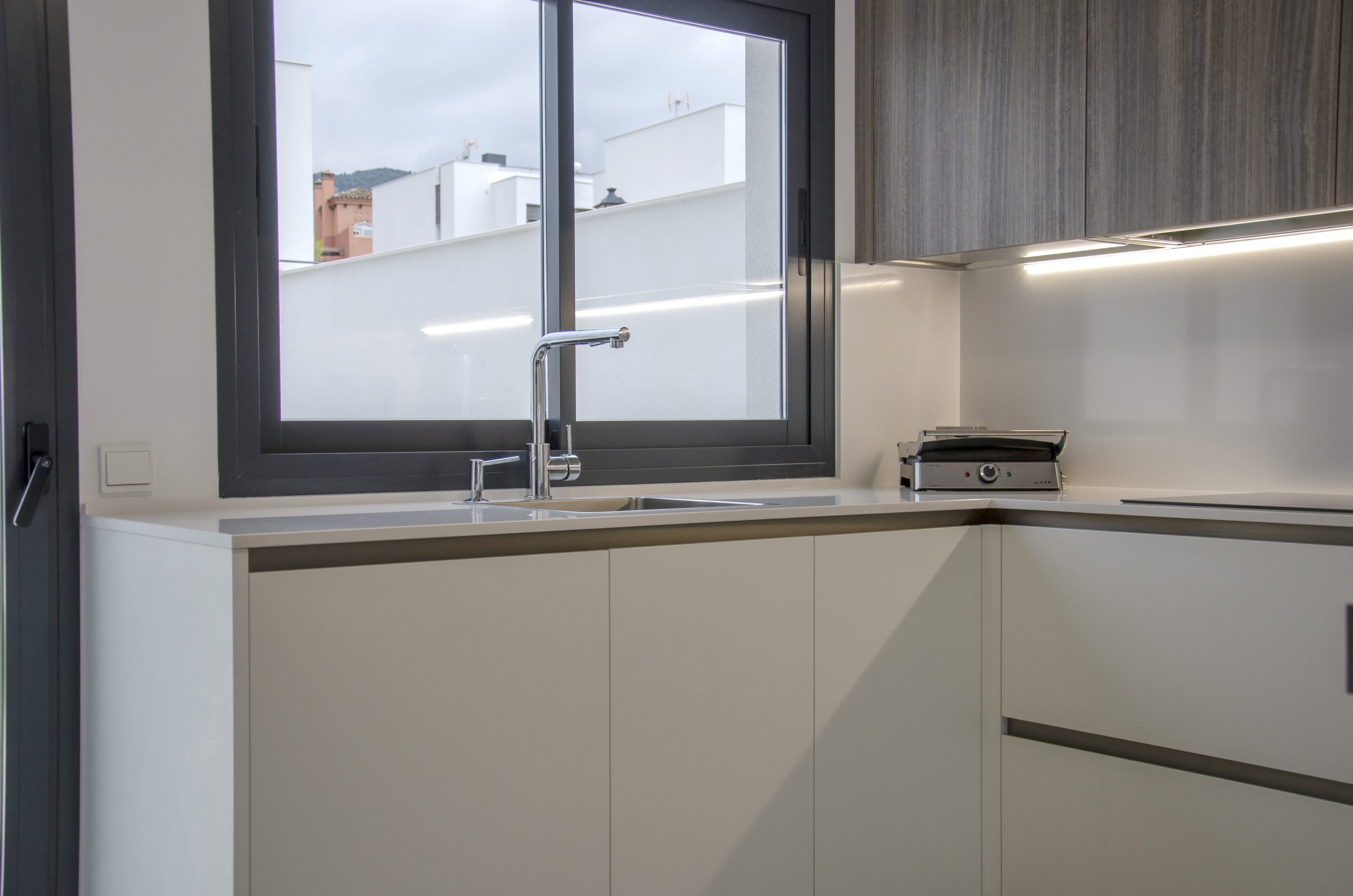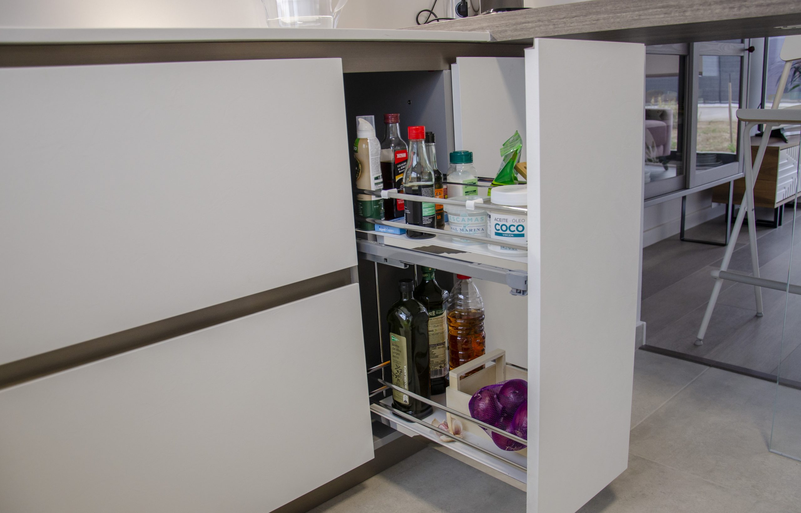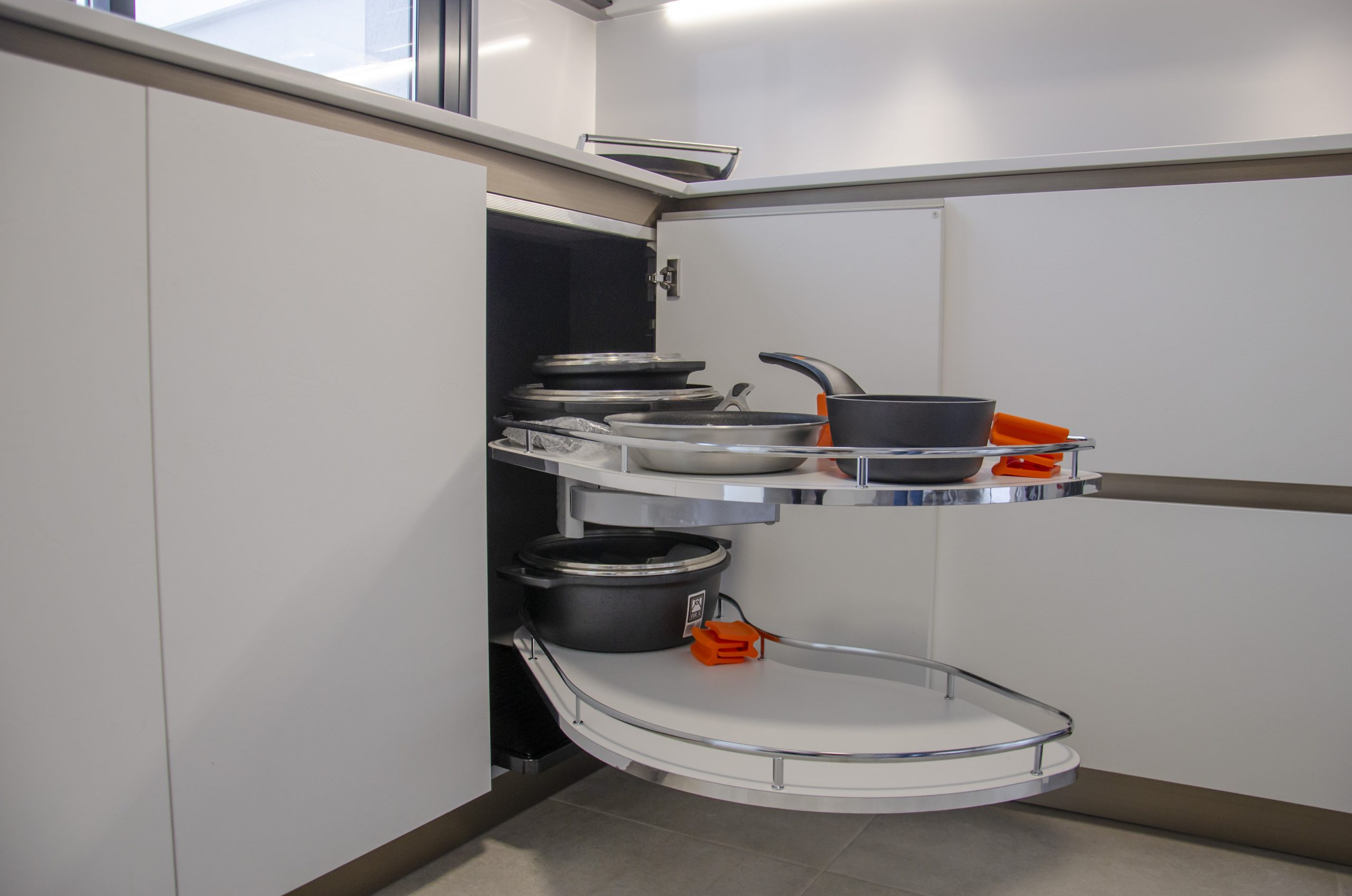 Esta cocina se encuentra llena de accesorios que marcan la diferencia, como el cómodo dosificador de jabón cromado de Dake o un escurridor auxiliar de la misma marca. También tenemos el fregadero en acero inoxidable de Veravent junto con el grifo Seul extraíble y en acabado cromo. Para la iluminación contamos con barras de leds bajo los muebles que proporcionan un confort extra a la hora de trabajar en la encimera además de aportar ambiente, estos son de la casa Cucine Oggi junto con una barra de enchufes Energy Box en aluminio colocada en la esquina. En los interiores vemos que cuentan con un práctico especiero así como un sistema de extracción muy cómodo para aprovechar al cien por cien la esquina del mueble.