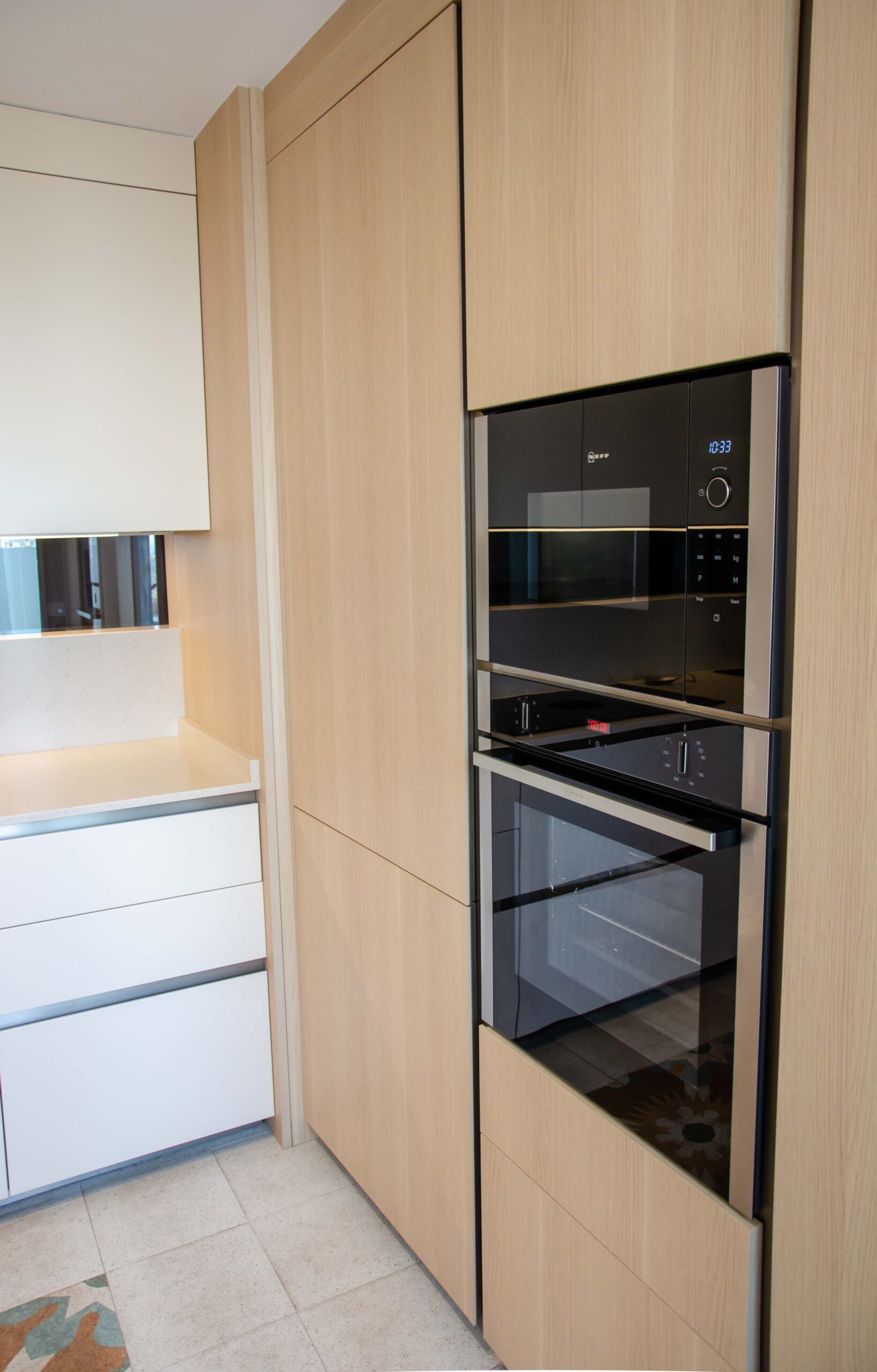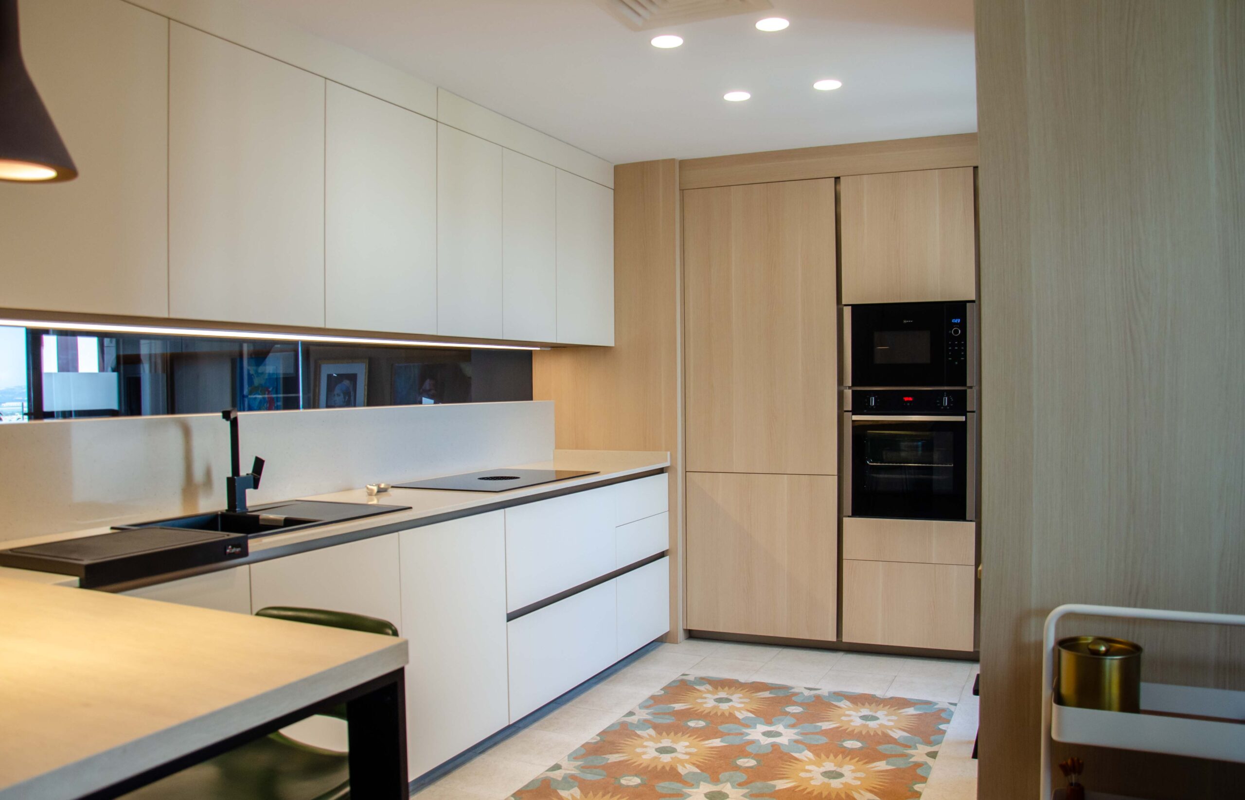 Lo primero que encontramos a la vista es la columna de horno (B1ACC2HN0) y microondas (HLAWD23N), ambos de Neff en acabado cristal negro. El resto de los electrodomésticos se encuentran integrados en los muebles para evitar el ruido visual. Por ejemplo el lavavajillas integrable (S175ECX12E) de Neff y el frigorífico combinado (SP40801) de Whirpool.