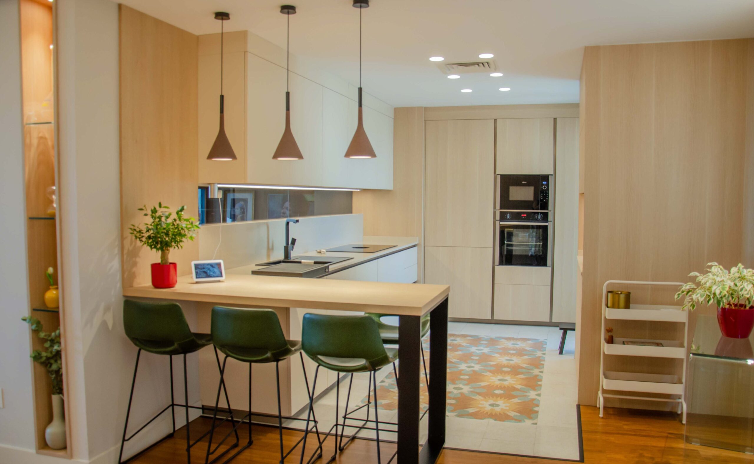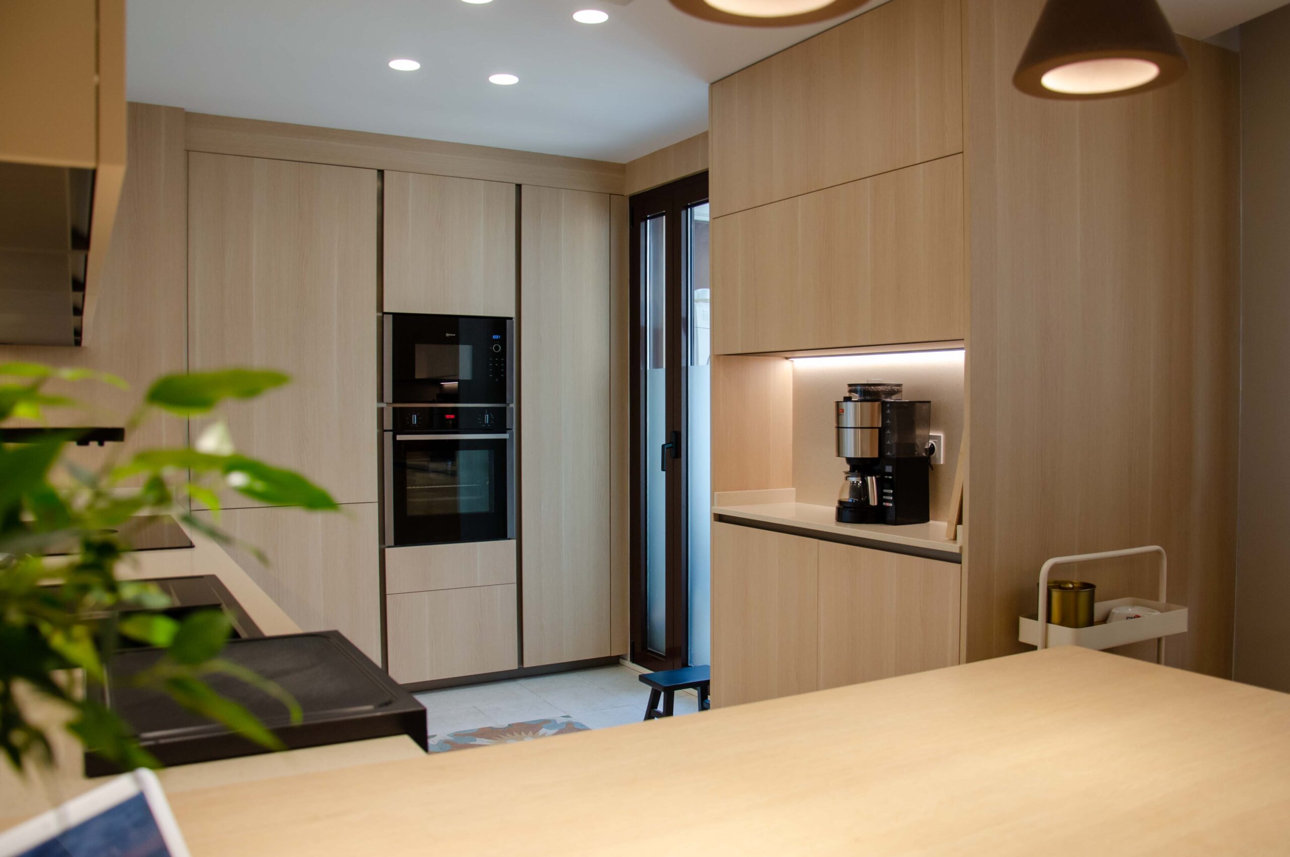 Para la barra se ha elegido una encimera de la casa Baido en color roble natural en laminado HPL, cuyas siglas significan en su traducción laminado decorativo de alta presión. Se trata de un panel formado por capas de fibras de celulosa impregnadas de resinas termoendurecedoras, sometidas a un proceso de alta presión que consiste en aplicar simultáneamente calor y presión. Gracias a este proceso, se consigue un material de altas prestaciones para un ambiente como el de la cocina.