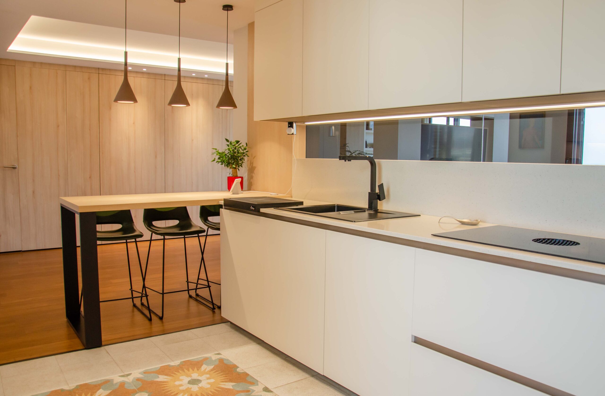 También encontramos un mueble desayunador y distintos accesorios de la marca Cuccine Oggi como las tiras de iluminación led, la tabla de corte, los cubos de basura extraíbles i el cubertero en el modelo fusion.