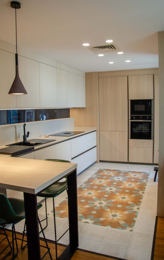 El modelo seleccionado para este proyecto es Ak_Project de Arrital en diferentes acabados y colores. Por un lado tenemos una imitación a madera en termoestructurado con el canto «step» en color sésamo, combinado con un lacado sand en blanco crema. Para la encimera se ha elegido un Silestone en color Blanco Capri en un grosor de 2cm, este tono imita una piedra natural moteada con tonos beige. Este mismo material se ha utilizado para la trasera de la zona de aguas y la zona de cocción.