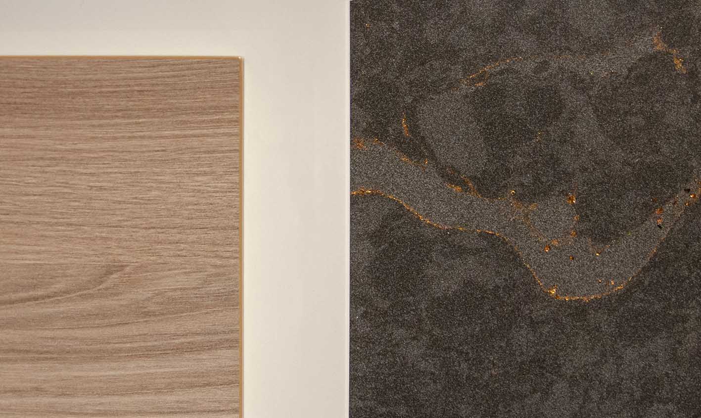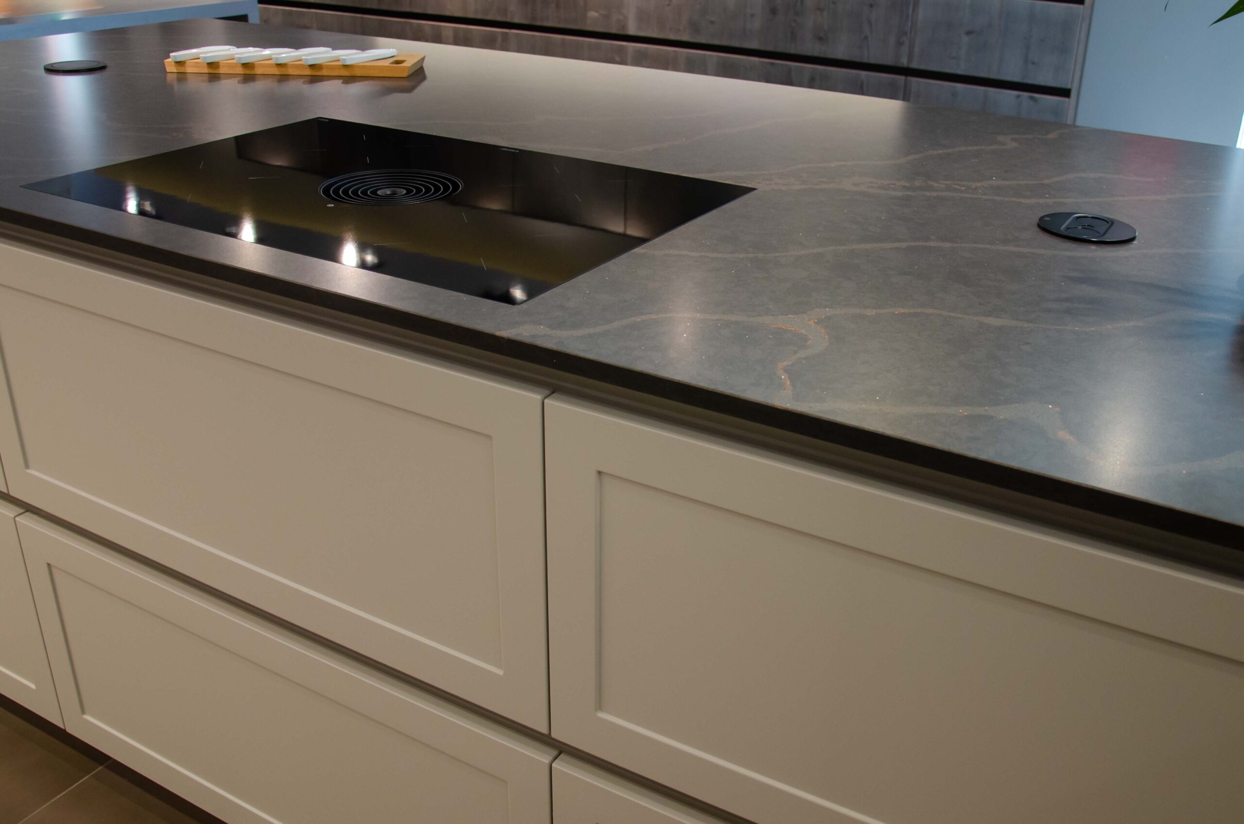 La espectacular encimera es de Cosentino. En esta ocasión tenemos un Silestone mate de la nueva colección Le Chic en el acabado Bohemian Flame. Esta encimera cuenta con destellos sobre un fondo gris ceniza recorrido por vetas incrustadas en tonos metalizados. Su inspiración se halla en el lado más explosivo de la naturaleza: los volcanes y sus sinuosas coladas.
