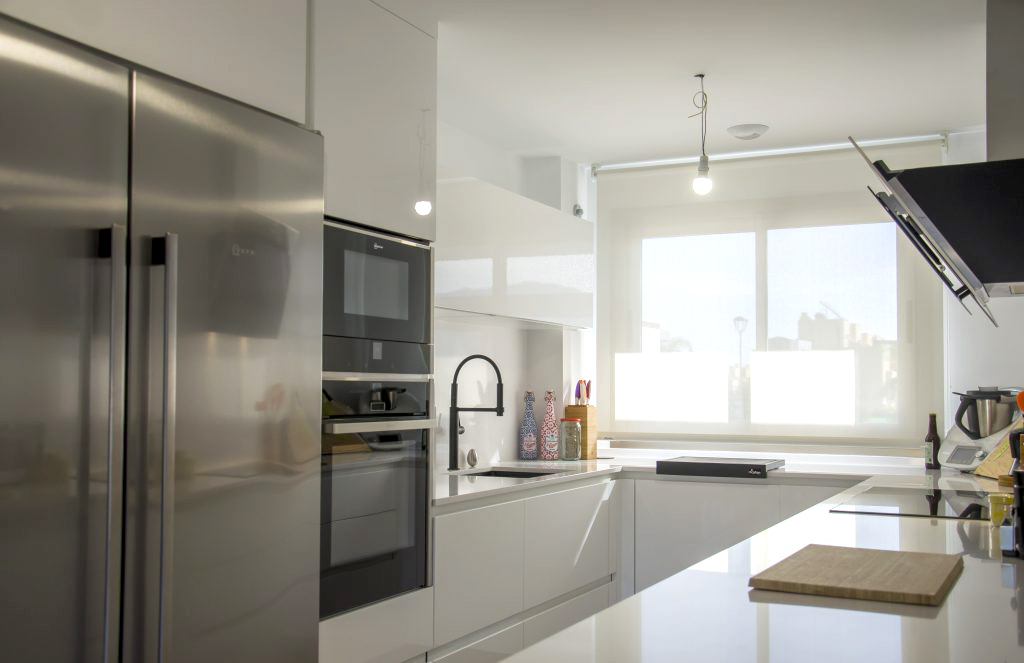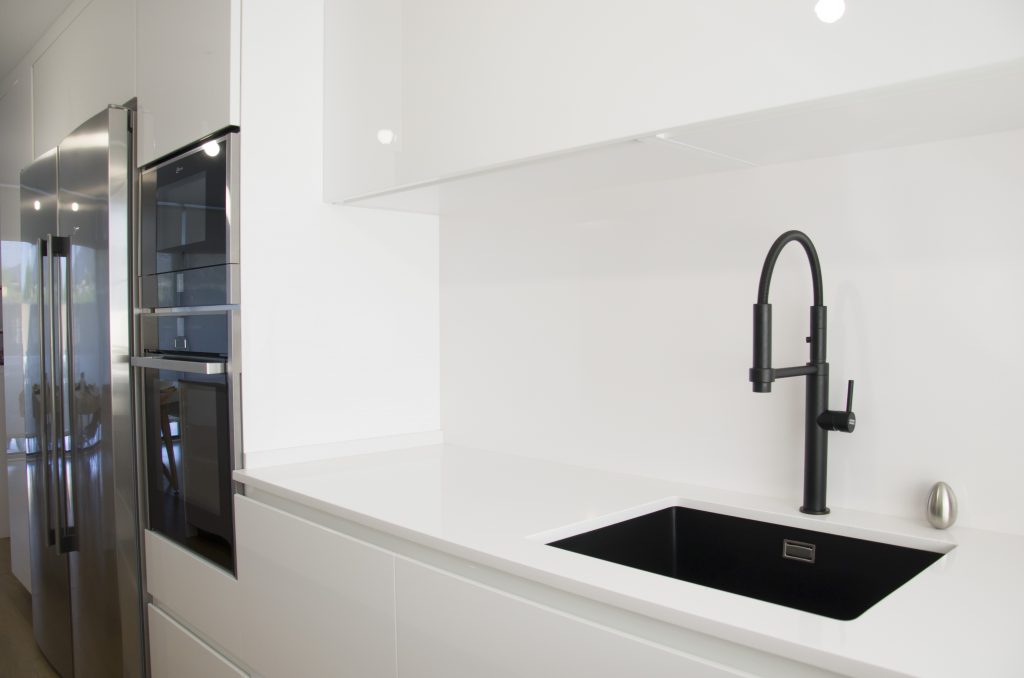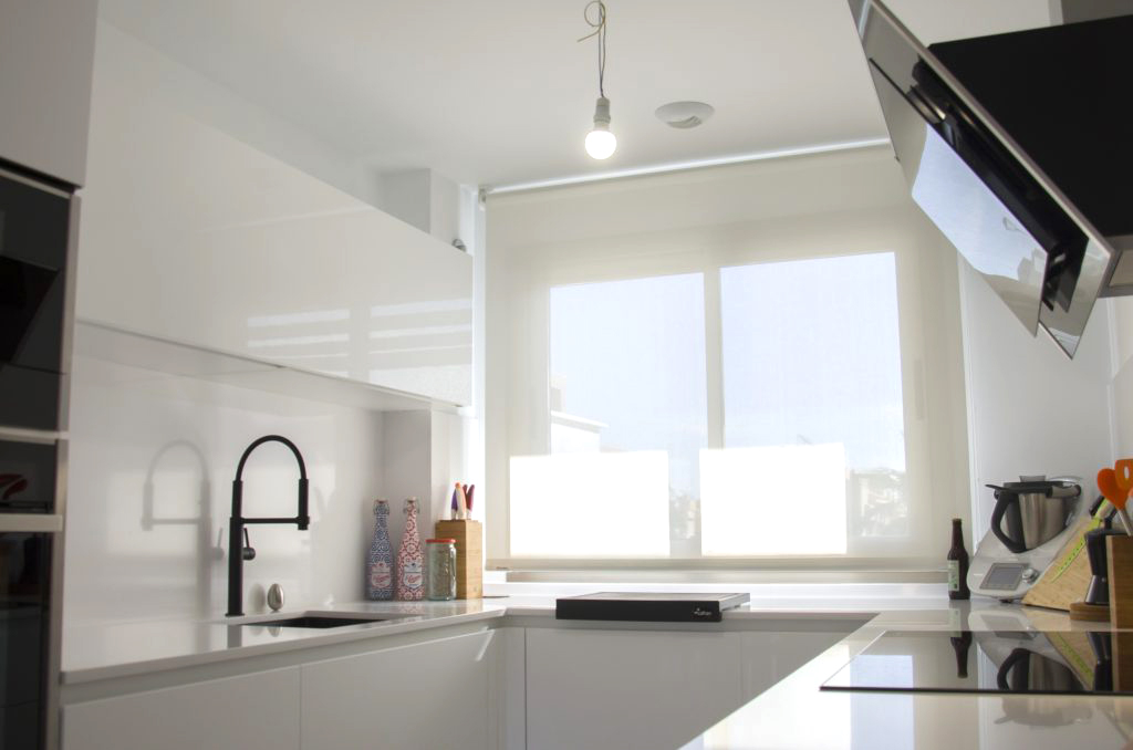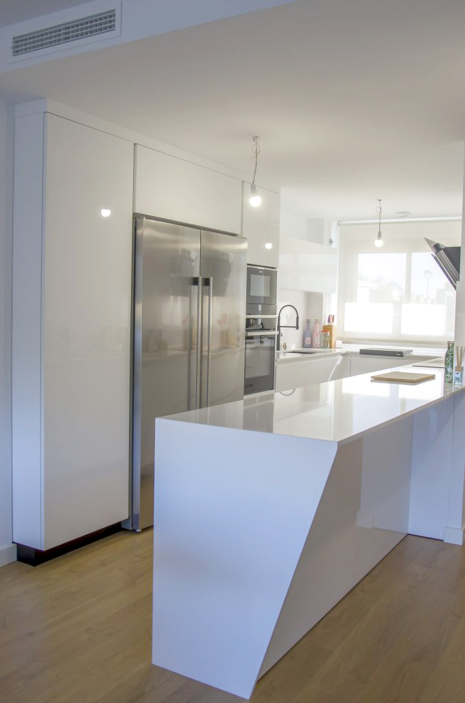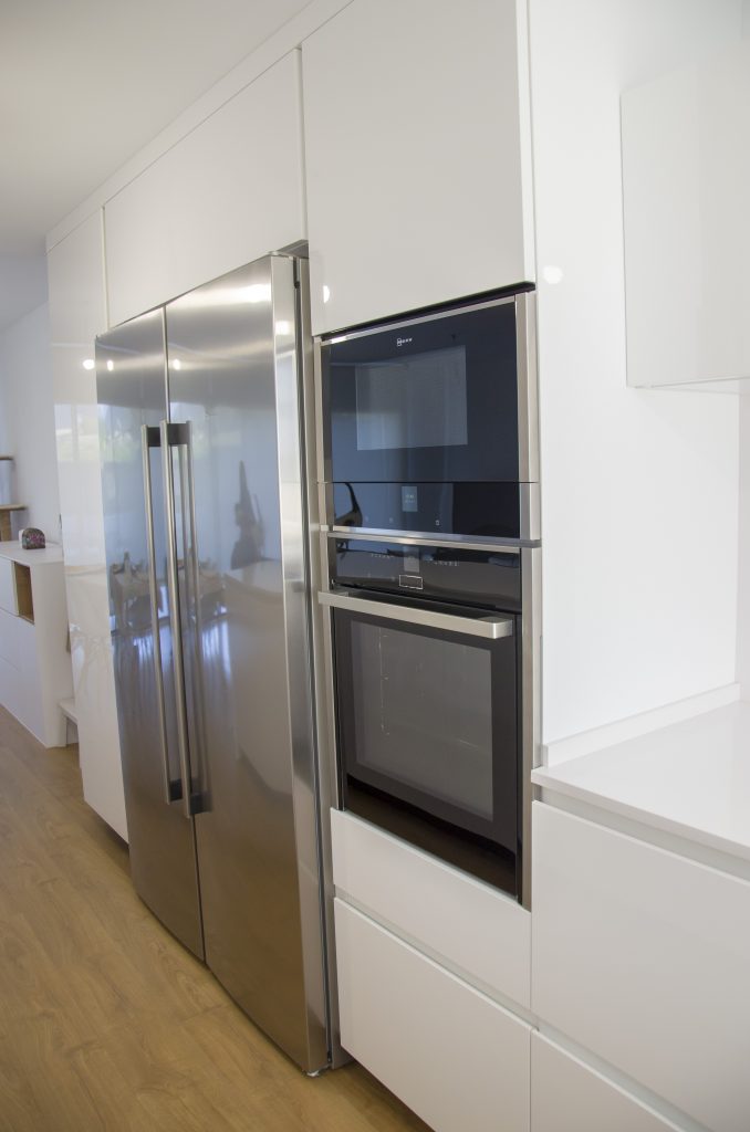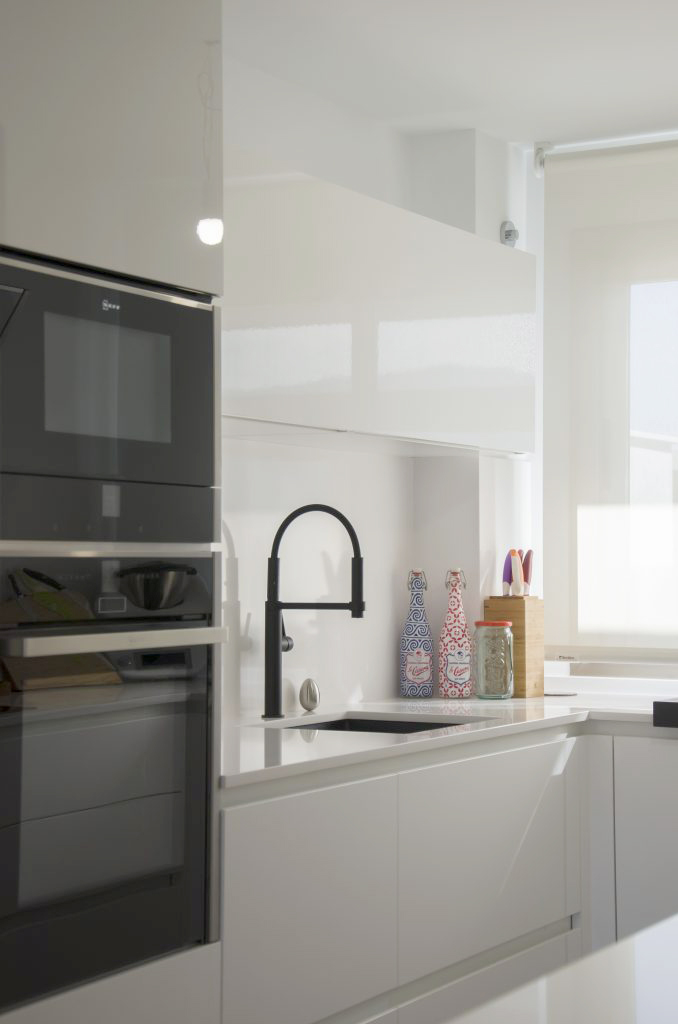 El mobiliario que se ha seleccionado es el modelo Ak_Project de nuestro fabricante Arrital en el acabado Tecnolux blanco brillo con uñero en el modelo canto «Step». Este modelo además de ser uno de los más competitivos respecto a su calidad/precio, tiene un mantenimiento muy sencillo y proporciona mucha luminosidad a la estancia. Esto junto con la combinación de electrodomésticos de la marca Neff consiguen que la cocina esté espectacularmente equipada y a la vez sea muy práctica. El fregadero de Shock modelo Greenwich N-100 bajo encimera en color negro junto con el grifo de Franke a juego dan un toque muy interesante creando contrastes sobre la encimera.