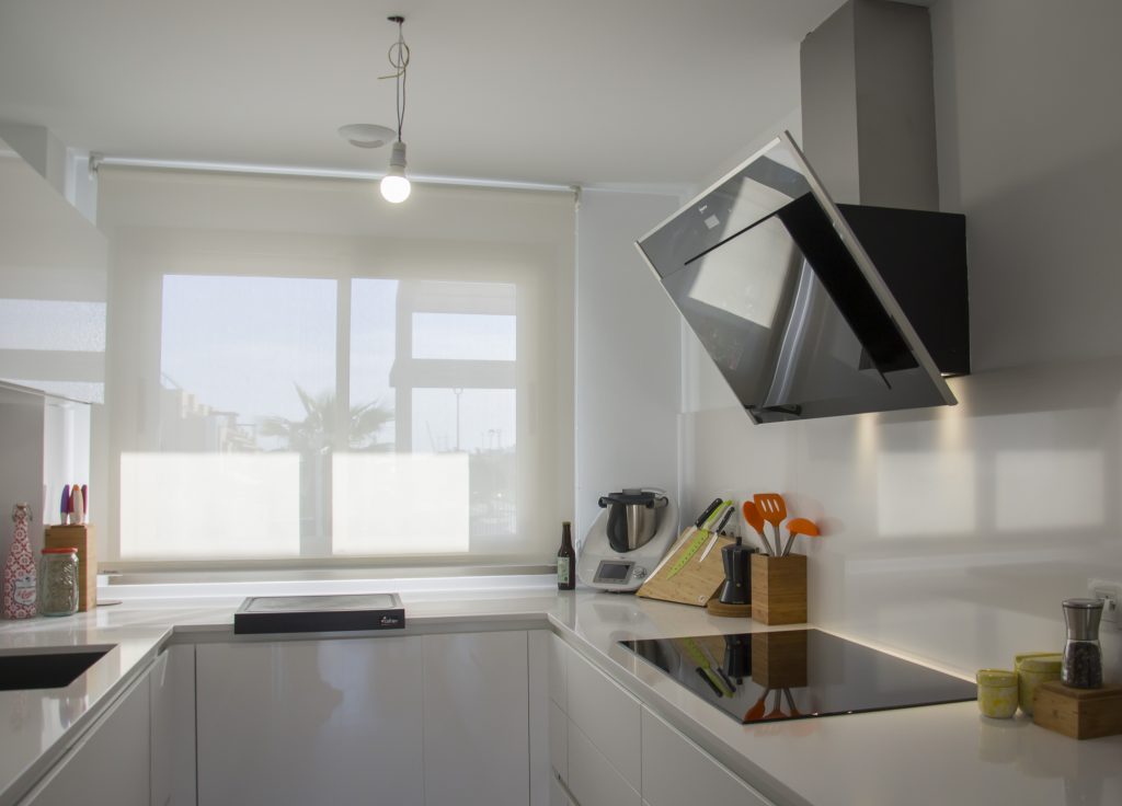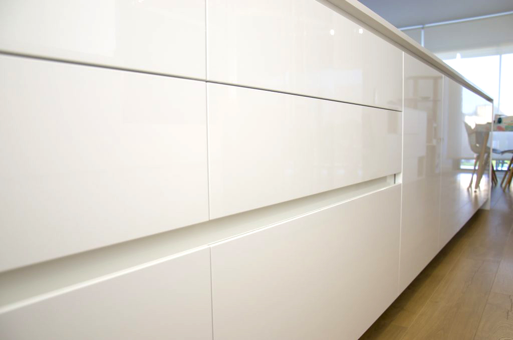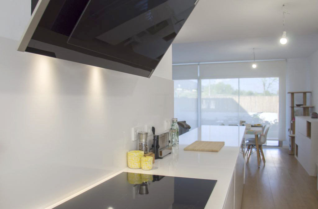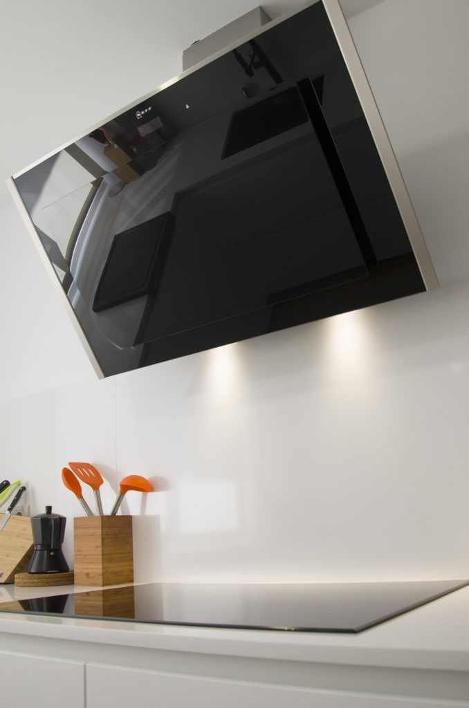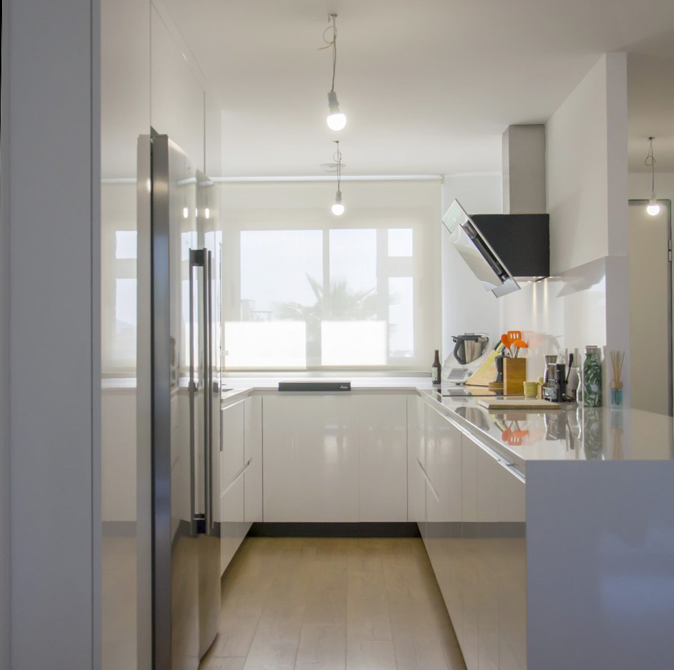 El mobiliario que se ha seleccionado es el modelo Ak_Project de nuestro fabricante Arrital en el acabado Tecnolux blanco brillo con uñero en el modelo canto «Step». Este modelo además de ser uno de los más competitivos respecto a su calidad/precio, tiene un mantenimiento muy sencillo y proporciona mucha luminosidad a la estancia. Esto junto con la combinación de electrodomésticos de la marca Neff consiguen que la cocina esté espectacularmente equipada y a la vez sea muy práctica. El fregadero de Shock modelo Greenwich N-100 bajo encimera en color negro junto con el grifo de Franke a juego dan un toque muy interesante creando contrastes sobre la encimera.