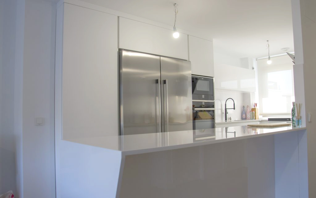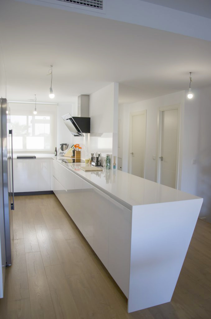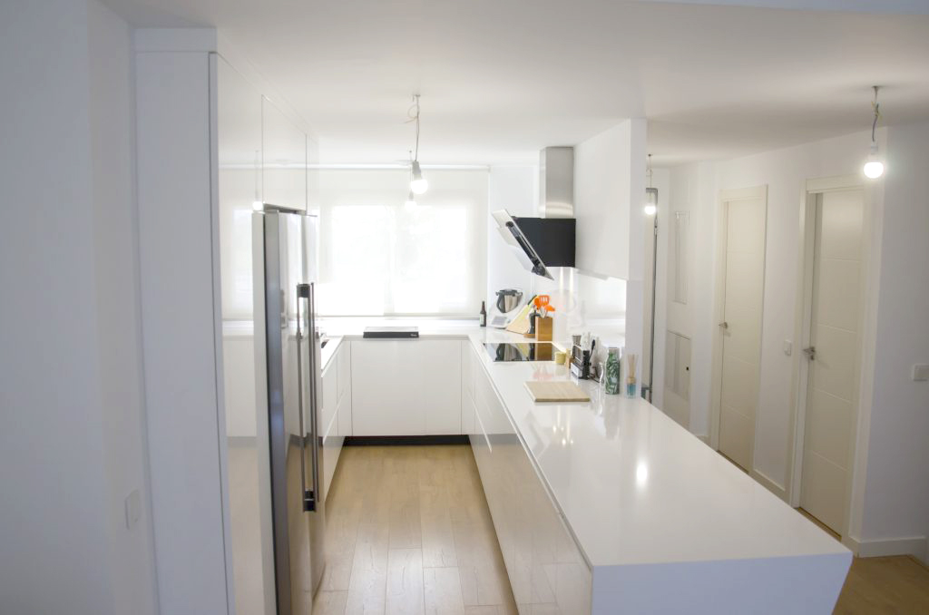 En esta ocasión tenemos un nuevo proyecto de Cafran Cocinas que esperamos os guste tanto como a nosotros. Se trata de una cocina de concepto abierto que comparte espacio único con el comedor y el salón. Destacamos la impresionante península en Silestone Blanco Zeus que alberga mucho espacio de almacenaje así como una barra con capacidad de hasta cuatro comensales.