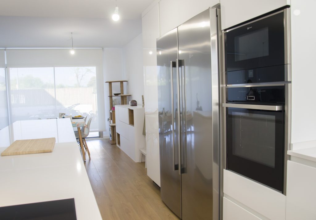 Los electrodomésticos también en color negro son de Neff, una combinación espectacular por el acabado blanco brillo y el cristal negro. Por un lado tenemos la inducción de 80 cms modelo T58UD10X0 con tecnología flexinducción, la flexinducción se trata de un espacio versátil en nuestra placa que nos va a permitir calentar recipientes de distintos tamaños, incluyendo los rectangulares. En columna tenemos un horno modelo B57CR22N0 de Neff con sistema pirolítico y sistema de apertura Slide and Hide, se trata de una puerta abatible escamoteable que facilitará sin duda la apertura del horno y su manipulación. En esta columna tenemos también u el microondas Neff modelo C17GR00N0 que dispone de prestaciones con la última tecnología, como por ejemplo un Display TFT con imágenes a color que proporciona información para el manejo del mismo. La campana decorativa de pared D96IMS1N0 de 90 cms en cristal negro, también de Neff, preside la cocina y además de contener tecnología punta, hace juego con los electrodomésticos en cristal negro creando contrastes. Por último tenemos el conjunto de refrigerador modelo KS8368I3P y el congelador modelo GS7363I3P ambos de Neff pero esta vez en acabado acero inoxidable.