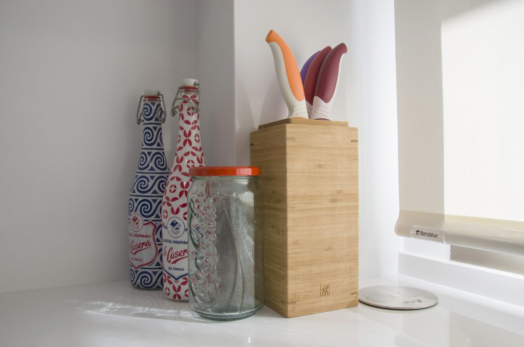 Todo se completa con accesorios de la marca Cucine Oggi como los enchufes encastrados a la encimera, muy útiles para tenerlos siempre a mano. También tenemos la tabla de corte de polipropileno en color negro a juego con los electrodomésticos y el fregadero, los cubos de basura o el cubertero fusión en combinación con un resistente plástico en blanco transparente y aluminio.