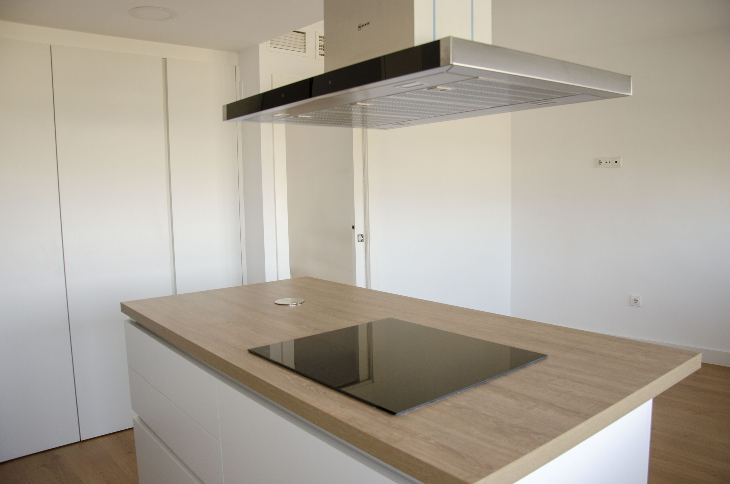 Esta cocina a pesar de verse tan limpia y minimalista tiene una sorpresa oculta: se ha realizado un pequeño lavadero aprovechando una esquina de la cocina y así tanto la lavadora, la secadora como los productos de limpieza quedan ocultos dentro de un mueble, pero están siempre a mano. También el hecho de introducir dentro de un mueble la lavadora y la secadora restará ruidos molestos cuando se encuentre en funcionamiento, ya que amortigua el sonido. Por otro lado, la encimera es de HPL en acabado imitación a madera. La gran isla central alberga espacio suficiente para tener la placa vitrocerámica y un amplio espacio de trabajo, así como un enchufe encastrado de acero inoxidable que será muy útil para enchufar pequeños electrodomésticos como la batidora. Como vemos el resultado es una cocina muy limpia por el efecto del color blanco, que siempre nos da una sensación aséptica. A la vez, la imitación a madera nos otorga ese punto de familiaridad y ambiente acogedor.