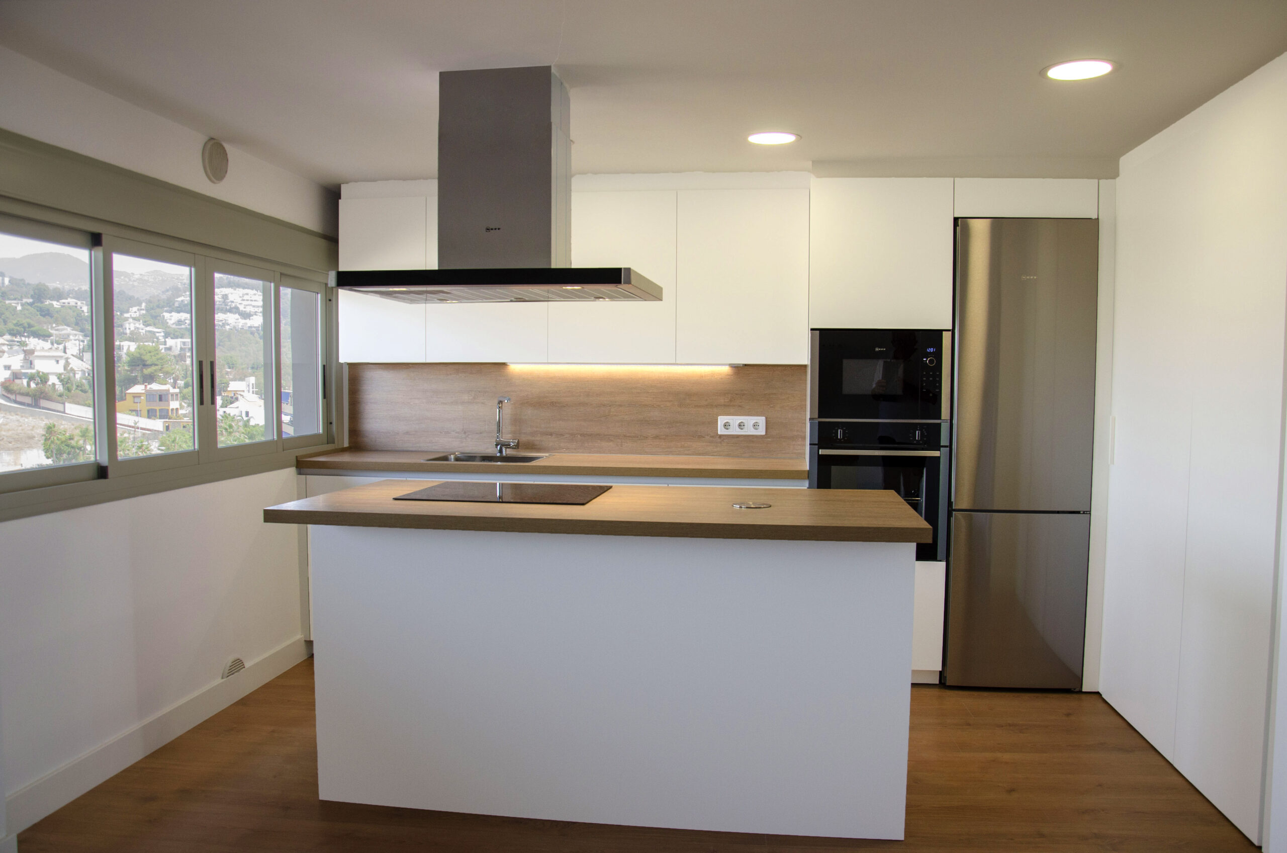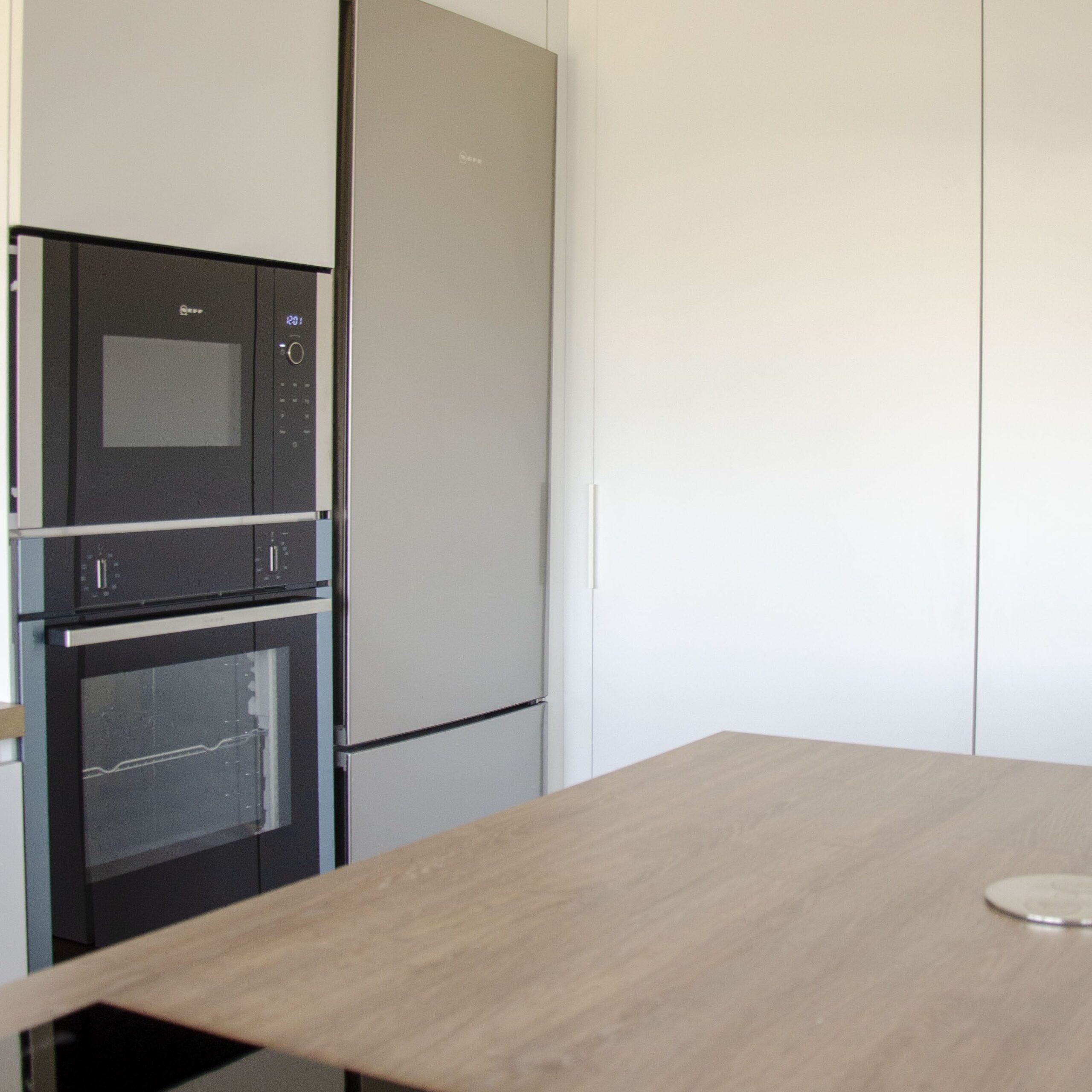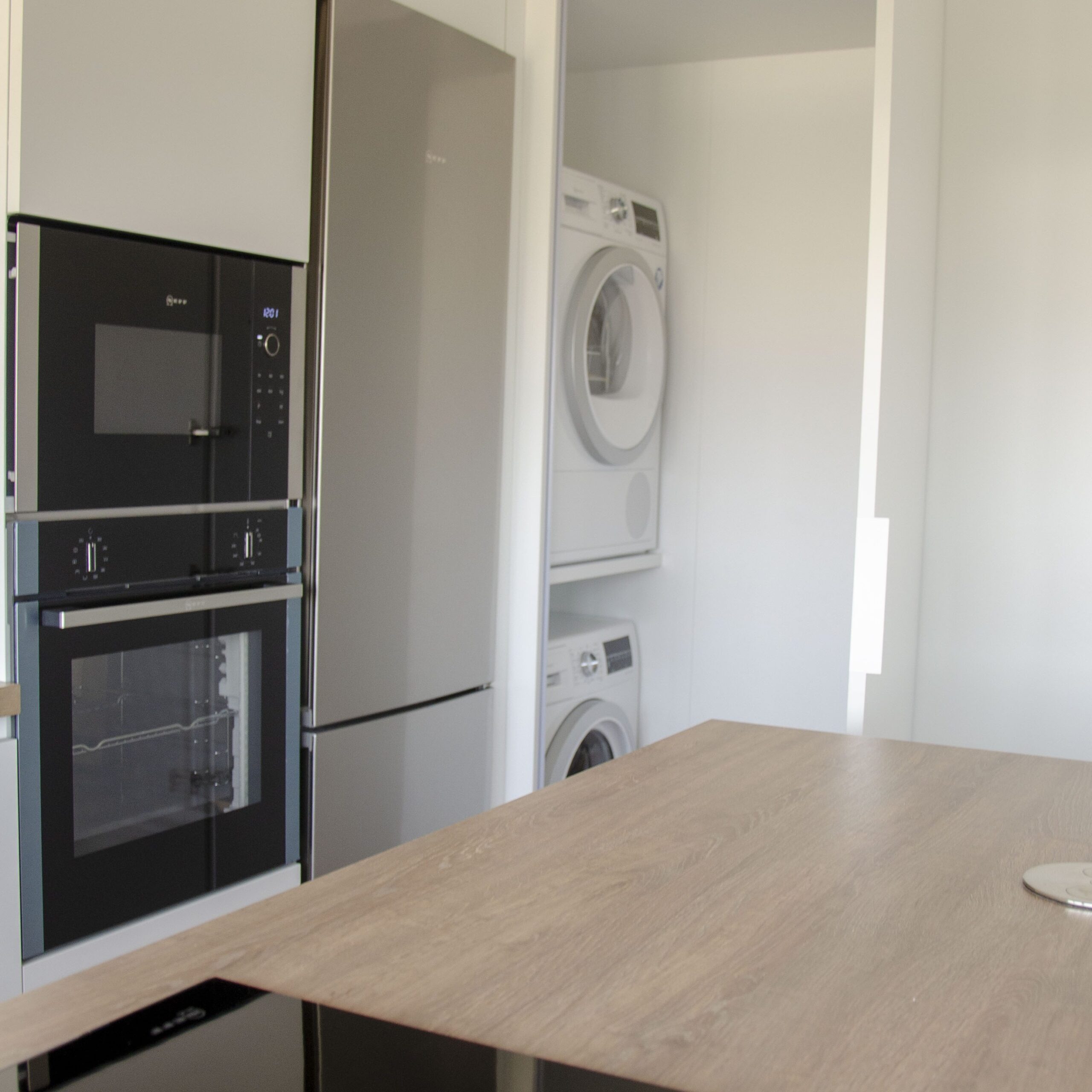 El cliente está contento con la amplitud que ha conseguido en la cocina y la cantidad de luz que se aprovecha debido al frente blanco que ocupa toda una pared y hace las veces de almacenamiento y centro de lavandería oculto. Los electrodomésticos se han elegido de Neff excepto el lavavajillas, que es Siemens. Optamos por integrar el lavavajillas en la composición para no romper con la armonía, sin embargo, el frigorífico no ha sido integrado pero encaja perfectamente, ya que el acero es la combinación perfecta para el blanco y la madera.