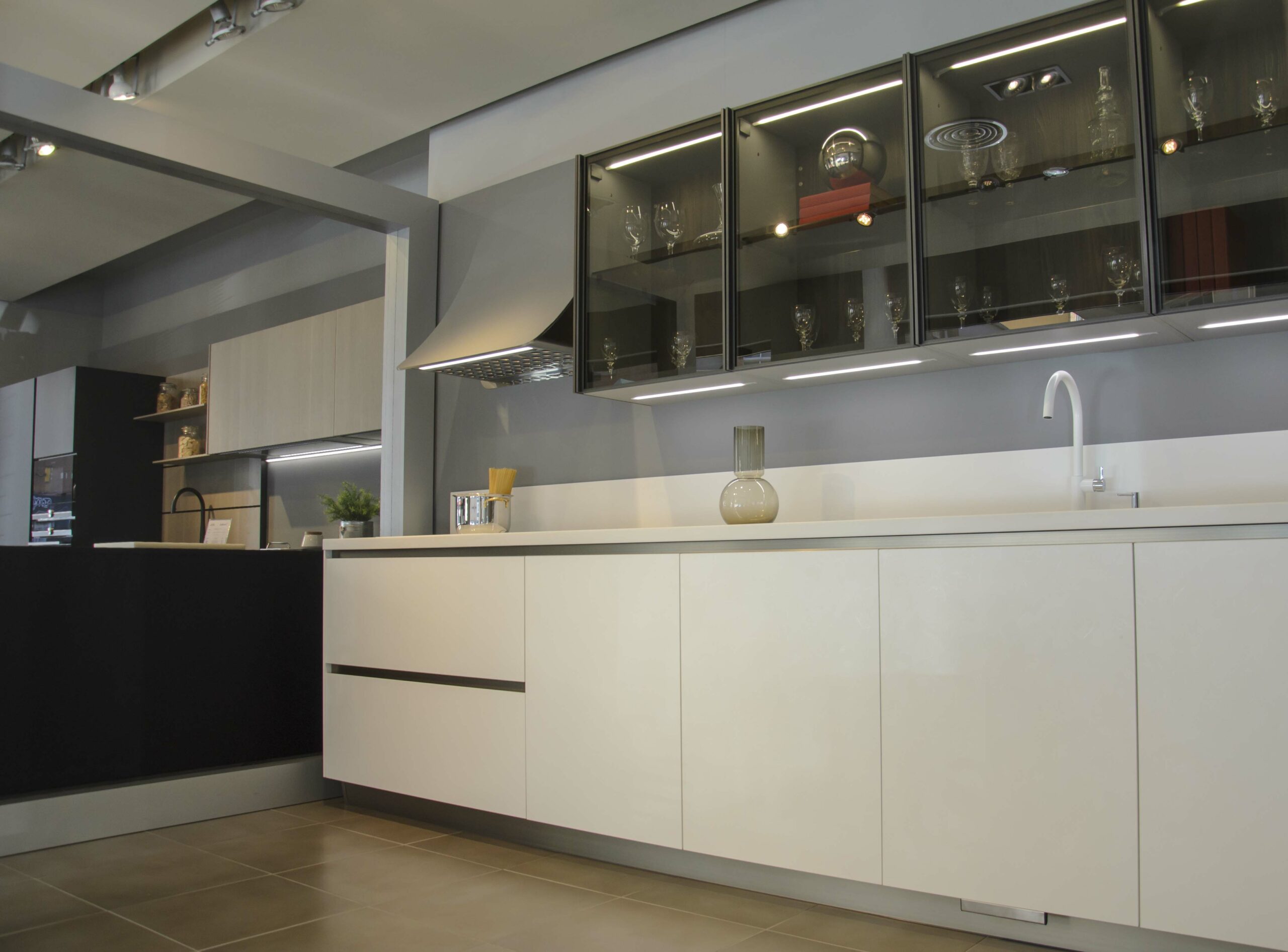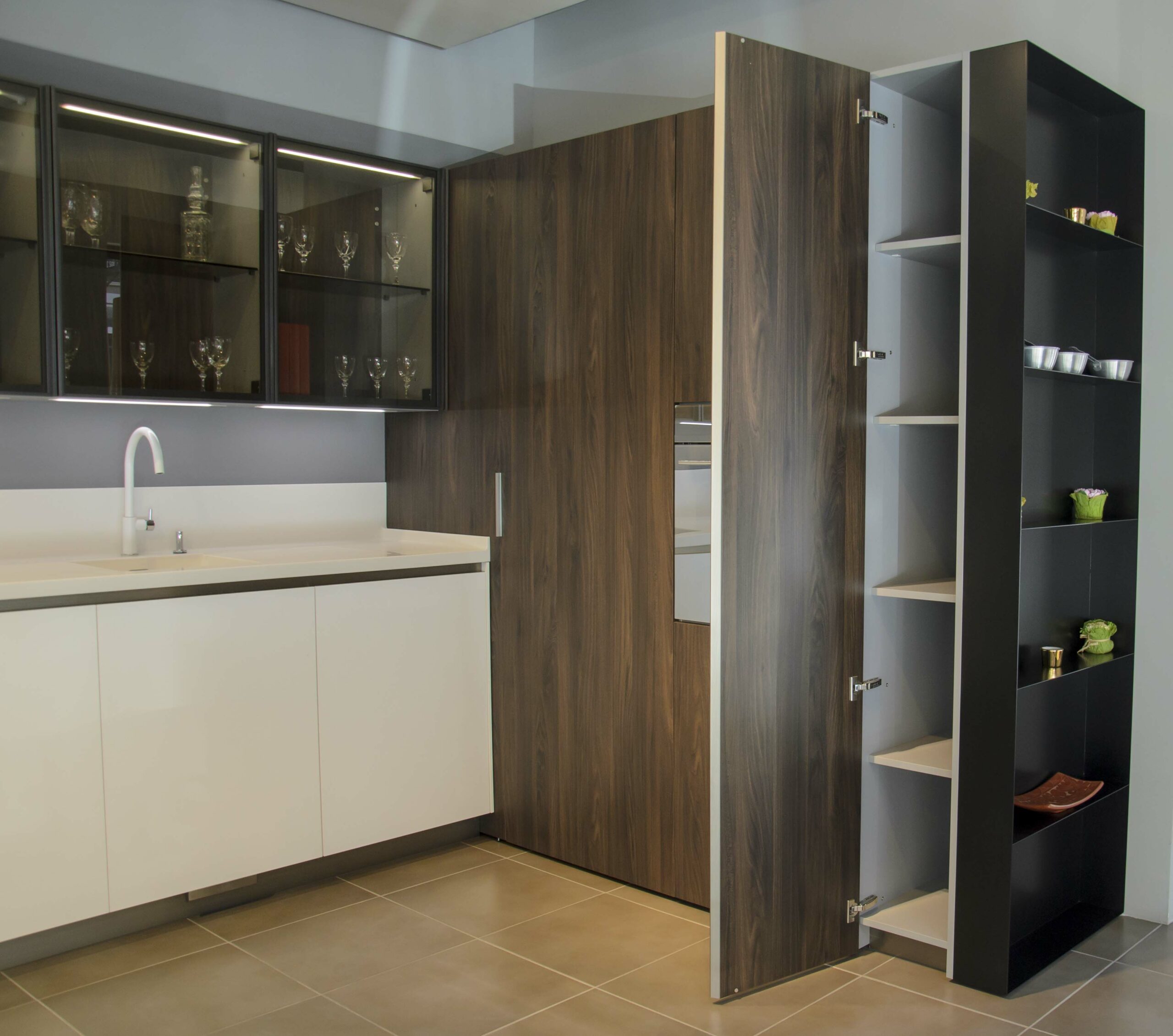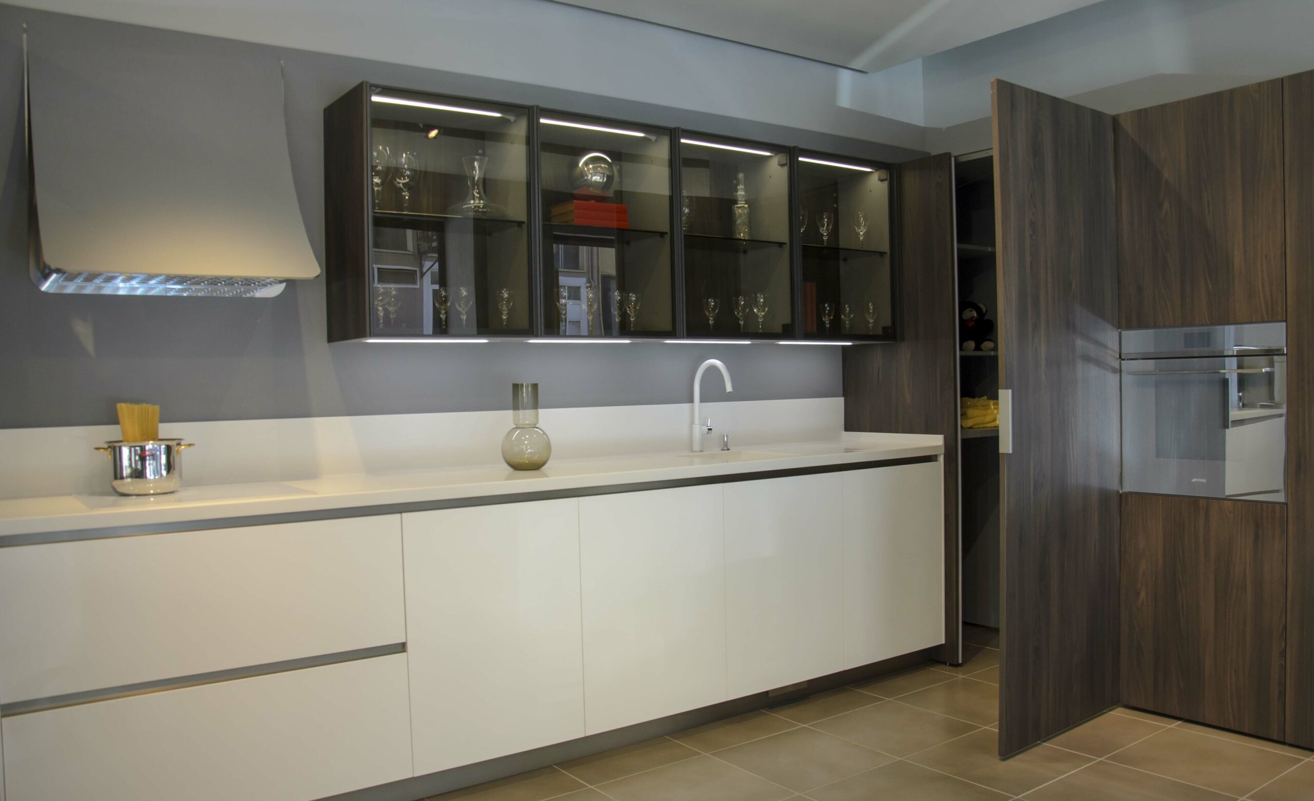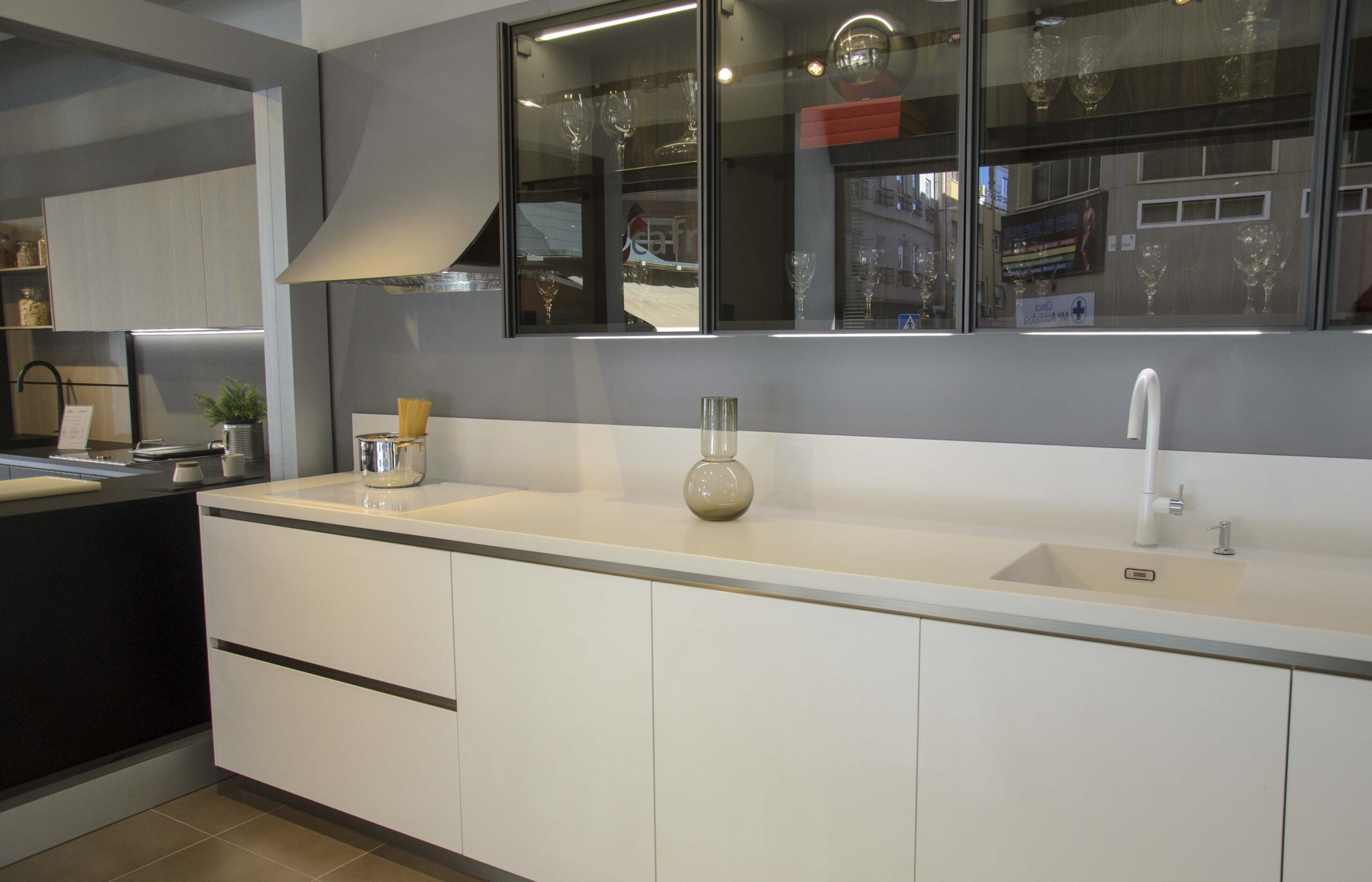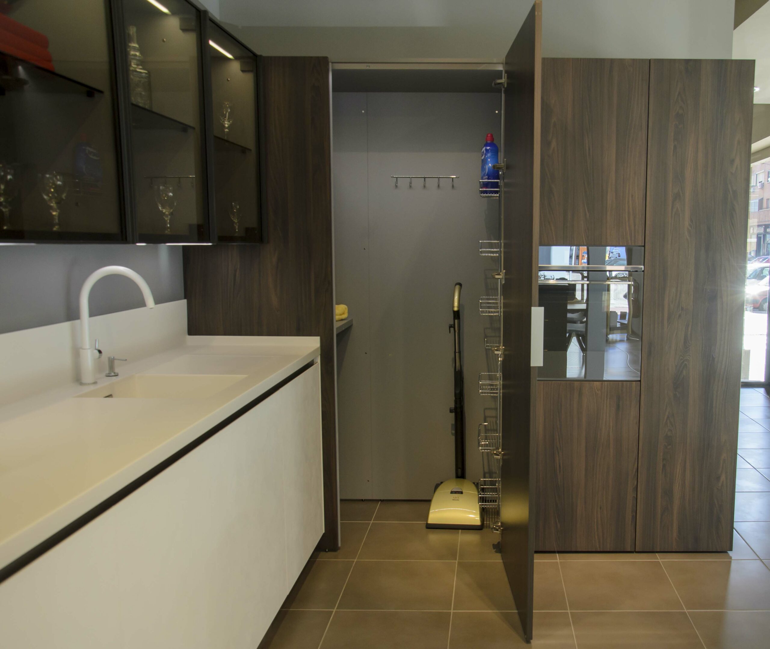 Esta cocina se compone de un mobiliario bicolor, pero ambos en el mismo acabado termoestructurado. Por un lado, tenemos en los muebles bajos las puertas en Wall 73 blanco roto, estas puertas poseen cierta textura que recuerda al yeso. Una solución muy sufrida para la limpieza ya que no se le marcan las huellas, tiene acabado mate y a la vez refleja la luz dando mucha luminosidad y amplitud a la estancia. Por otro lado, para los muebles altos y las columnas se ha seleccionado un acabado color café imitando a madera con vetas marcadas.También cuenta con las exclusivas cristaleras «Gem» de nuestro fabricante, que no sólo proporcionan un espacio extra para almacenamiento, sino que también posee una iluminación interna que resulta muy decorativa.Para la encimera tenemos el material de Franke Solid Surface en 20 cm de espesor, un material no poroso y antibacteriano, compuesto por una mezcla de minerales naturales y resinas acrílicas con múltiples ventajas. Su color blanco se fusiona con las puertas. Esta superficie nos permite integrar en una la misma pieza tanto el fregadero como un escurridor sin interrupciones ni juntas visibles.