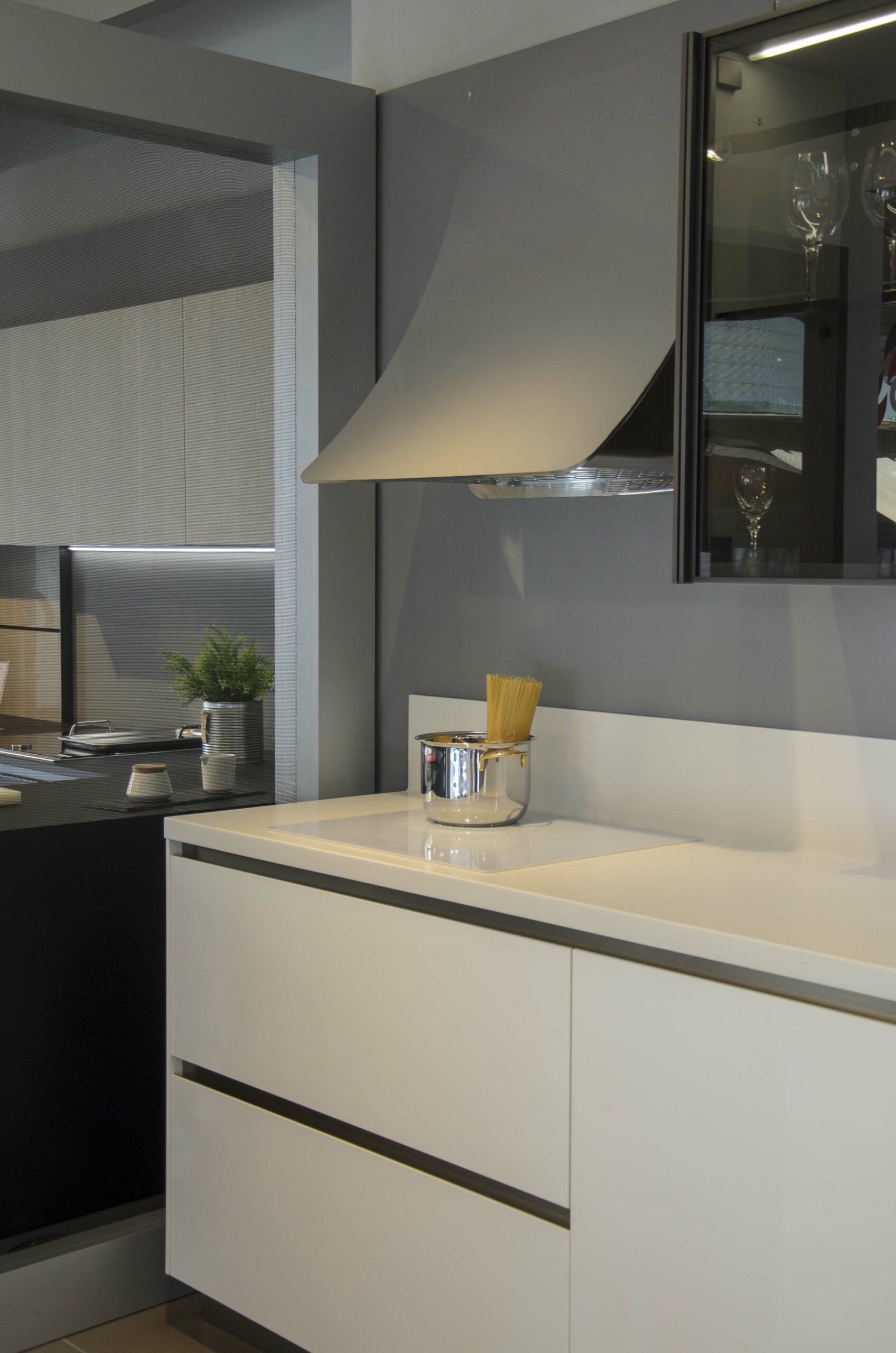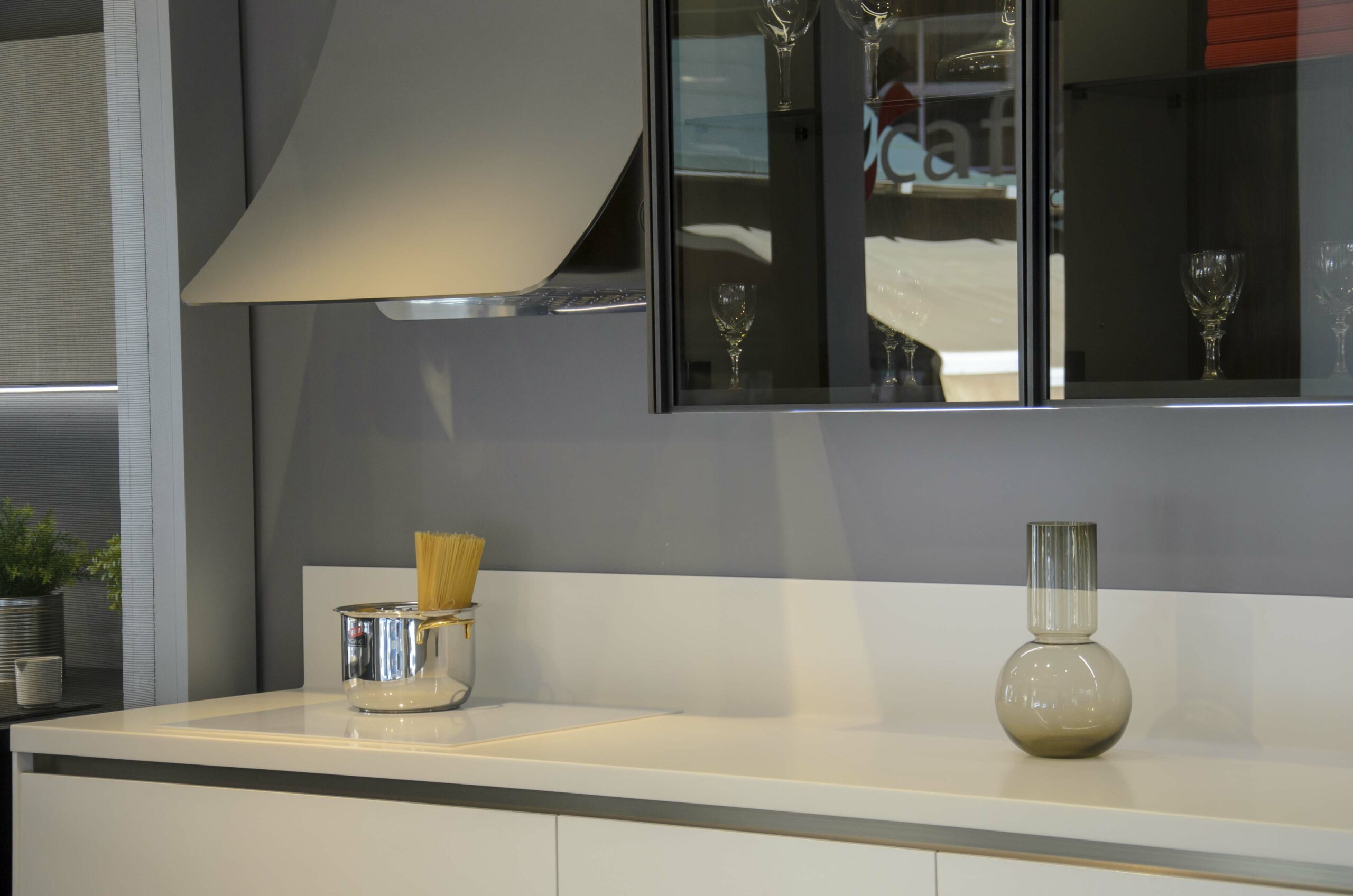 Continuamos con los electrodomésticos de esta cocina, empezando por la campana de Elica modelo DRYFALL/F/75. La gran particularidad es su estética única que nos permite pintar la carcasa del mismo color que la pared, consiguiendo un efecto de mimetización.La inducción de Whirpool ACM 680 de tres fuegos en color blanco se fusiona con la encimera lo que acentúa aún más el minimalismo de esta cocina.El Horno de SMEG SFP6104TVS en acabado plata brillo refleja la luz y combina a la perfección con todo el conjunto. Se ha situado en los muebles columna a una altura muy cómoda para su uso.También contamos con una lavadora Miele WMB120 escondida en un hueco creado en los muebles columna, así podemos tener acceso extra a una zona de lavadero, pero sin perder la estética minimalista de esta cocina. Para los accesorios de esta cocina se ha elegido la grifería de SCHOCK en el modelo Piega puro en color blanco junto a un dispensador de jabón encastrado de Franke modelo Novita.También tenemos cubos de alta capacidad de Blanco Select entre muchos otros detalles únicos de esta cocina que podrás descubrir en nuestra exposición de Cafran. Para más información póngase en contacto con nosotros, estaremos encantados de atenderle.