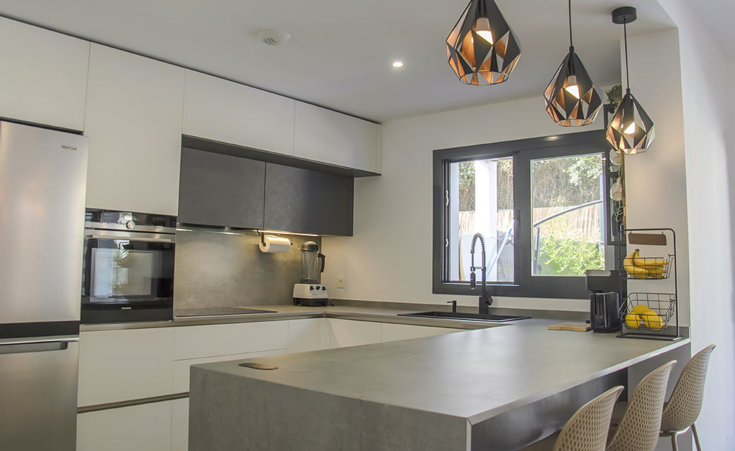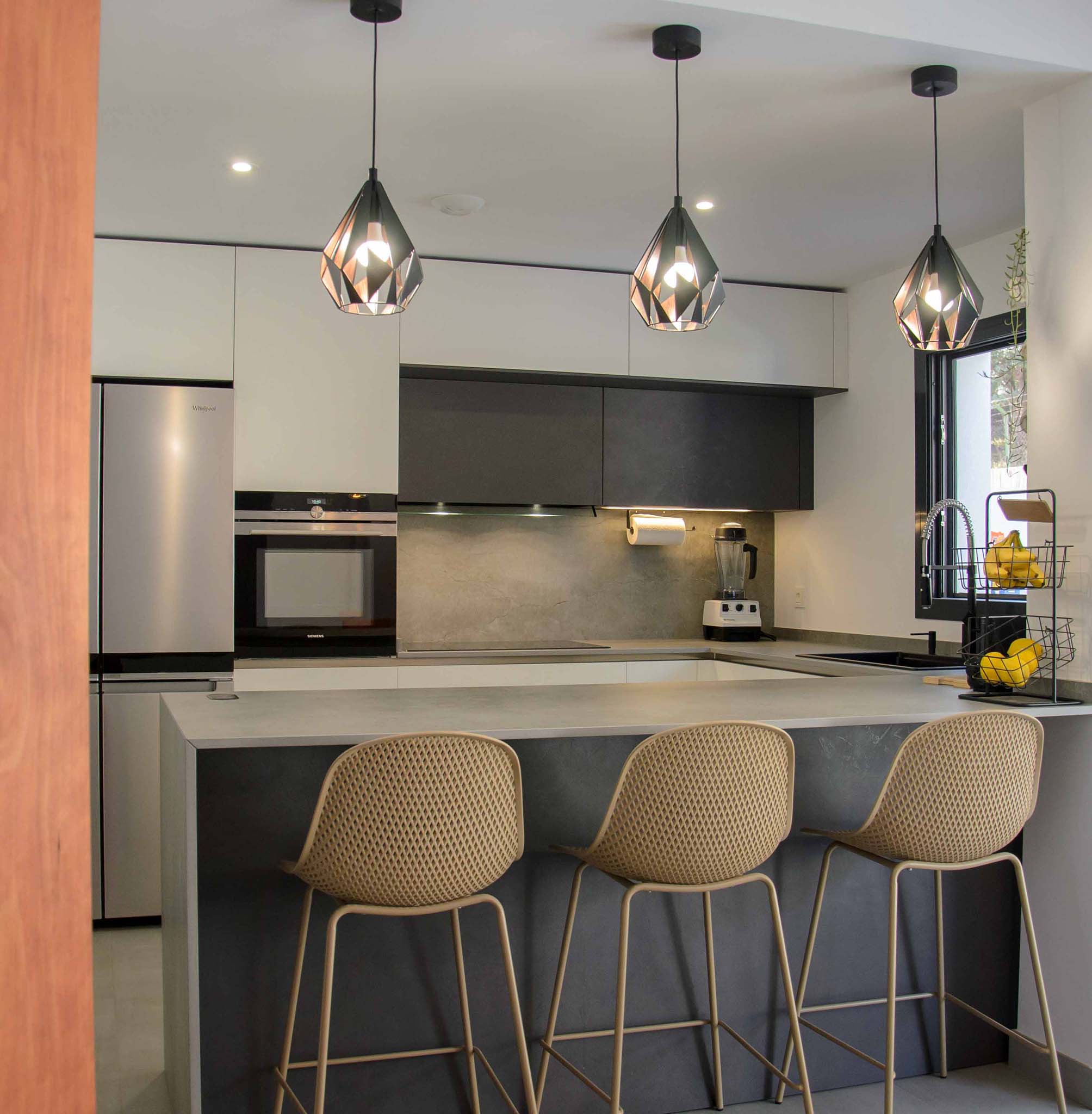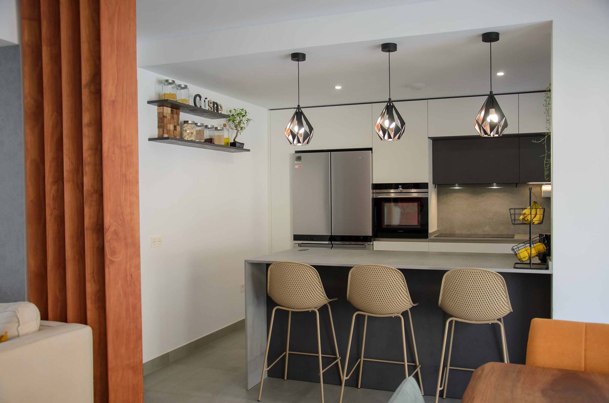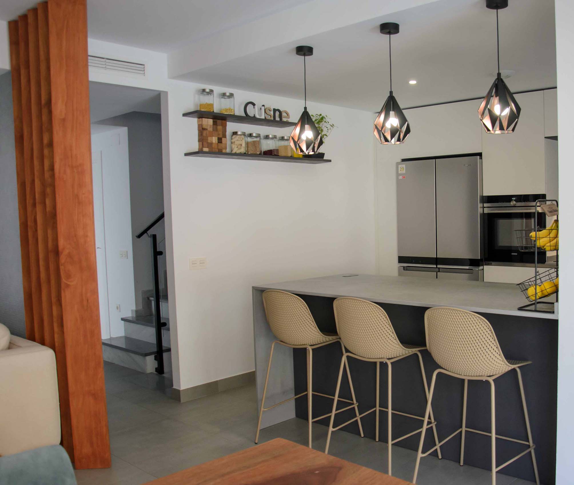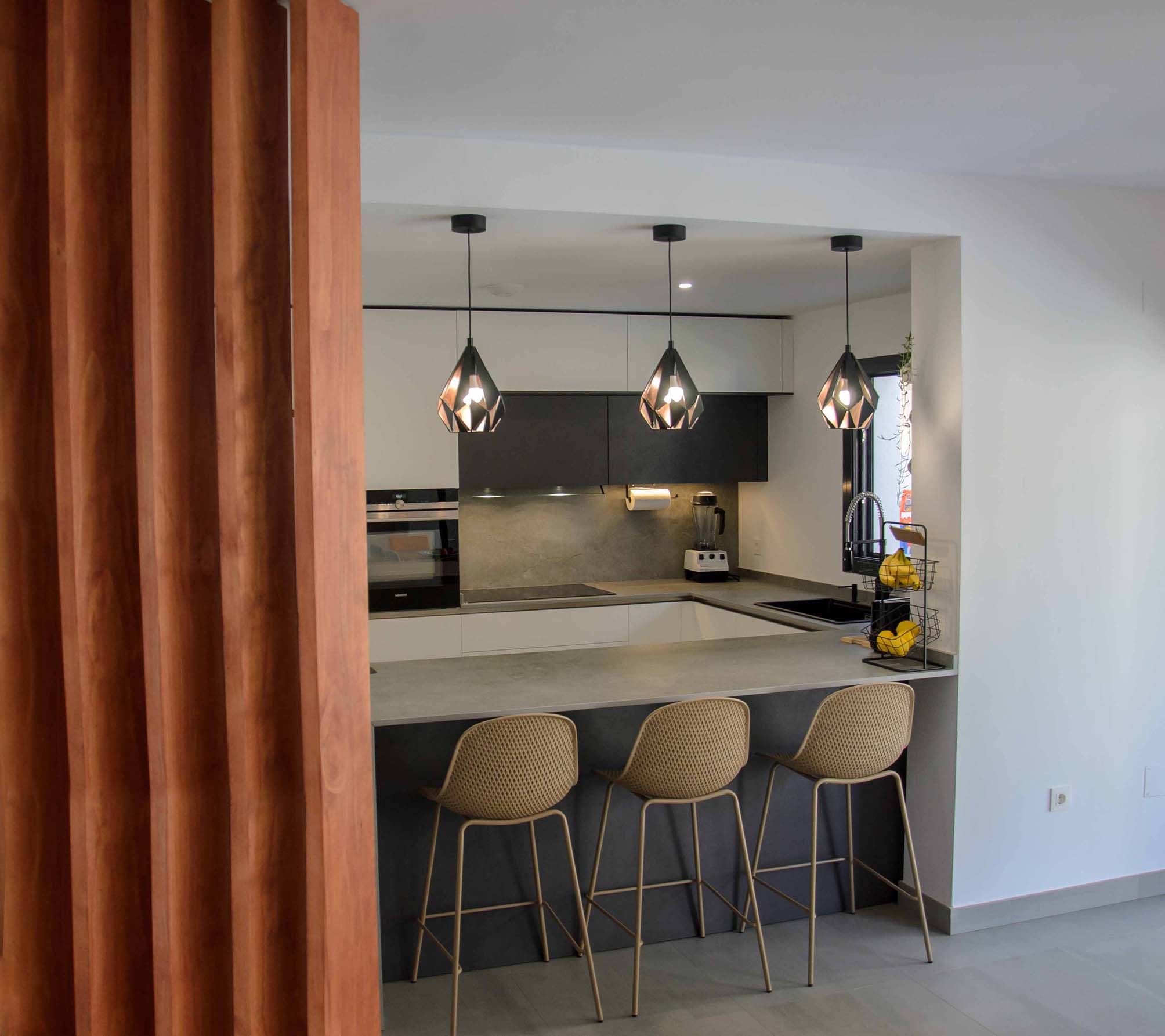 3 de agosto de 2022Este nuevo proyecto se ha centrado en optimizar al máximo un espacio abierto en el que encontramos compaginadas la zona de cocina, salón y comedor. Por supuesto, esto no ha significado que hayamos sacrificado la estética y el diseño. Haciendo una composición con tres tonalidades neutras como son el blanco, el negro y el gris, se ha logrado un ambiente elegante y a la vez, una sensación muy acogedora, algo que consideramos necesario cuando tenemos un espacio compartido como éste.
