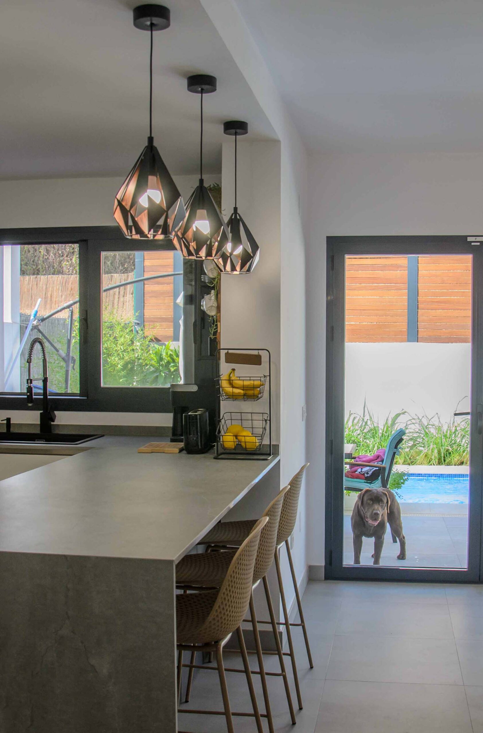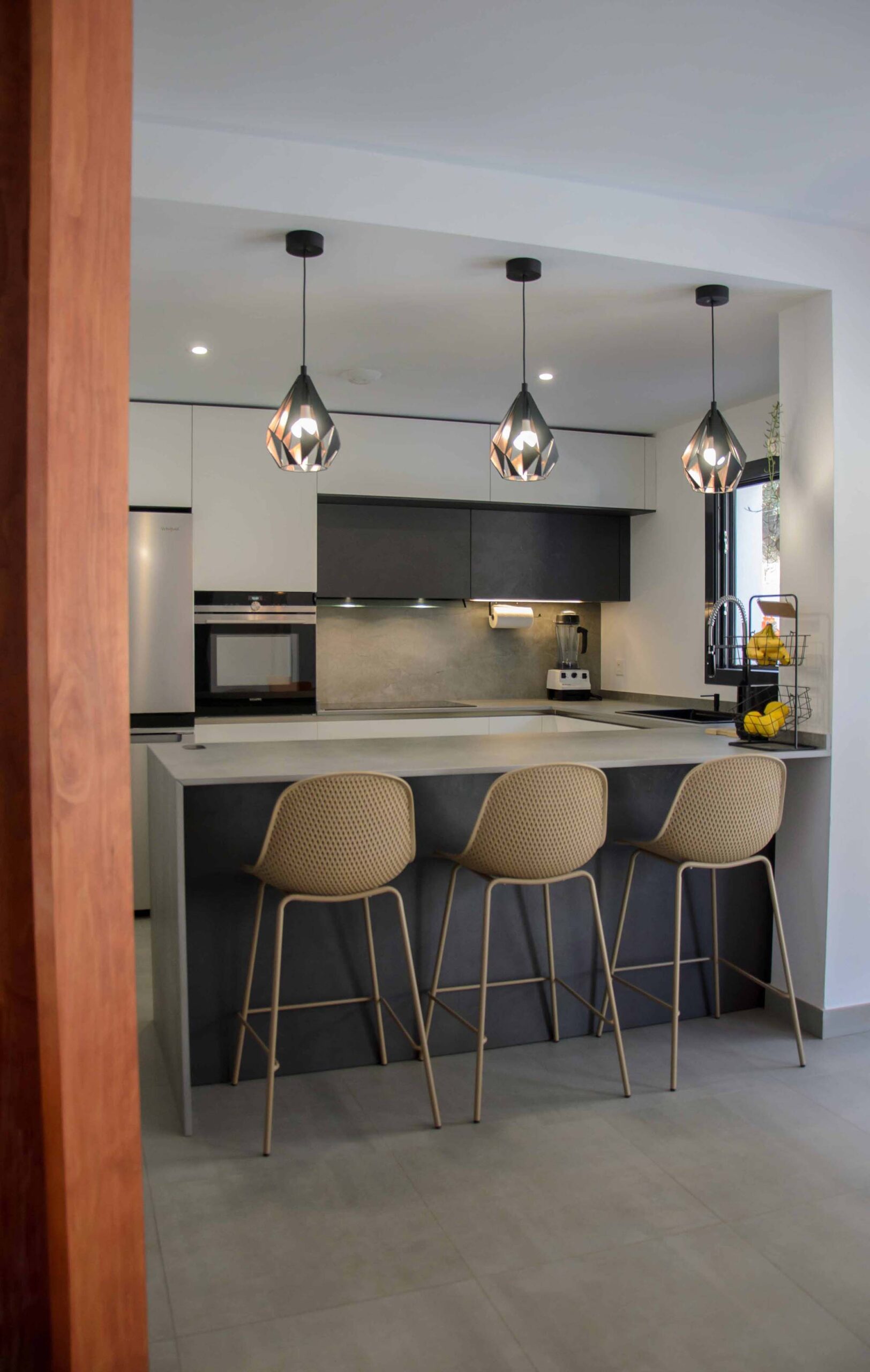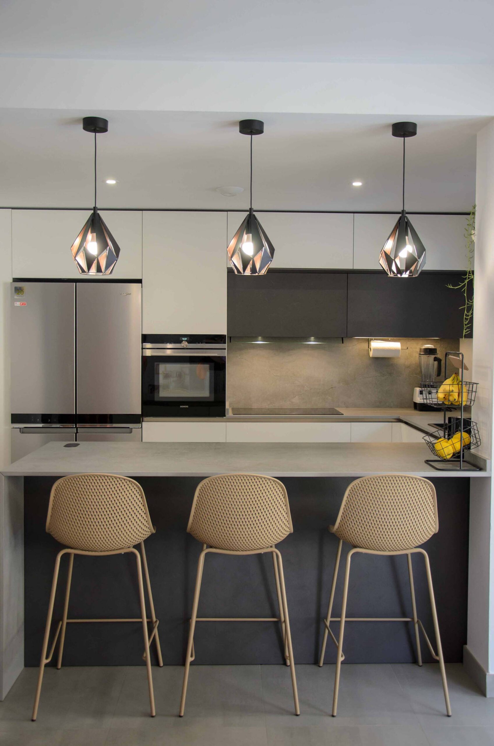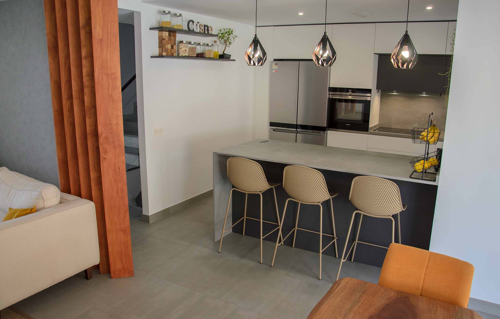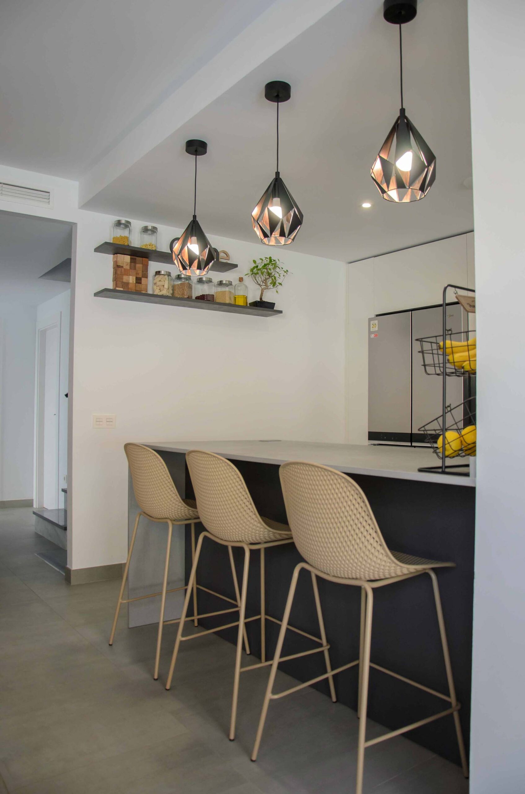 3 de agosto de 2022Este nuevo proyecto se ha centrado en optimizar al máximo un espacio abierto en el que encontramos compaginadas la zona de cocina, salón y comedor. Por supuesto, esto no ha significado que hayamos sacrificado la estética y el diseño. Haciendo una composición con tres tonalidades neutras como son el blanco, el negro y el gris, se ha logrado un ambiente elegante y a la vez, una sensación muy acogedora, algo que consideramos necesario cuando tenemos un espacio compartido como éste.