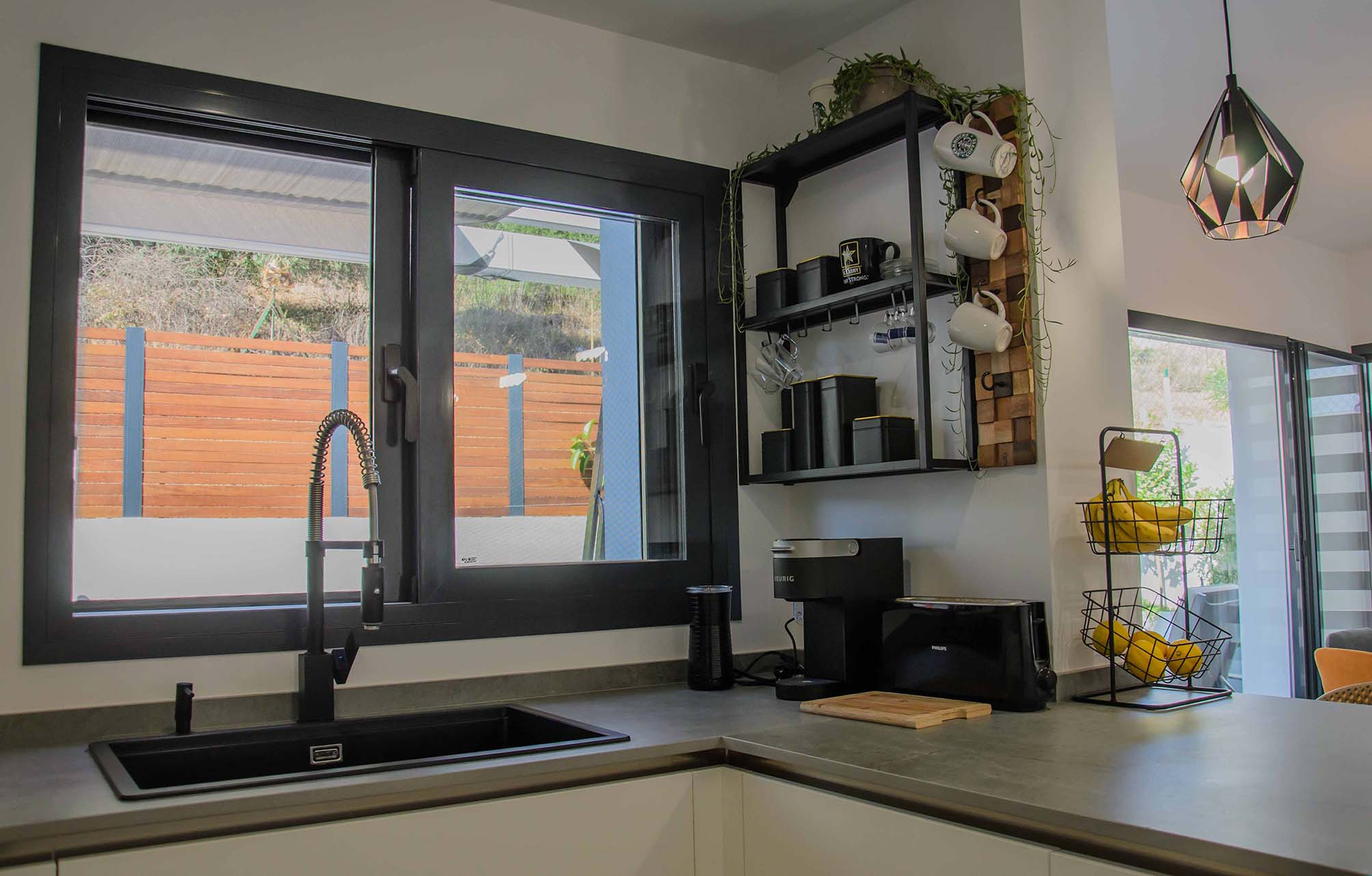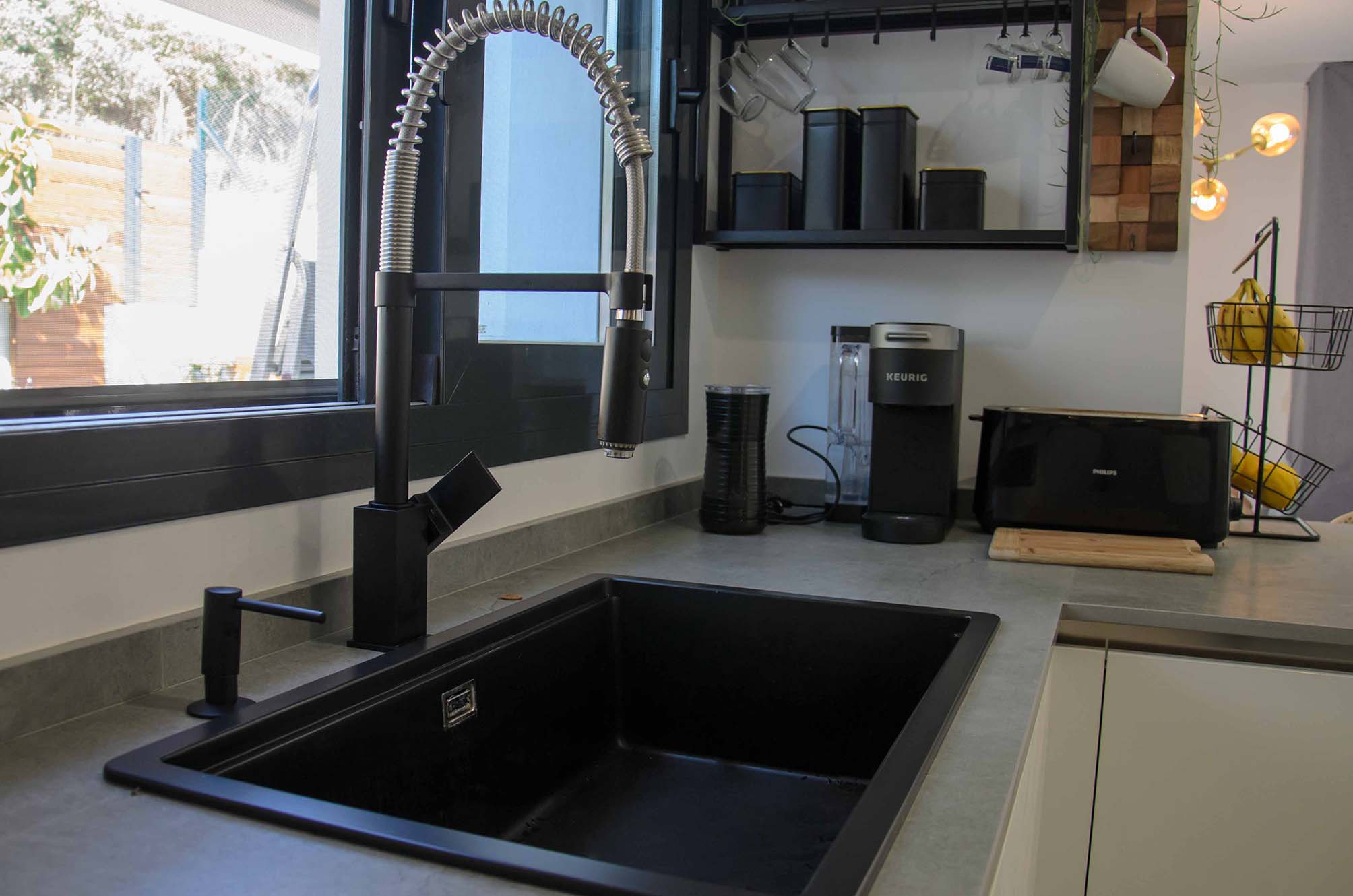 El fregadero de esta cocina va en conjunto con toda la composición, se ha seleccionado de la casa SCHOCK modelo Greenwich en un color antracita junto al grifo de la marca Plados modelo Cruze en negro mate. Para optimizar el espacio, junto al grifo tenemos un práctico dispensador de jabón también de Plados modelo Round en negro mate. Por supuesto los complementos de Cucine Oggi no podían faltar, desde su práctico enchufe encastrado en la encimera en el modelo Butterfly hasta los sistemas de almacenamiento internos de la línea Peka. ¡Esperamos que os haga gustado este nuevo proyecto tanto como a nosotros!