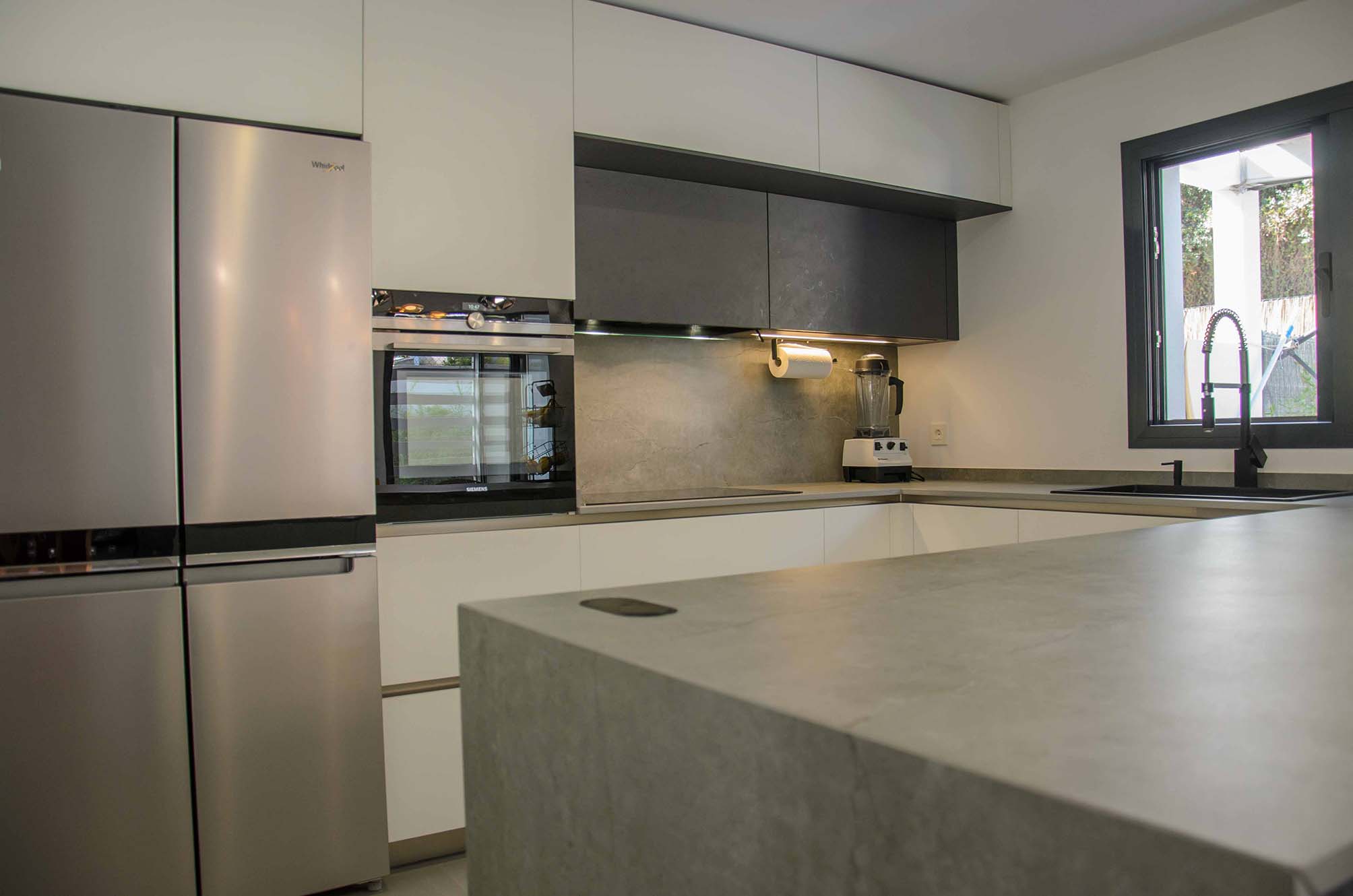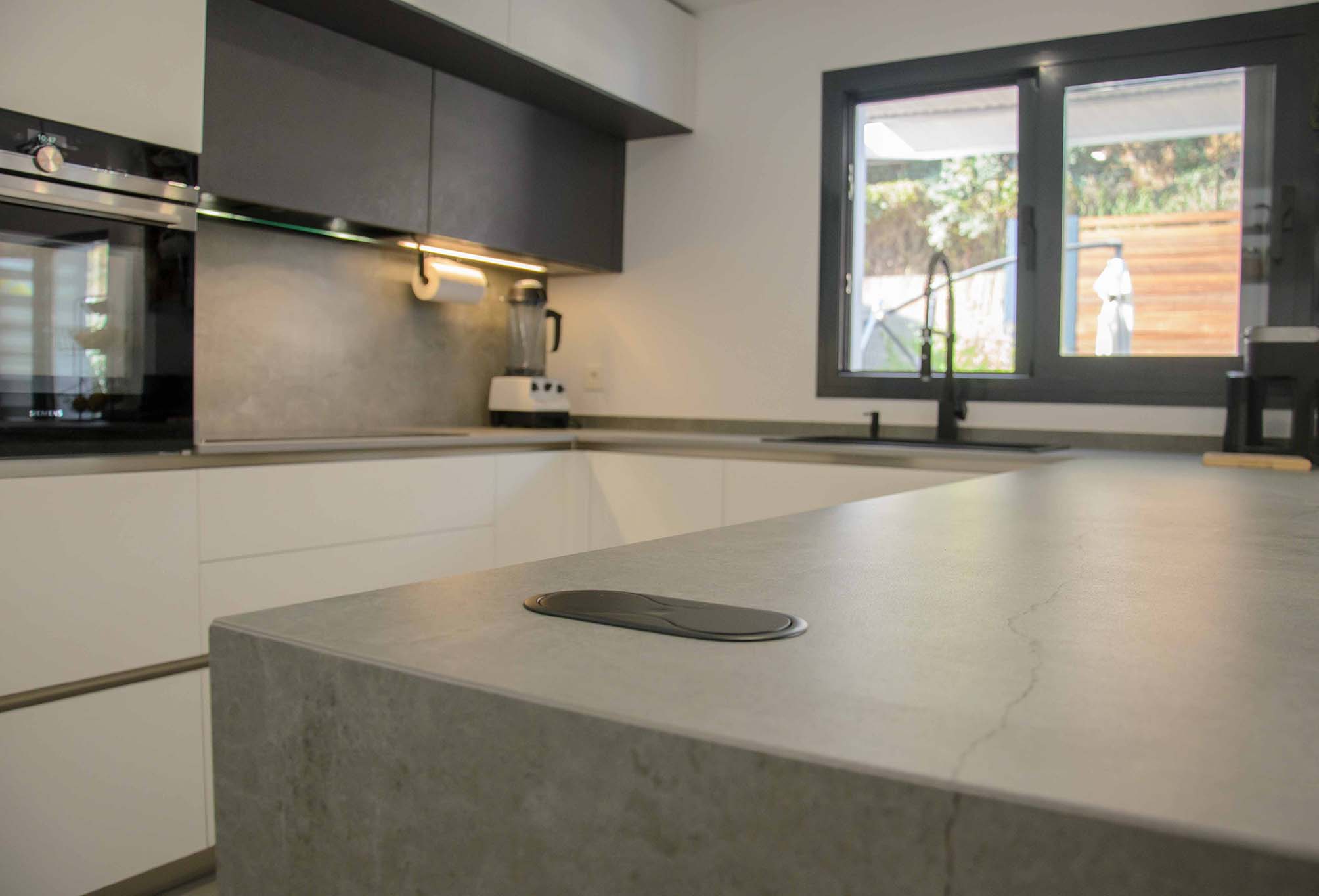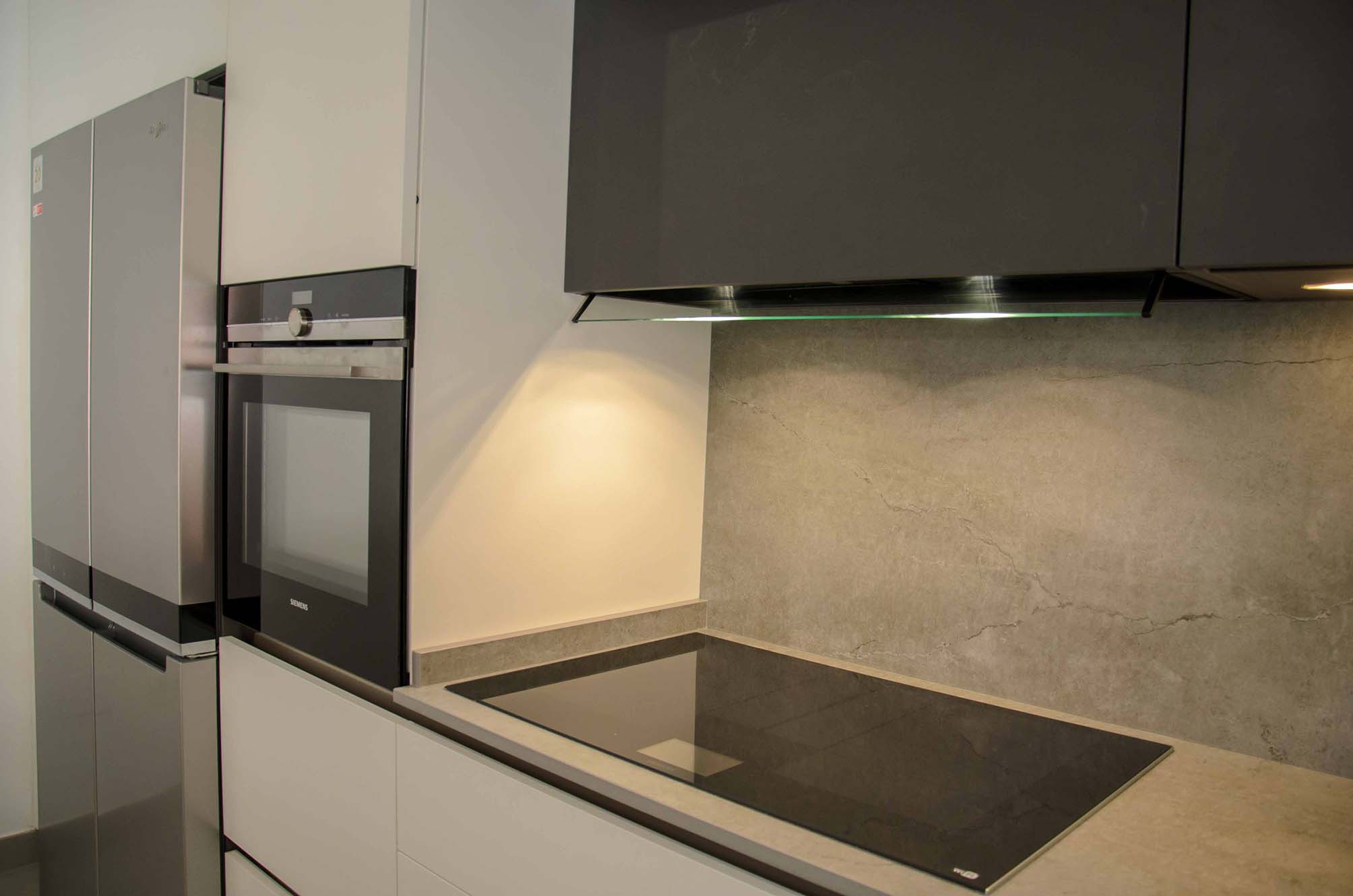 Como ya hemos comentado, el mobiliario Ak_Project de nuestro fabricante Arrital se ha elegido en dos acabados, el Wall 73 y el Wall 08, uno en tono blanco roto y el otro en un tono muy oscuro, casi negro. Las texturas que posee esta puerta tienen la virtud de reflectar la luz de manera que, aunque a se pueda considerar de acabado mate, no deja de tener cierto brillo que según incide la luz podremos detectarlo a simple vista, o no. Para la superficie tenemos una gran península en un Dekton modelo Soke de 2 cm de grosor, este color imita al cemento con ciertas vetas muy realistas, en una gama de grises claros y oscuros. También ha sido instalado como trasera en la zona de la vitrocerámica que no sólo es un extra de protección contra salpicaduras, sino que nos proporciona un toque diferenciador de diseño.