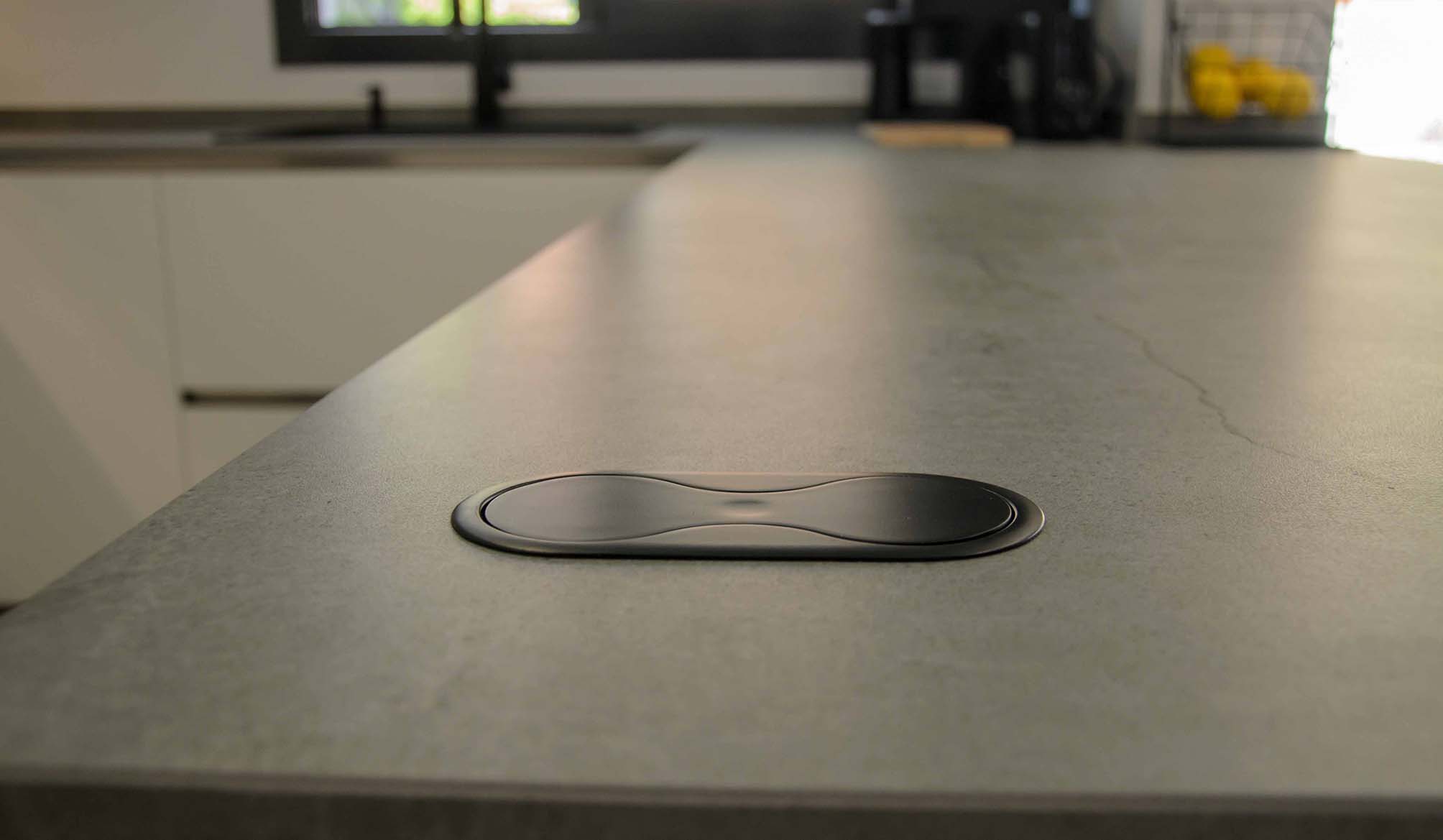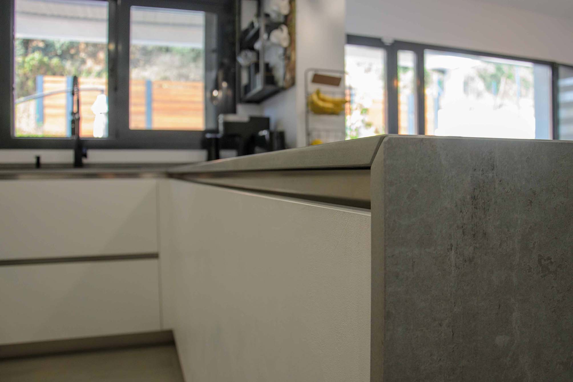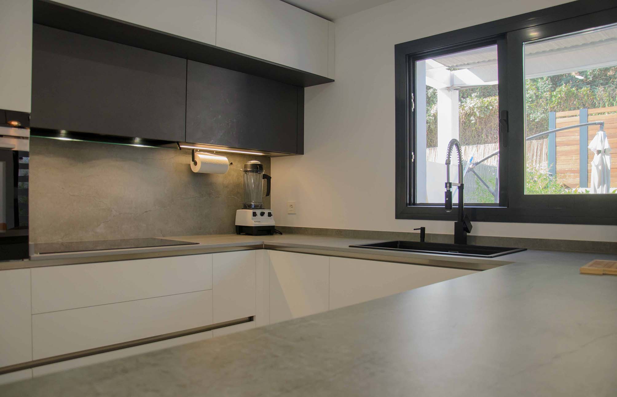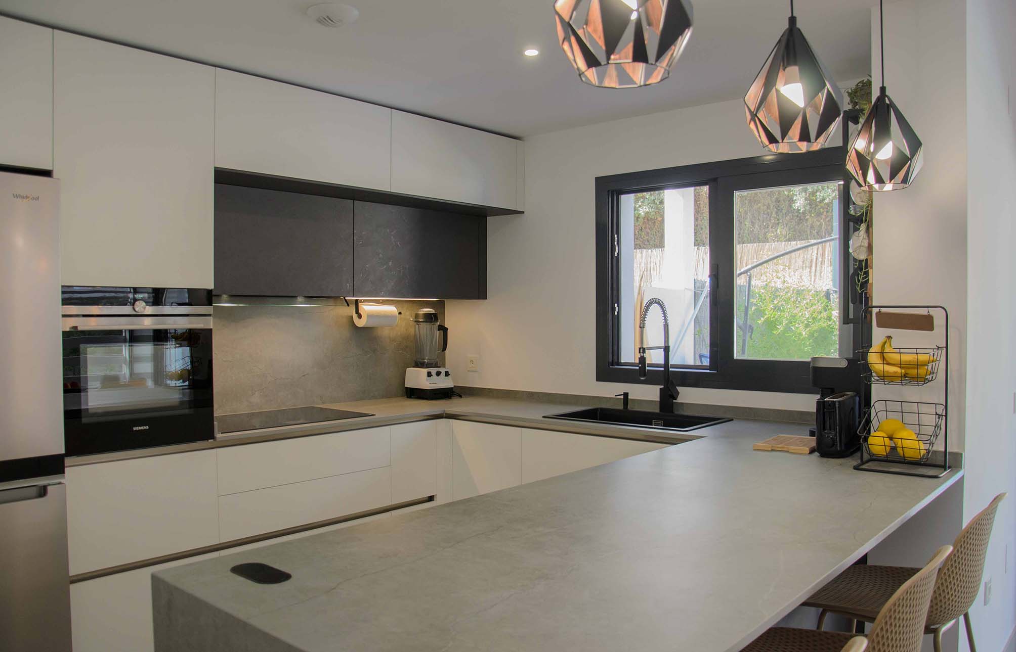 Como ya hemos comentado, el mobiliario Ak_Project de nuestro fabricante Arrital se ha elegido en dos acabados, el Wall 73 y el Wall 08, uno en tono blanco roto y el otro en un tono muy oscuro, casi negro. Las texturas que posee esta puerta tienen la virtud de reflectar la luz de manera que, aunque a se pueda considerar de acabado mate, no deja de tener cierto brillo que según incide la luz podremos detectarlo a simple vista, o no. Para la superficie tenemos una gran península en un Dekton modelo Soke de 2 cm de grosor, este color imita al cemento con ciertas vetas muy realistas, en una gama de grises claros y oscuros. También ha sido instalado como trasera en la zona de la vitrocerámica que no sólo es un extra de protección contra salpicaduras, sino que nos proporciona un toque diferenciador de diseño.