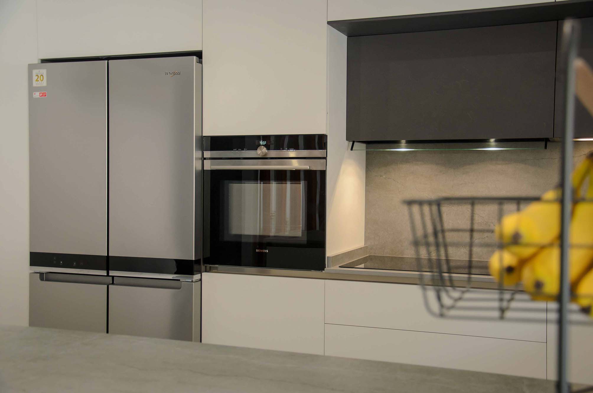 Tenemos una variedad de marcas para los electrodomésticos, pero todos ellos equipados para optimizar la tecnología. Por ejemplo, de la casa Siemens nos encontramos con la vitrocerámica flexinducción modelo EX875KYW1E con la tecnología Home Connect, con esta función podrás controlar la placa de forma inteligente desde el móvil o la tablet. El horno-microondas modelo HM633GBS1 en acabado cristal negro con tecnología Variospeed, que te permite cocinar de forma optimizada hasta un 50% más rápido. El lavavajillas modelo SN63HX52CE completamente integrable. La campana de la casa Elica modelo Boxin también integrada en color negro mate.