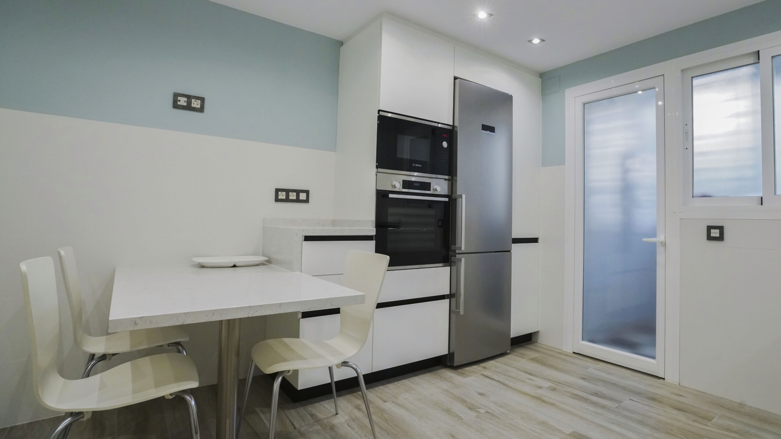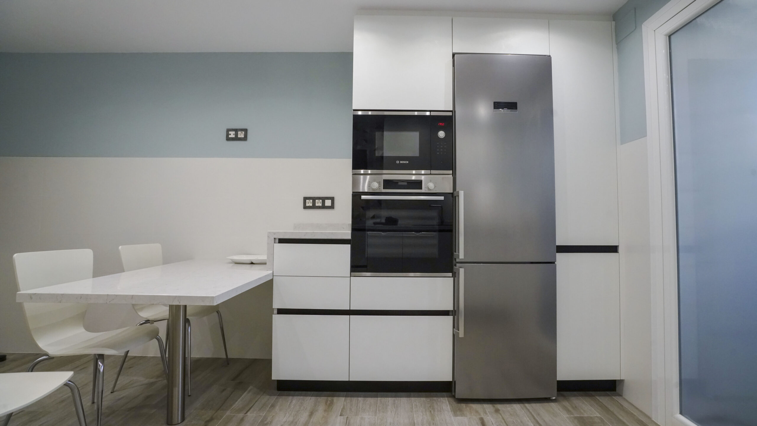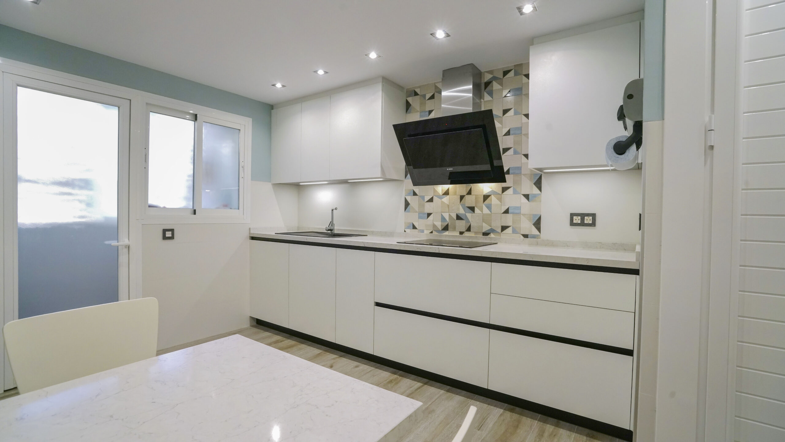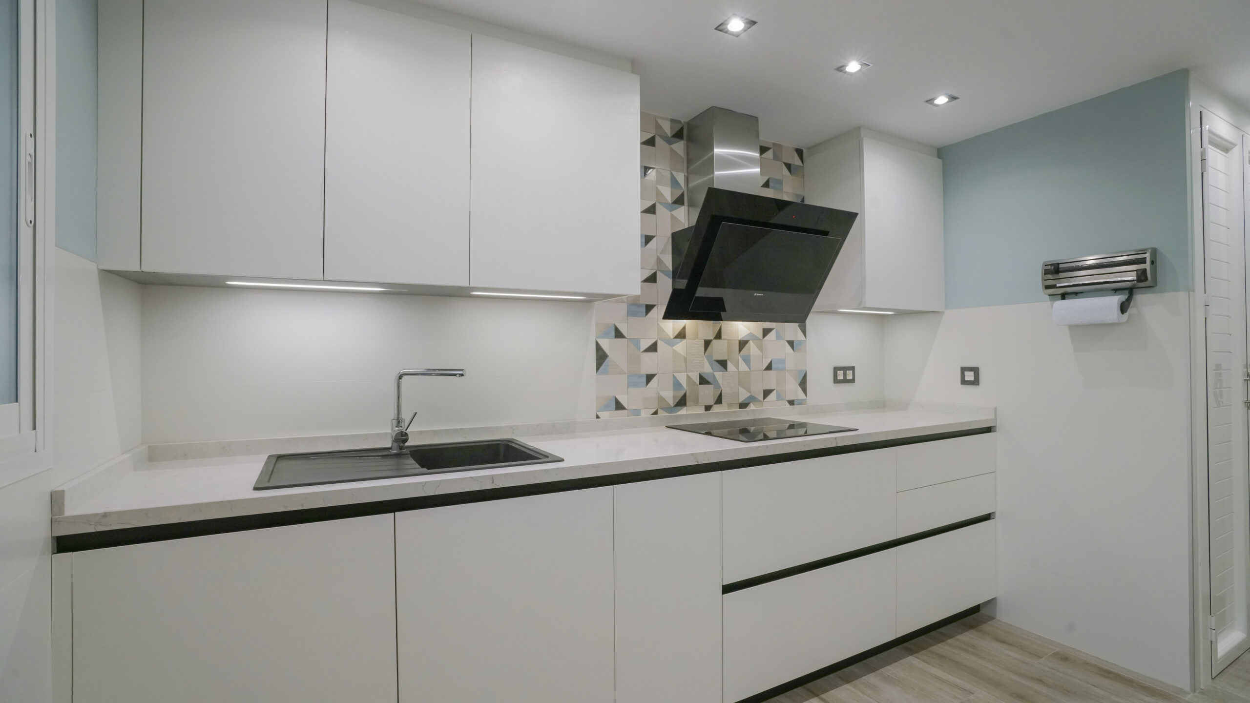 El fregadero y el grifo son de la marca especializada Blanco, el fregadero en tono oscuro es de Silgranit. Este material está compuesto en un 80% de granito natural combinado con materiales acrílicos y pigmentos, así conseguimos una superficie con poros muy finos, un tacto sedoso similar a la piedra y una amplia variedad cromática. Su gran resistencia y facilidad de cuidados lo hacen un material ideal para fregaderos de cocina. Los electrodomésticos son de la marca Bosch, no podemos apreciar el lavavajillas porque se encuentra integrado en la cocina para no interrumpir la continuidad visual. La encimera es de Silestone en el tono Pearl Jasmine, con un aspecto de piedra caliza blanca y cubierto con sutiles vetas grises, crea un impresionante efecto de grietas. Este modelo que recrea la piedra natural crea un contraste muy acertado en esta cocina de corte moderno. Se ha añadido una mesa muy práctica del mismo material de la encimera que alberga capacidad de hasta tres comensales. Para el suelo se ha elegido una madera clara en tonos tierra, las paredes juegan con un tono blanco roto combinado con un azul menta que ha estado muy en tendencia. Le resta sobriedad a la cocina la trasera de la zona de fuegos realizada con formas geométricas.
