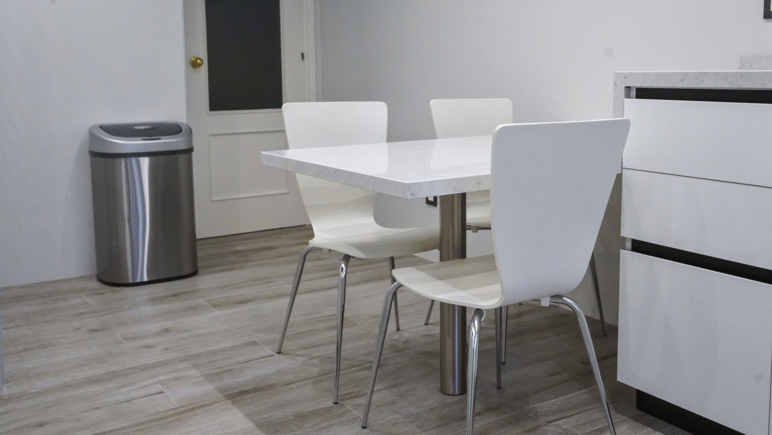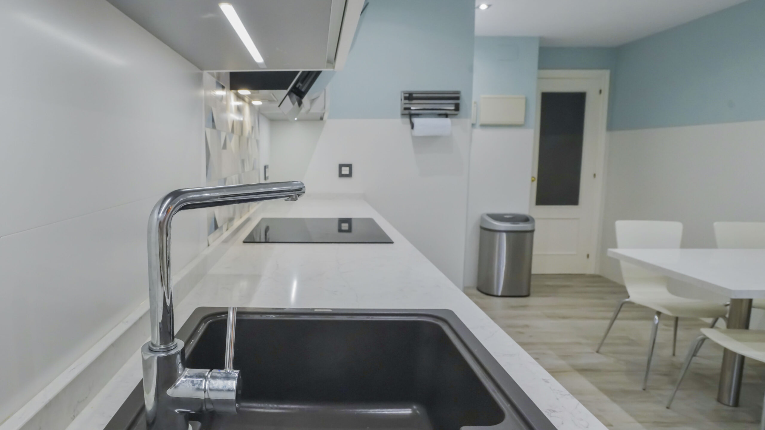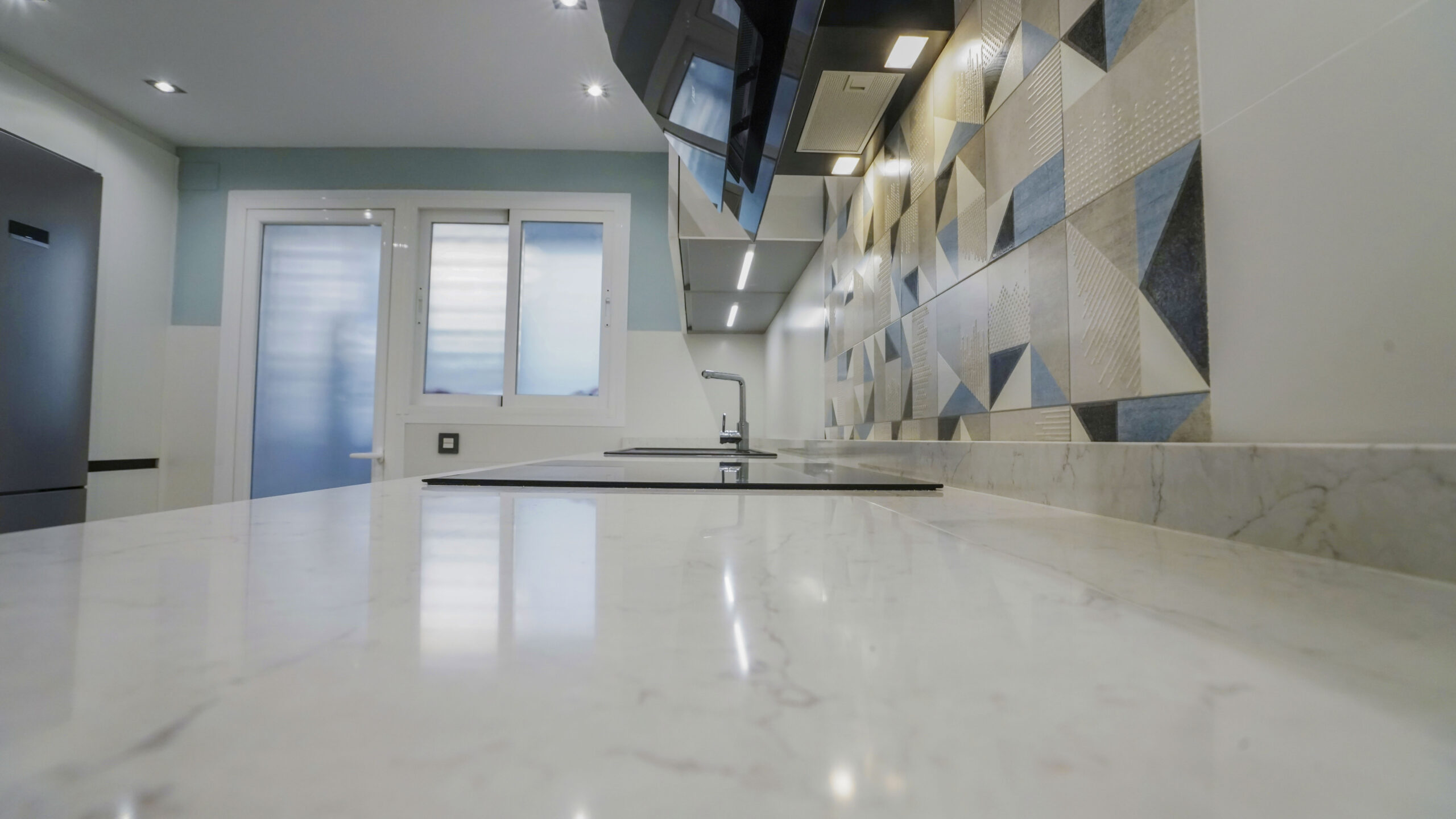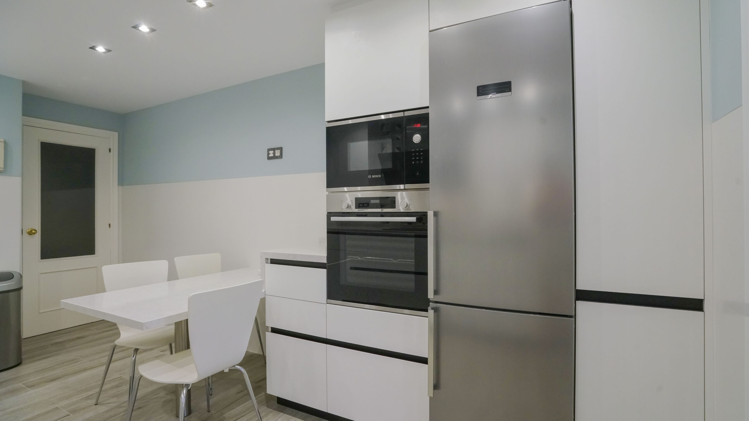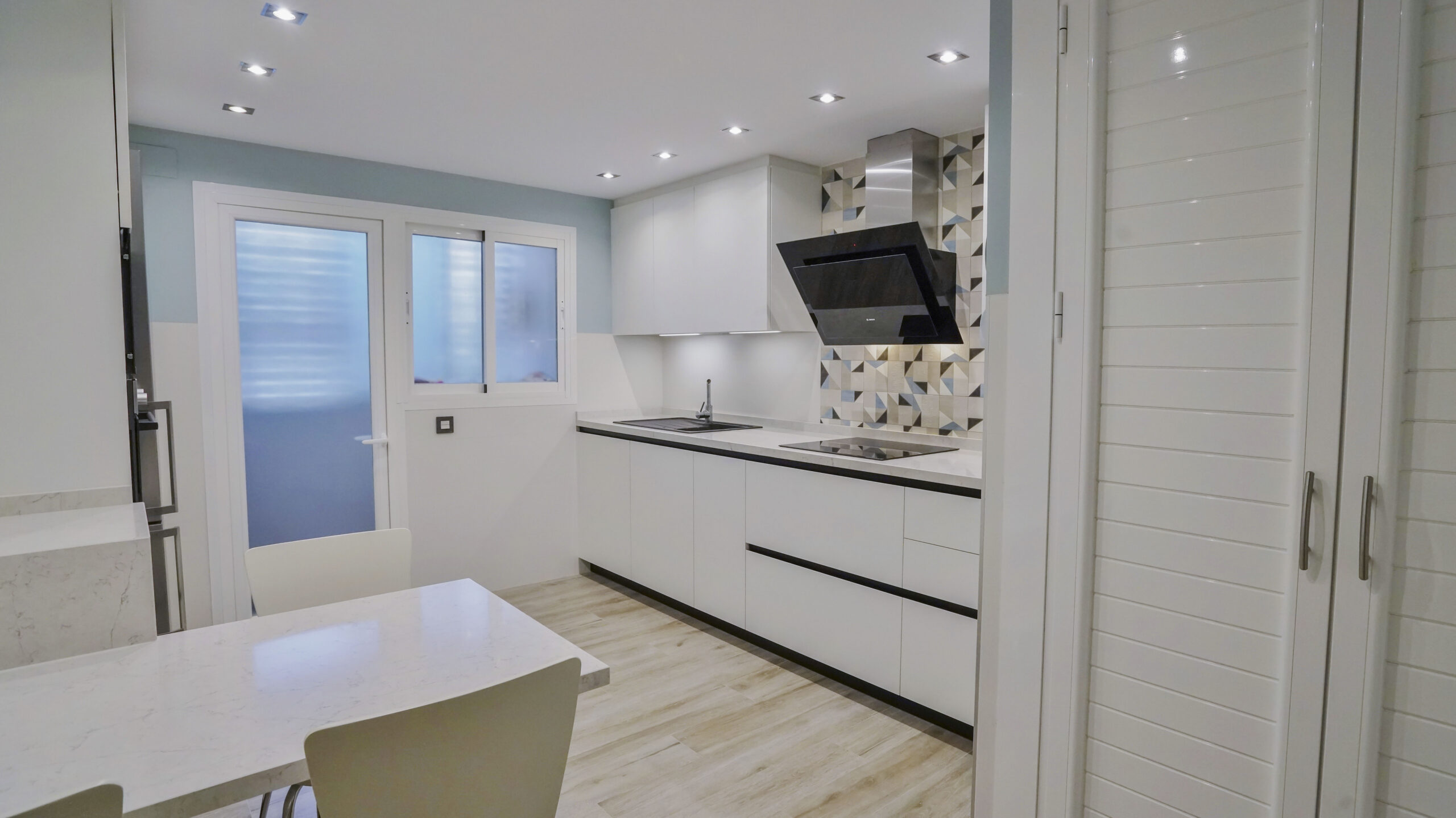 El fregadero y el grifo son de la marca especializada Blanco, el fregadero en tono oscuro es de Silgranit. Este material está compuesto en un 80% de granito natural combinado con materiales acrílicos y pigmentos, así conseguimos una superficie con poros muy finos, un tacto sedoso similar a la piedra y una amplia variedad cromática. Su gran resistencia y facilidad de cuidados lo hacen un material ideal para fregaderos de cocina. Los electrodomésticos son de la marca Bosch, no podemos apreciar el lavavajillas porque se encuentra integrado en la cocina para no interrumpir la continuidad visual. La encimera es de Silestone en el tono Pearl Jasmine, con un aspecto de piedra caliza blanca y cubierto con sutiles vetas grises, crea un impresionante efecto de grietas. Este modelo que recrea la piedra natural crea un contraste muy acertado en esta cocina de corte moderno. Se ha añadido una mesa muy práctica del mismo material de la encimera que alberga capacidad de hasta tres comensales. Para el suelo se ha elegido una madera clara en tonos tierra, las paredes juegan con un tono blanco roto combinado con un azul menta que ha estado muy en tendencia. Le resta sobriedad a la cocina la trasera de la zona de fuegos realizada con formas geométricas.