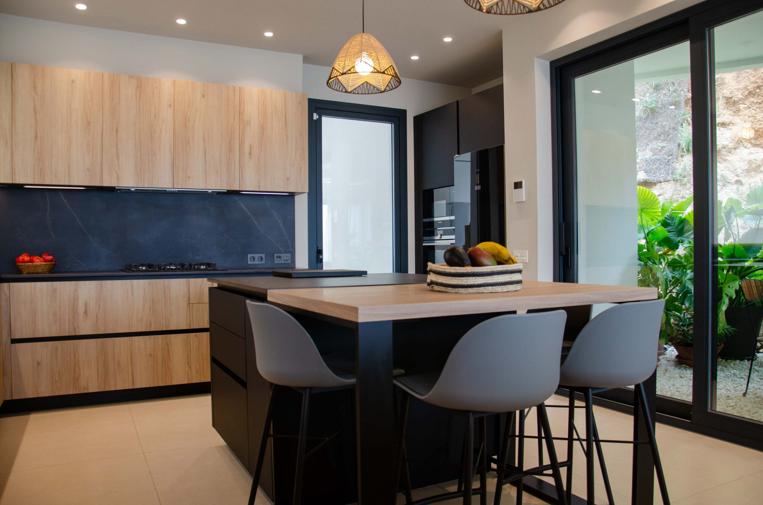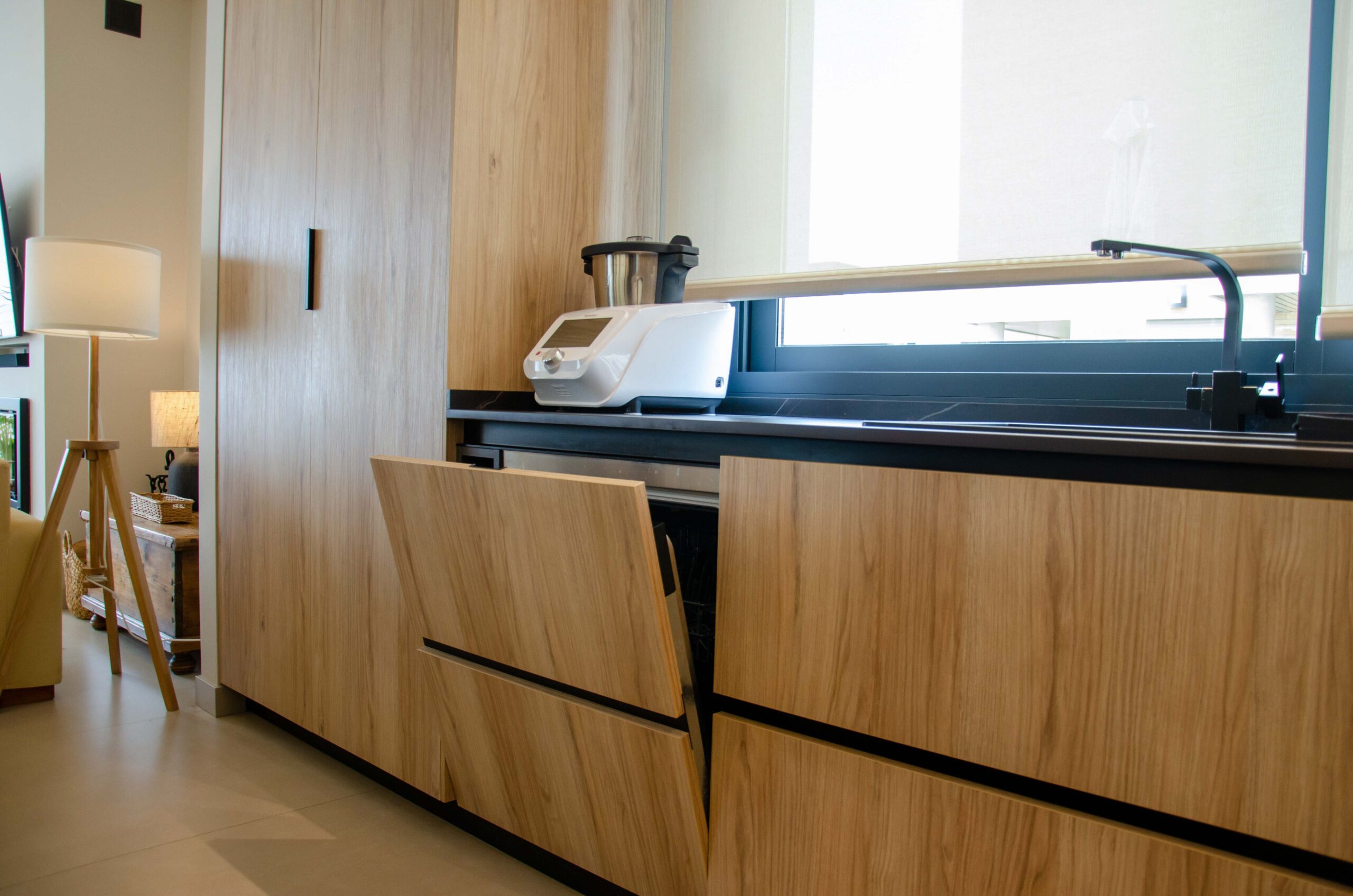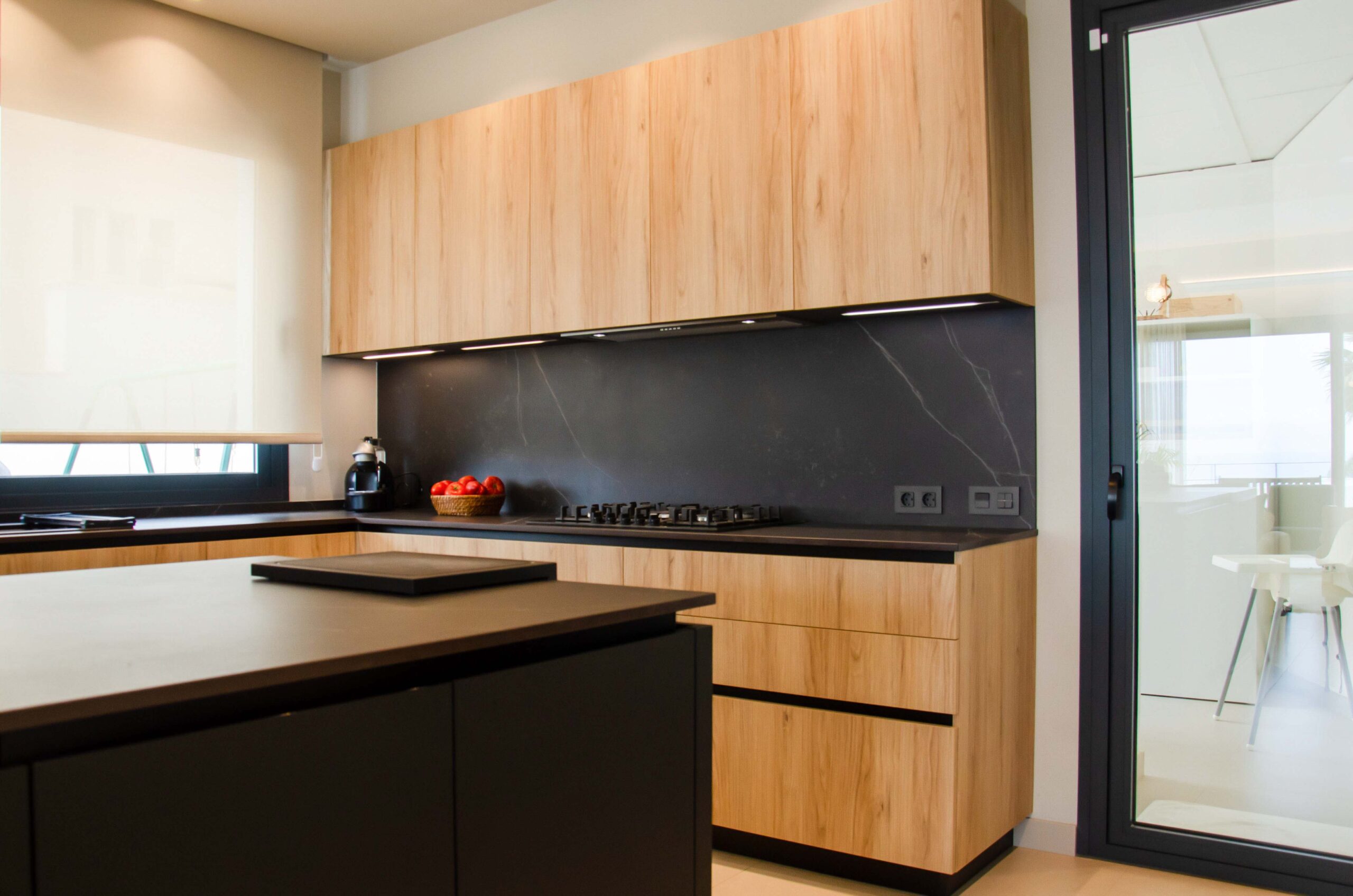 Esta combinación es elegante y a la vez nos inspira mucha cercanía. La distribución es sencilla pero efectiva con dos tipos de acabados, por un lado tenemos la puerta termoestructurada imitando a la madera veteada en el acabado Rovere Columbia y por otro en la isla central y los muebles columna, el acabado Fenix en color negro. Esta isla es multifuncional ya que no sólo alberga muchísima capacidad de almacenamiento, sino que se le ha integrado una mesa con altura de barra que facilita un picoteo rápido sin tener que montar la mesa del comedor.La encimera se ha elegido en un Dekton Kelya, un tono que imita un mármol natural oscuro con vetas claras. También se ha usado para la zona de cocción una trasera en el mismo material que no sólo enmarca la zona, sino que además protege de manchas y salpicaduras.