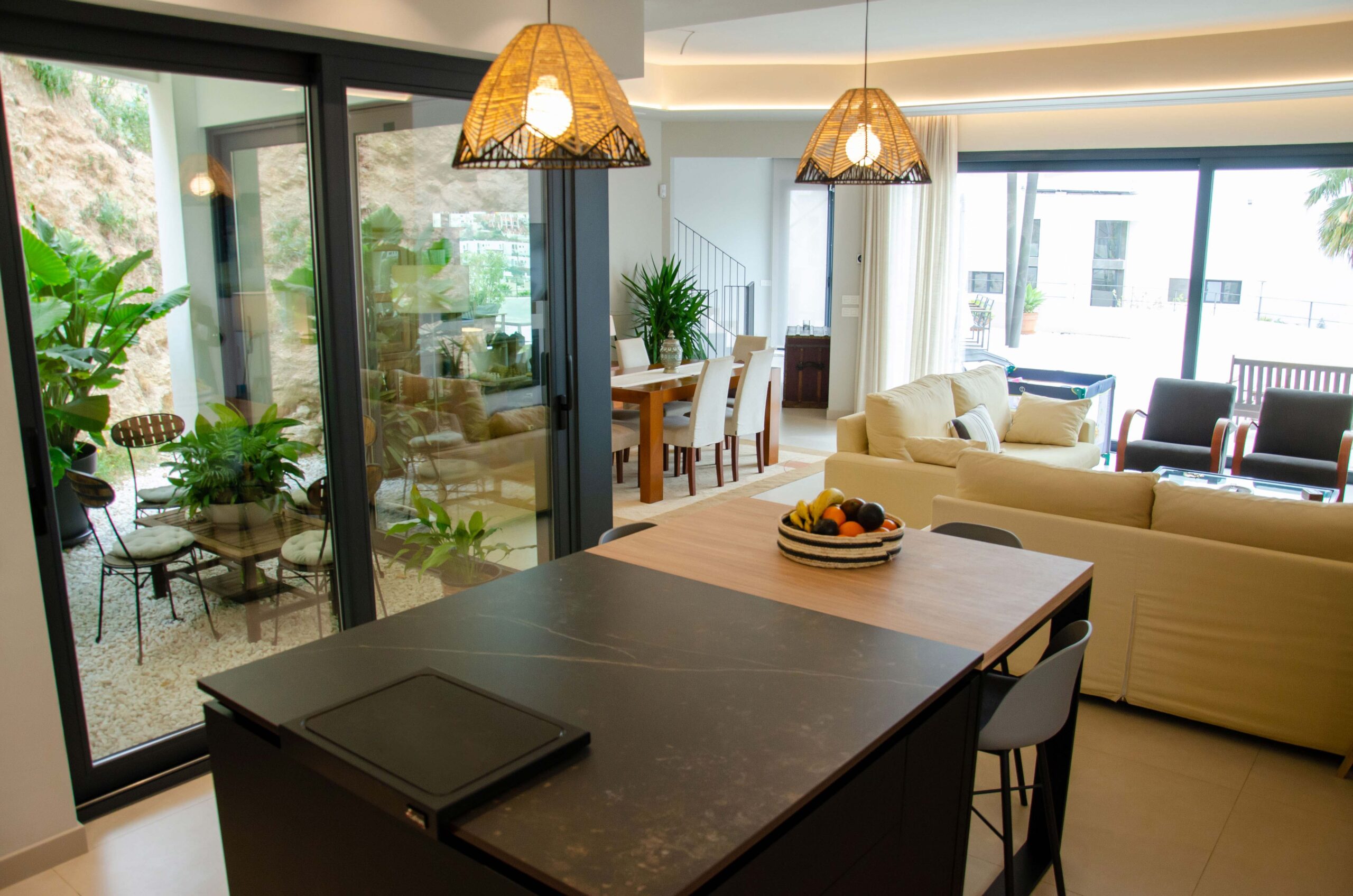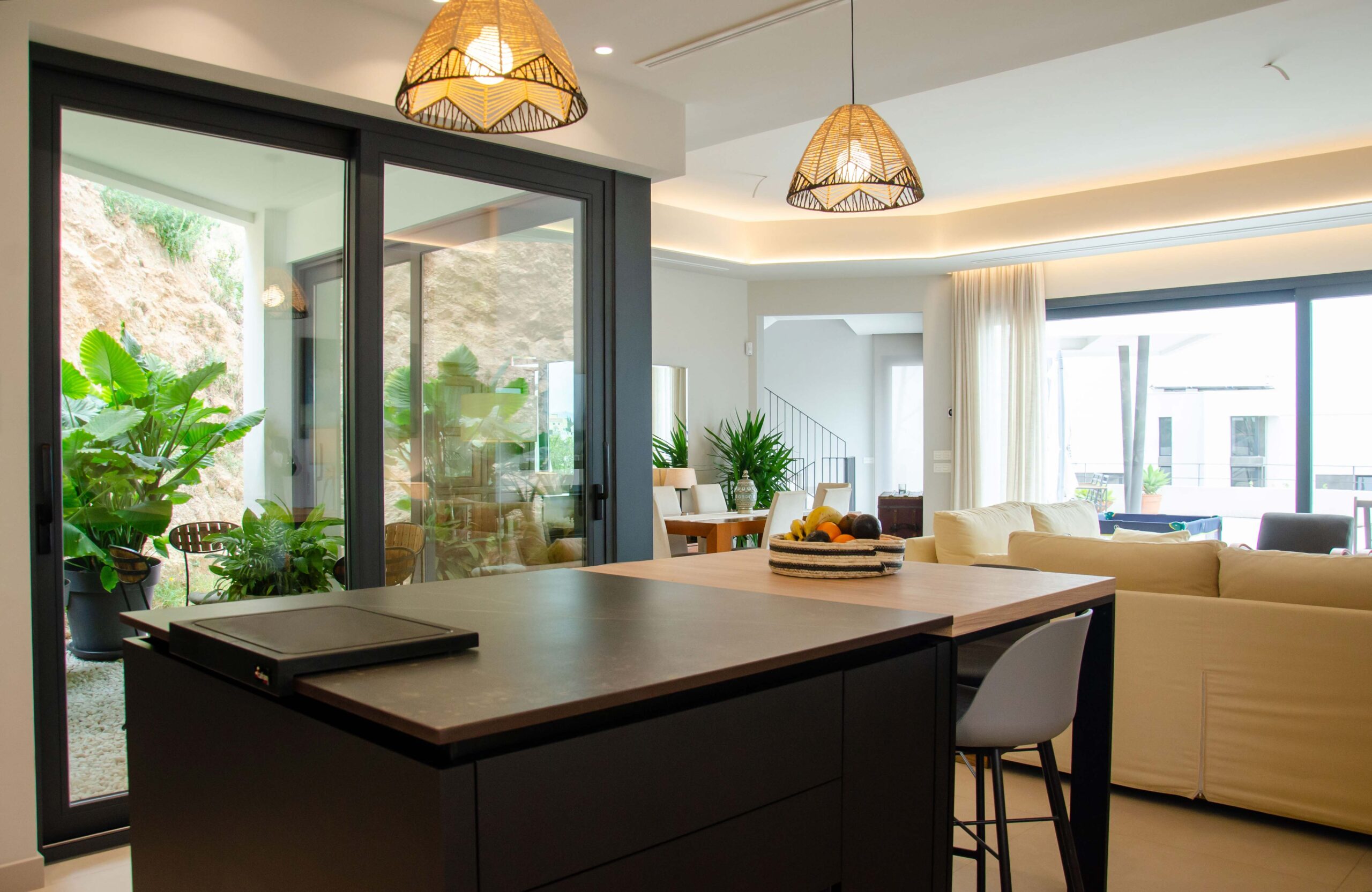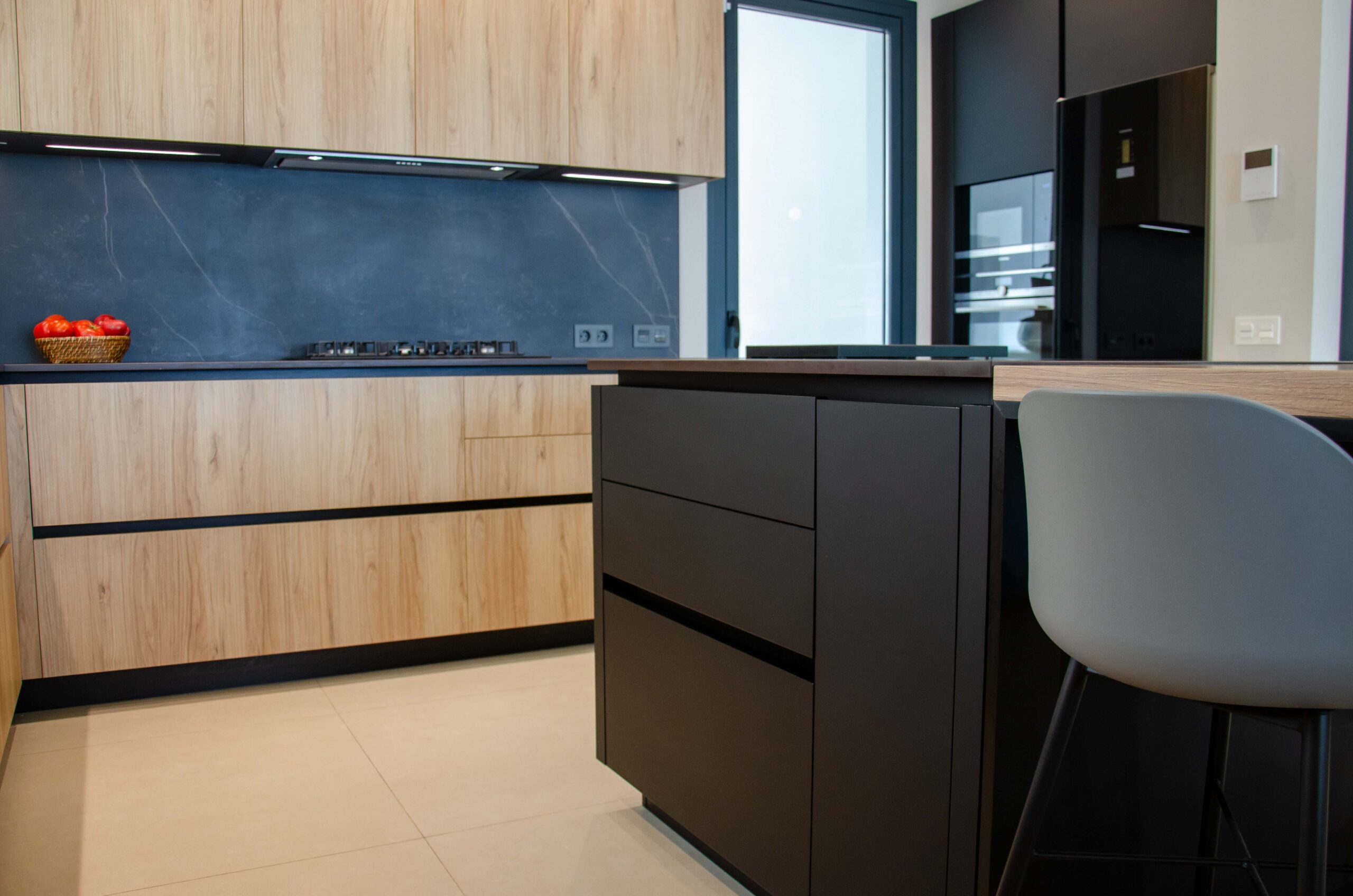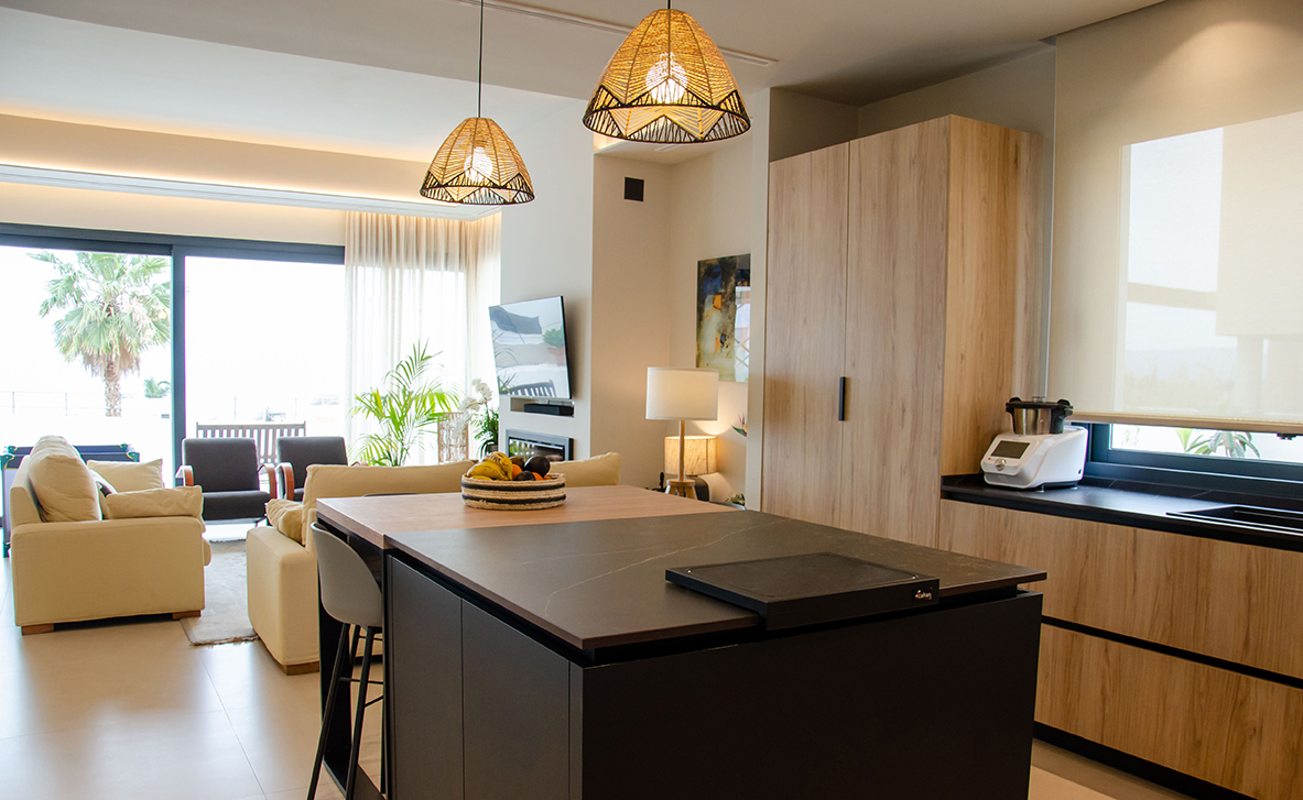 Esta combinación es elegante y a la vez nos inspira mucha cercanía. La distribución es sencilla pero efectiva con dos tipos de acabados, por un lado tenemos la puerta termoestructurada imitando a la madera veteada en el acabado Rovere Columbia y por otro en la isla central y los muebles columna, el acabado Fenix en color negro. Esta isla es multifuncional ya que no sólo alberga muchísima capacidad de almacenamiento, sino que se le ha integrado una mesa con altura de barra que facilita un picoteo rápido sin tener que montar la mesa del comedor.La encimera se ha elegido en un Dekton Kelya, un tono que imita un mármol natural oscuro con vetas claras. También se ha usado para la zona de cocción una trasera en el mismo material que no sólo enmarca la zona, sino que además protege de manchas y salpicaduras.