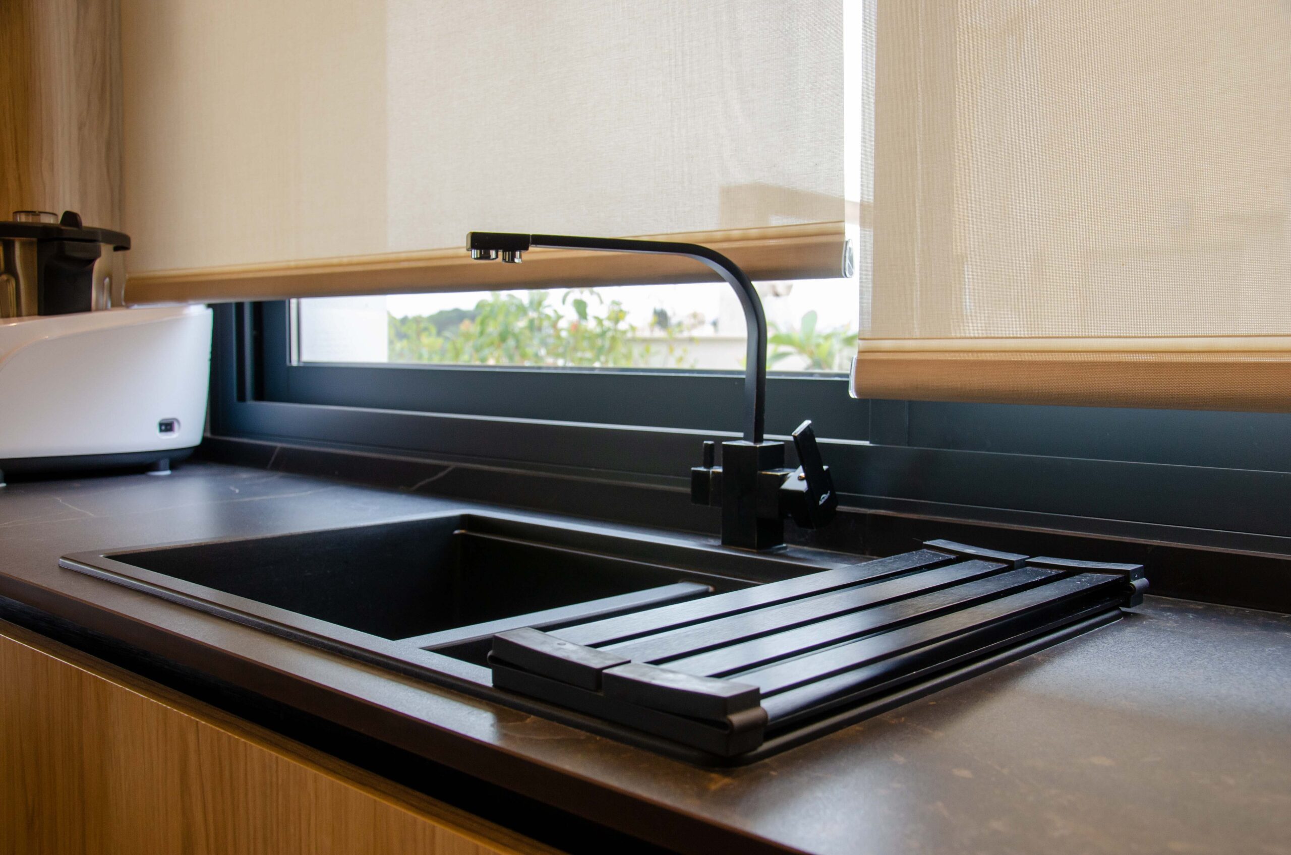 Para todos los electrodomésticos se ha seleccionado la marca Siemens en el acabado cristal negro, esto hace conjunto con las tonalidades de la cocina pero además aporta cierta luminosidad. En columna encontramos un horno pirolítico modelo HB676G0S1 con raíles telescópicos. El microondas BF525LMS0 touch control a juego con el horno. Junto a esta columna tenemos el frigorífico combi modelo KG56FSBDA. La placa de gas modelo EP7A6QB90 con un quemador para wok. La campana modelo LB89585M completamente integrada al igual que el lavavajillas modelo N61HX04AE, integrado en el mueble. El fregadero y el grifo son de la marca Schock en el modelo Brooklyn GREEN100LA en color negro junto con el grifo a juego.