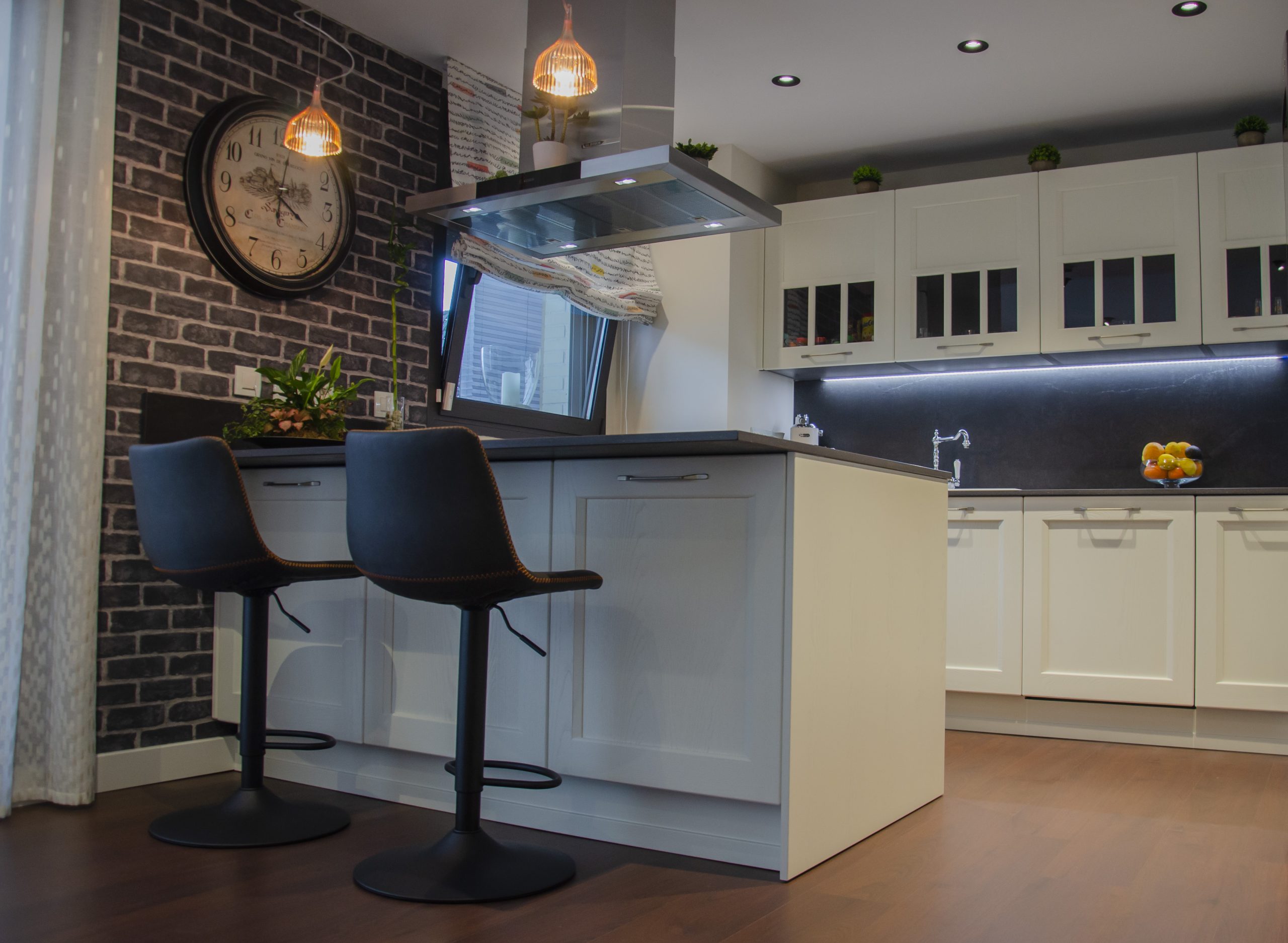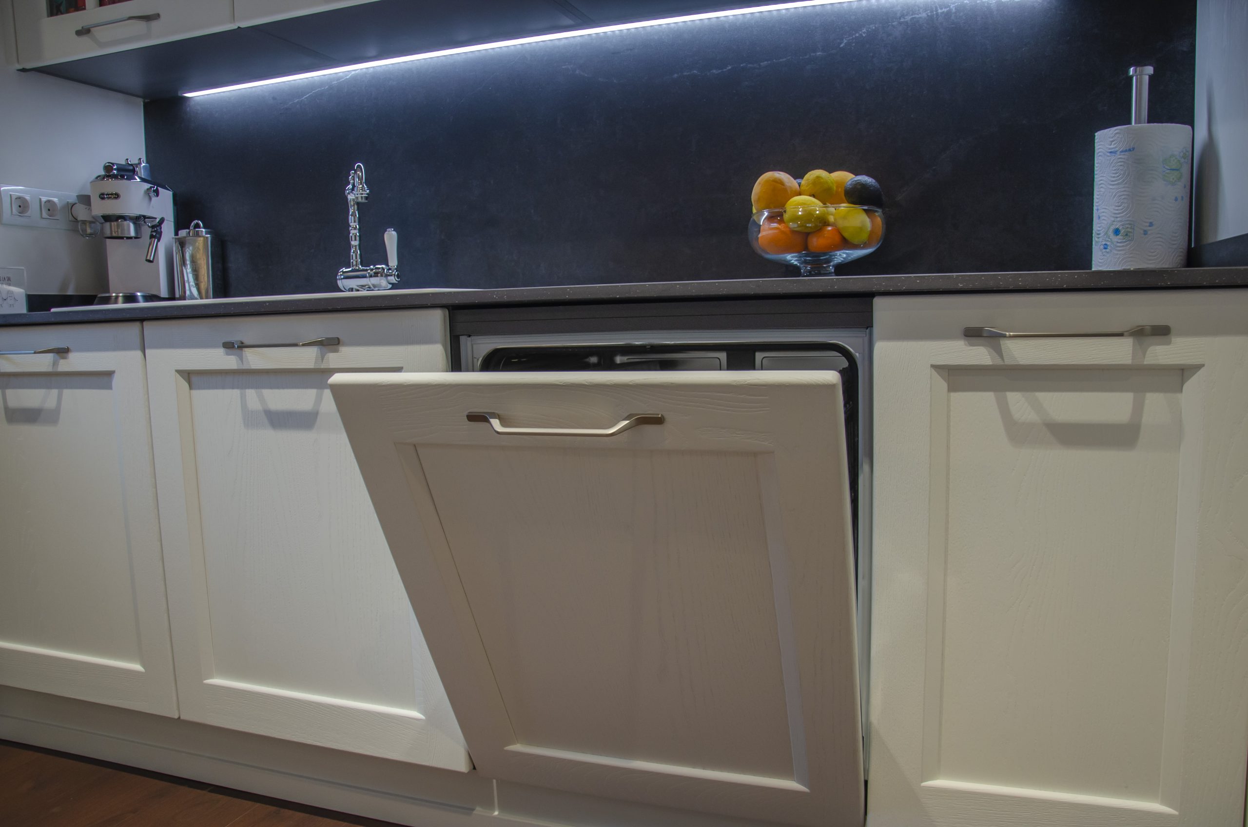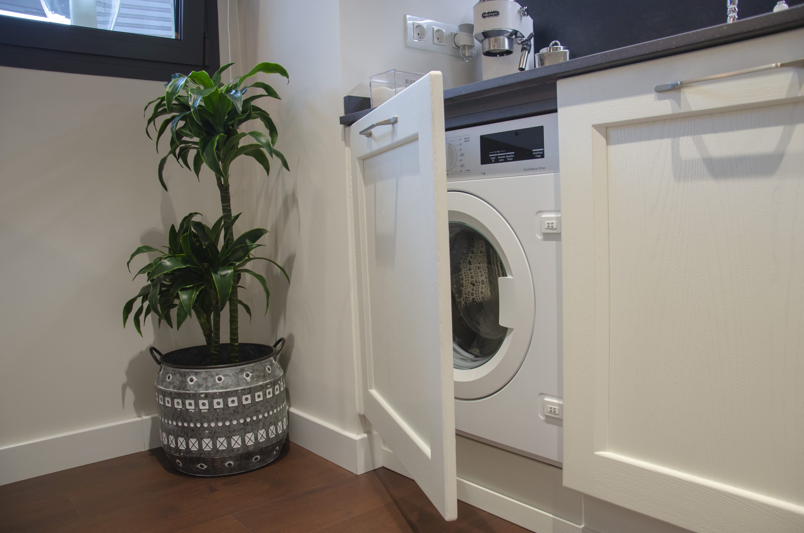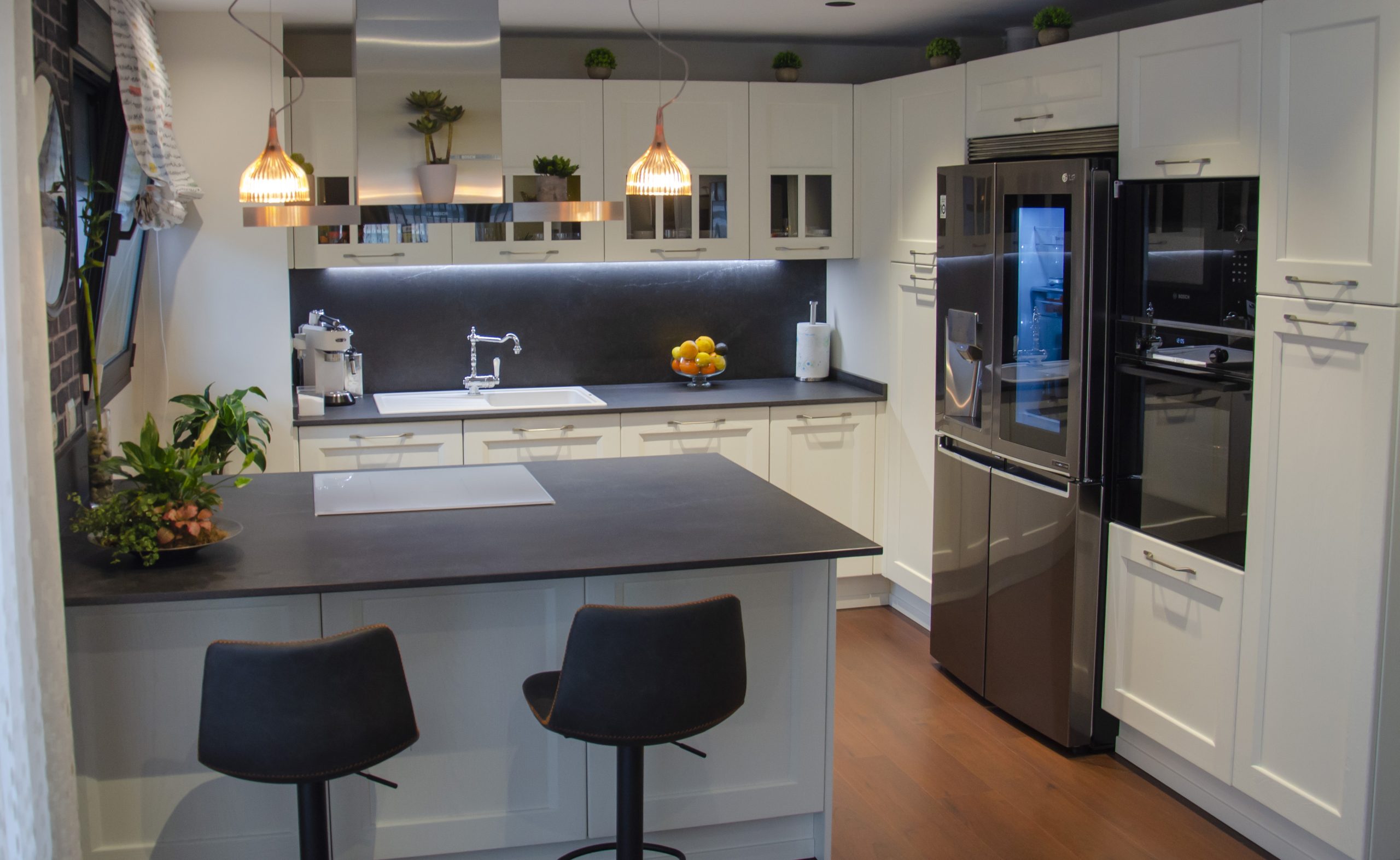 Los electrodomésticos de este proyecto equipado con BOSCH son una de las razones por las que esta cocina es imposible que sea clasificada como clásica. Disponemos de una placa vitrocerámica de inducción en color blanco en absoluta tendencia, una lavadora y un lavavajillas perfectamente disimulados e integrados en el interior de los muebles, un microondas y un horno en columna en acabado negro cristal, una campana de isla en acero inoxidable y una nevera que es la protagonista con su sistema de puerta de cristal y máquina de hielo. La clienta nos cuenta que sin duda, lo que más gusta cuando recibe visitas es la encimera Dekton en el color Laos de tan sólo 2 cm de grosor, su aspecto industrial sin dejar de imitar a piedra natural consigue conciliar lo más rústico con lo más urbano en esta cocina.