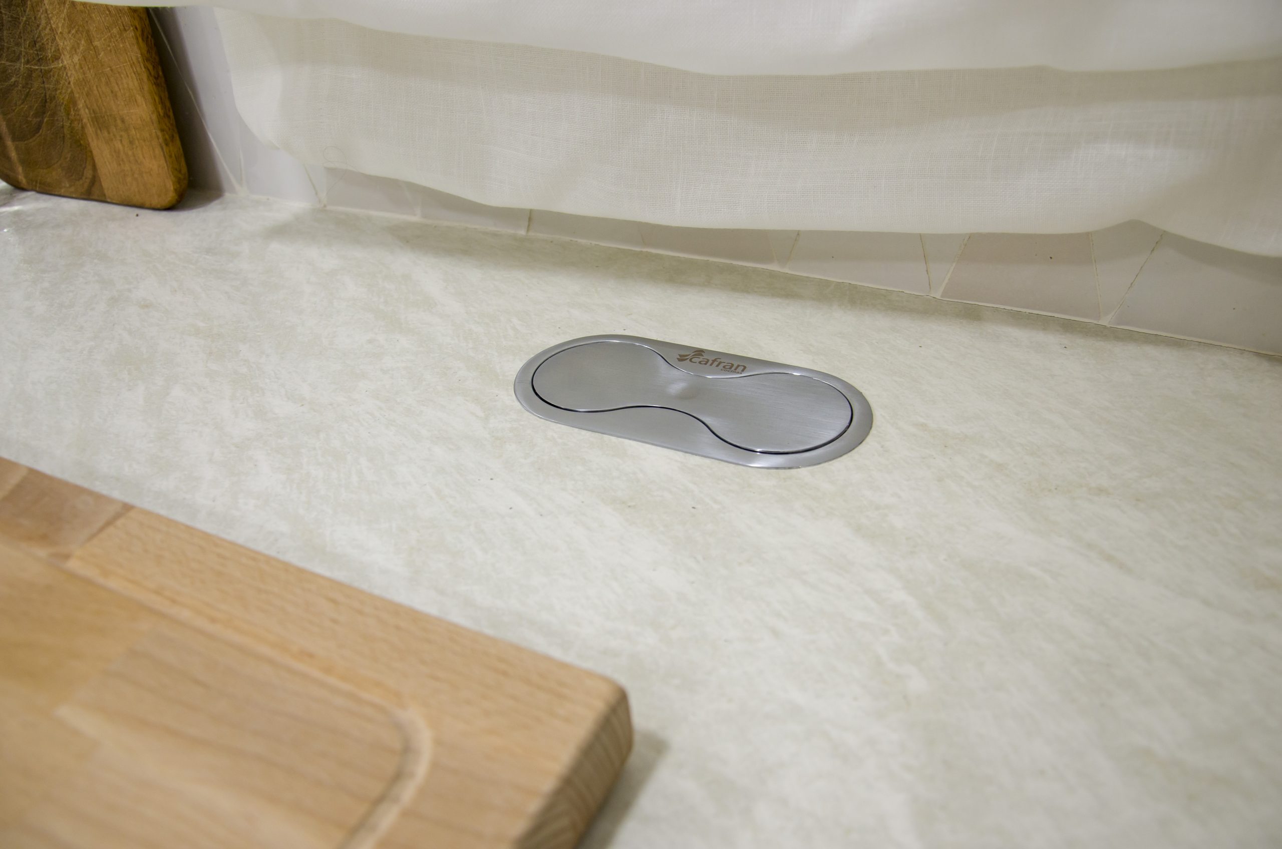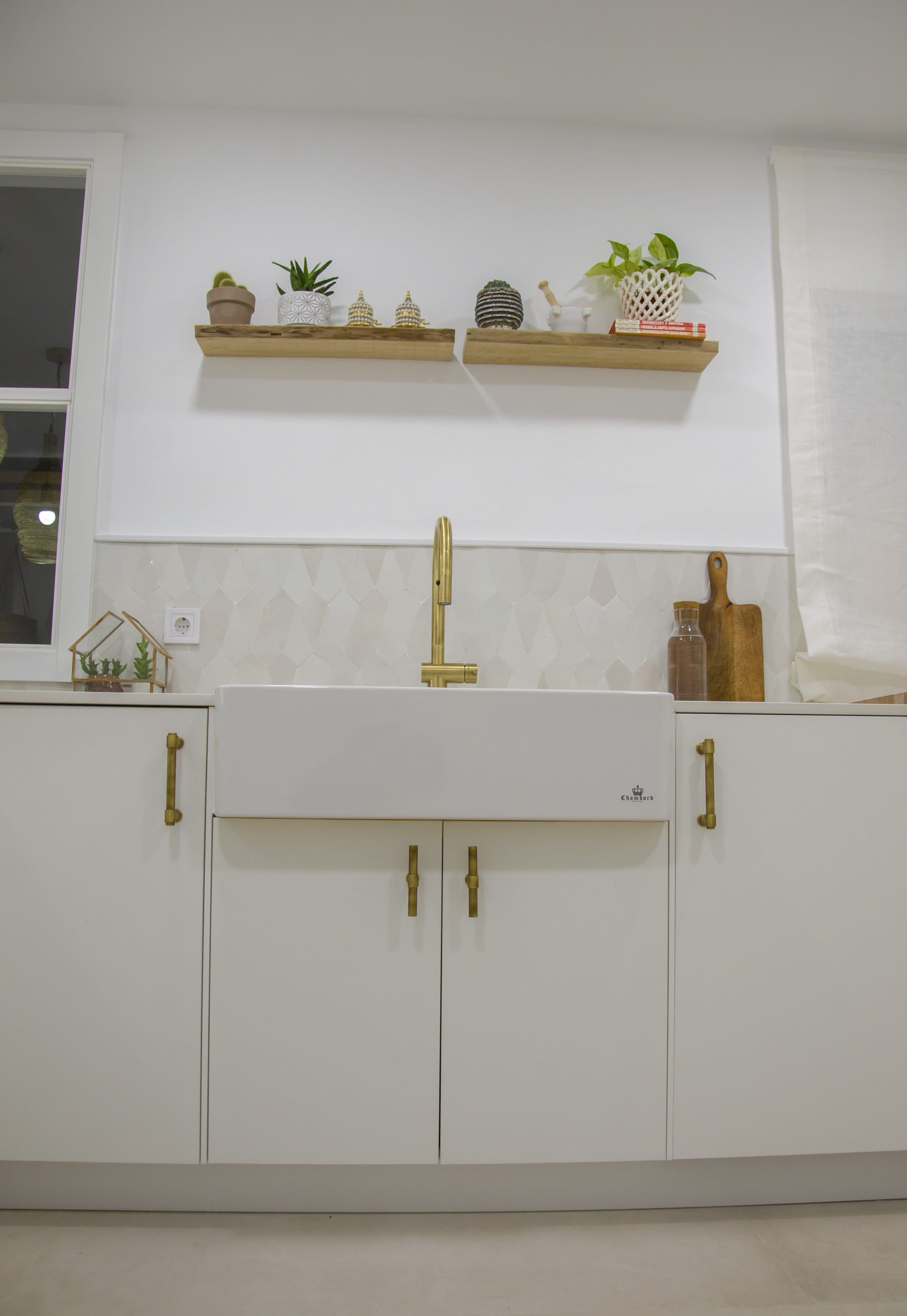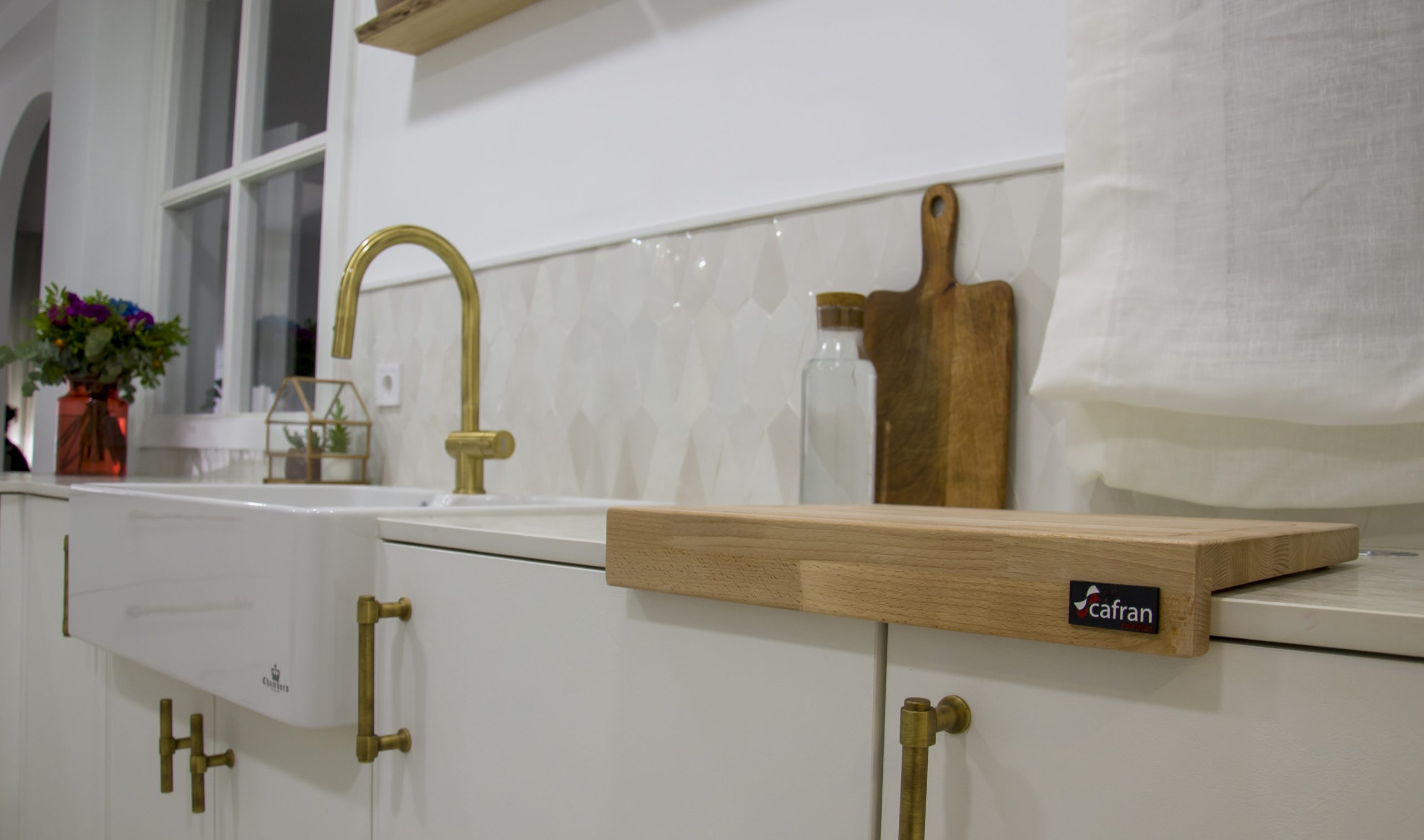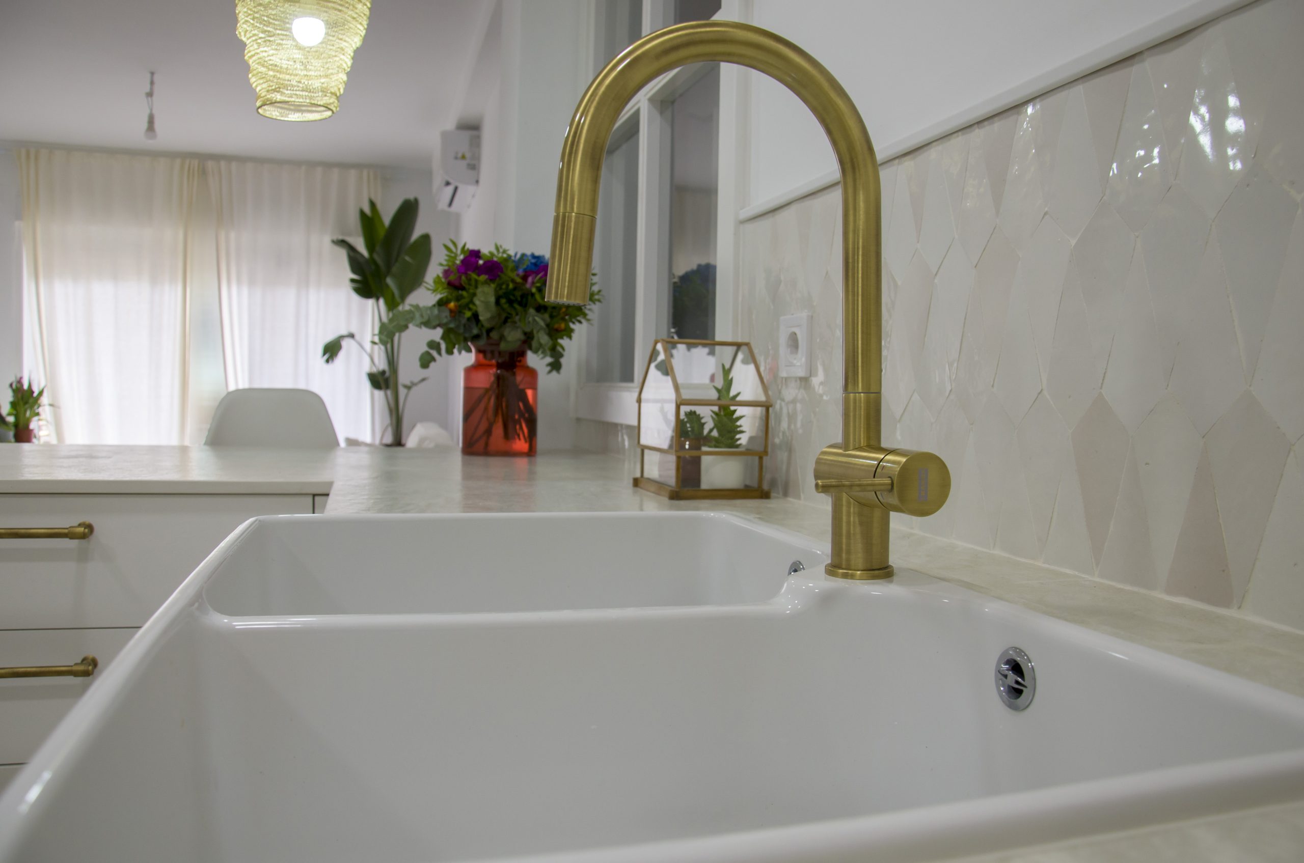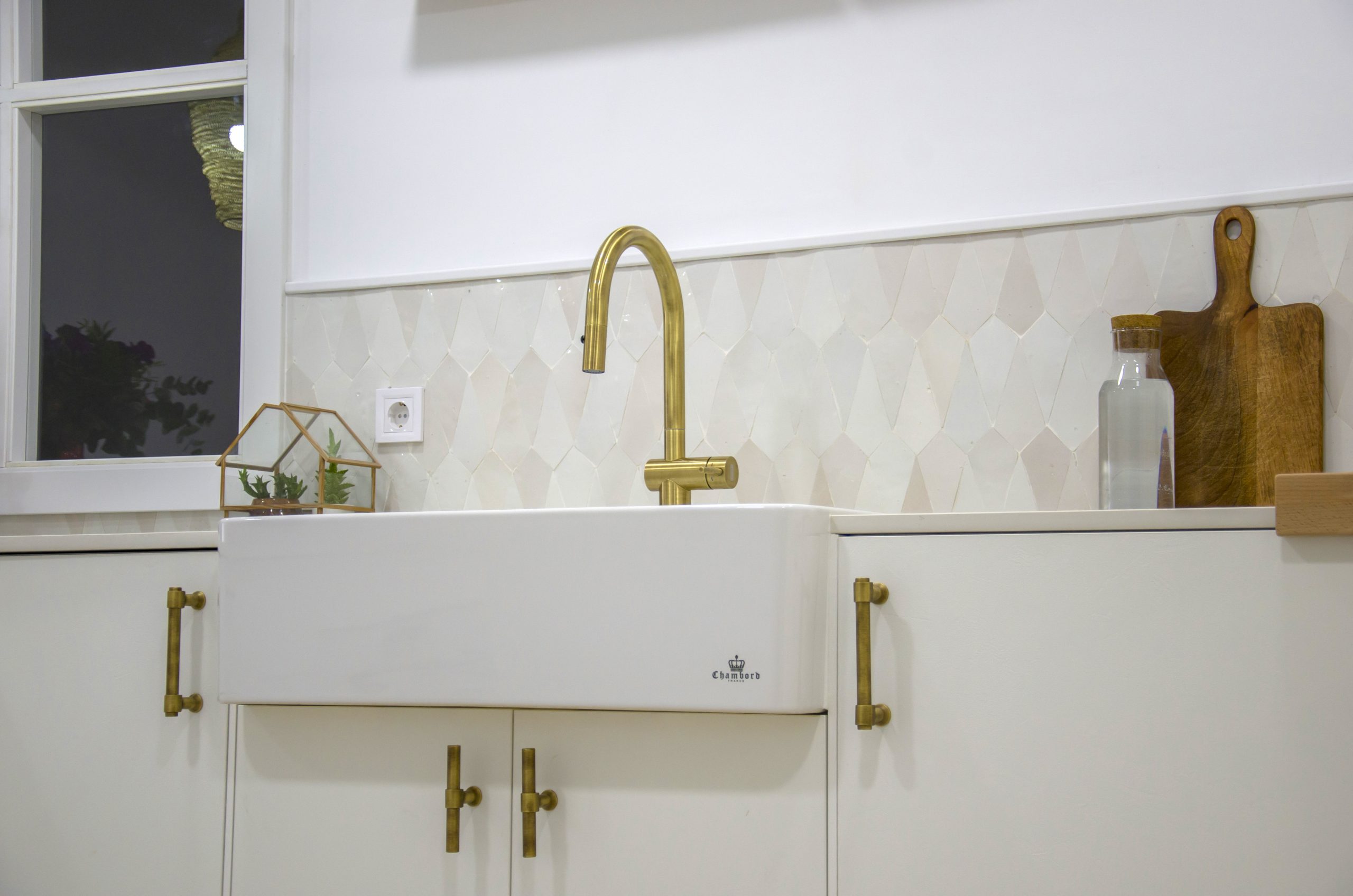 Para el fregadero tenemos algo muy especial ya que nos encontramos un fregadero impresionante de cerámica de la marca Chambord by Luisina modelo Clotaire II. El grifo en acabado bronce a juego con los tiradores completan esta estética fuera de nuestro tiempo. En combinación con la trasera realizada con azulejos hechos a mano volvemos a sentirnos en una auténtica casa de estilo mediterráneo. Para los complementos de esta cocina se ha confiado en Cucine Oggi, desde los cubos de basura para los interiores hasta un enchufe sobre encimera en acero inoxidable modelo Butterfly.