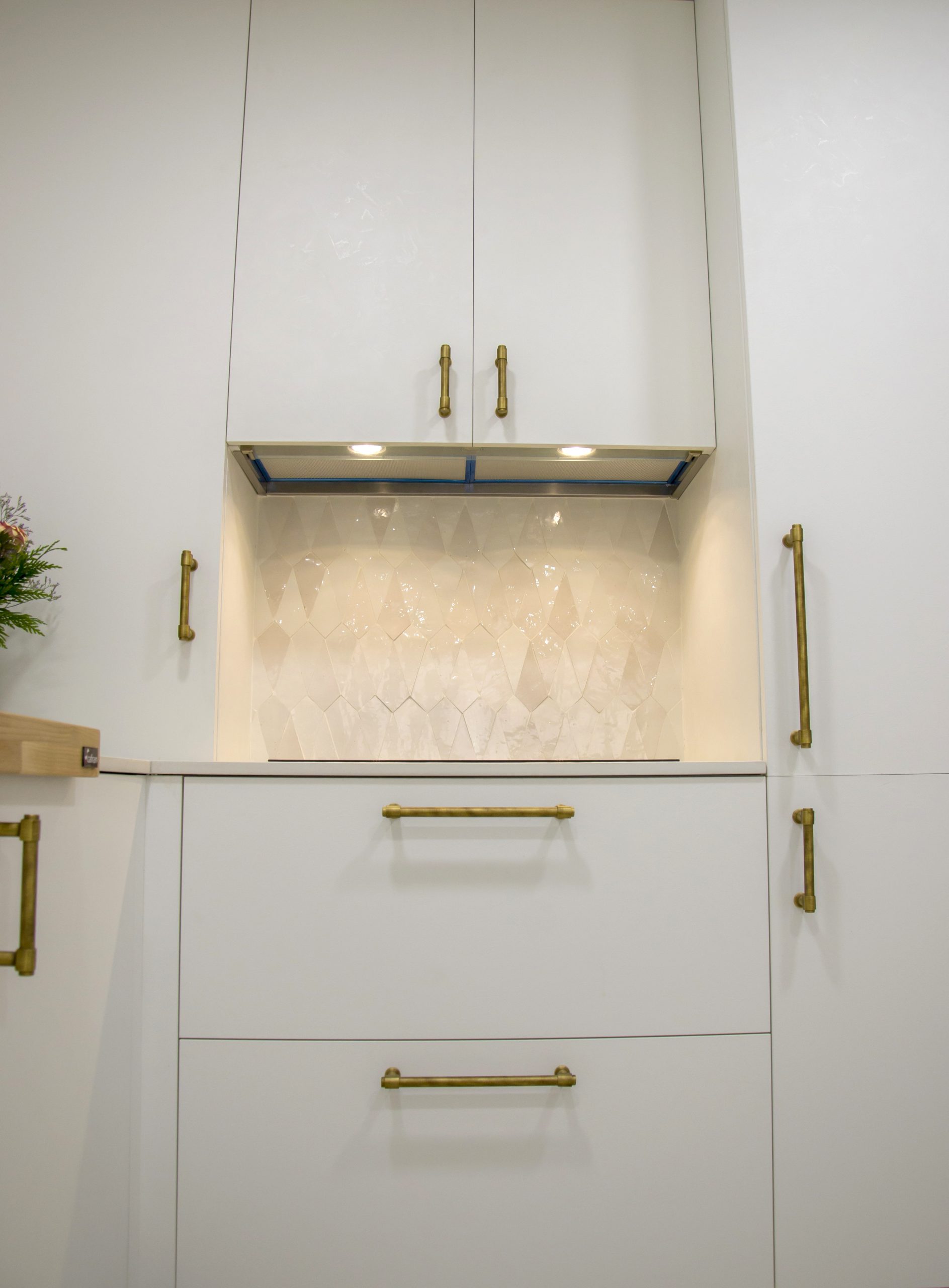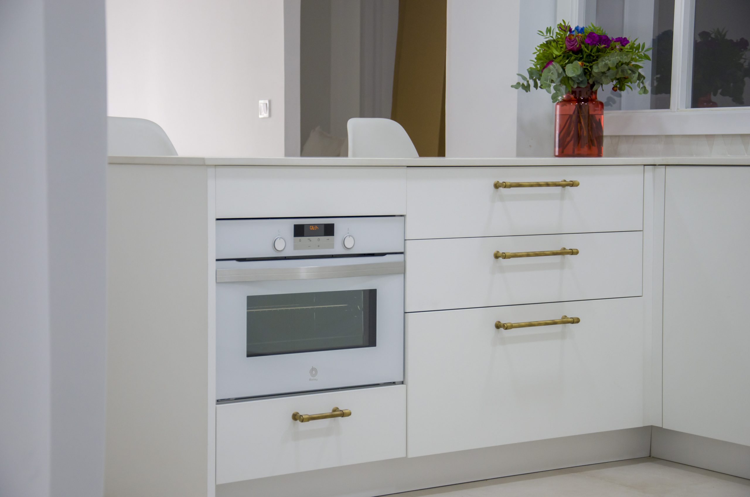 El mobiliario es de nuestro fabricante Arrital en su modelo más versátil, Ak_Project. El acabado para las puertas Wall-73 ya lo conocemos bien por sus características únicas, pero esta vez además se le ha dado otro giro de diseño a la puerta instalando unos tiradores de bronce que sin duda, han sido un acierto. Para la encimera se ha seleccionado el modelo Liquid Shell de Dekton by Cosentino, este acabado está íntimamente conectado al mar gracias a la textura que imita los surcos que dejan las olas al pasar por la arena. En su tono blanco roto con brillos que varían cromáticamente según el patrón, nos evocan a las conchas marinas que podemos encontrar cuando damos un relajante paseo por la orilla de nuestro mediterráneo.