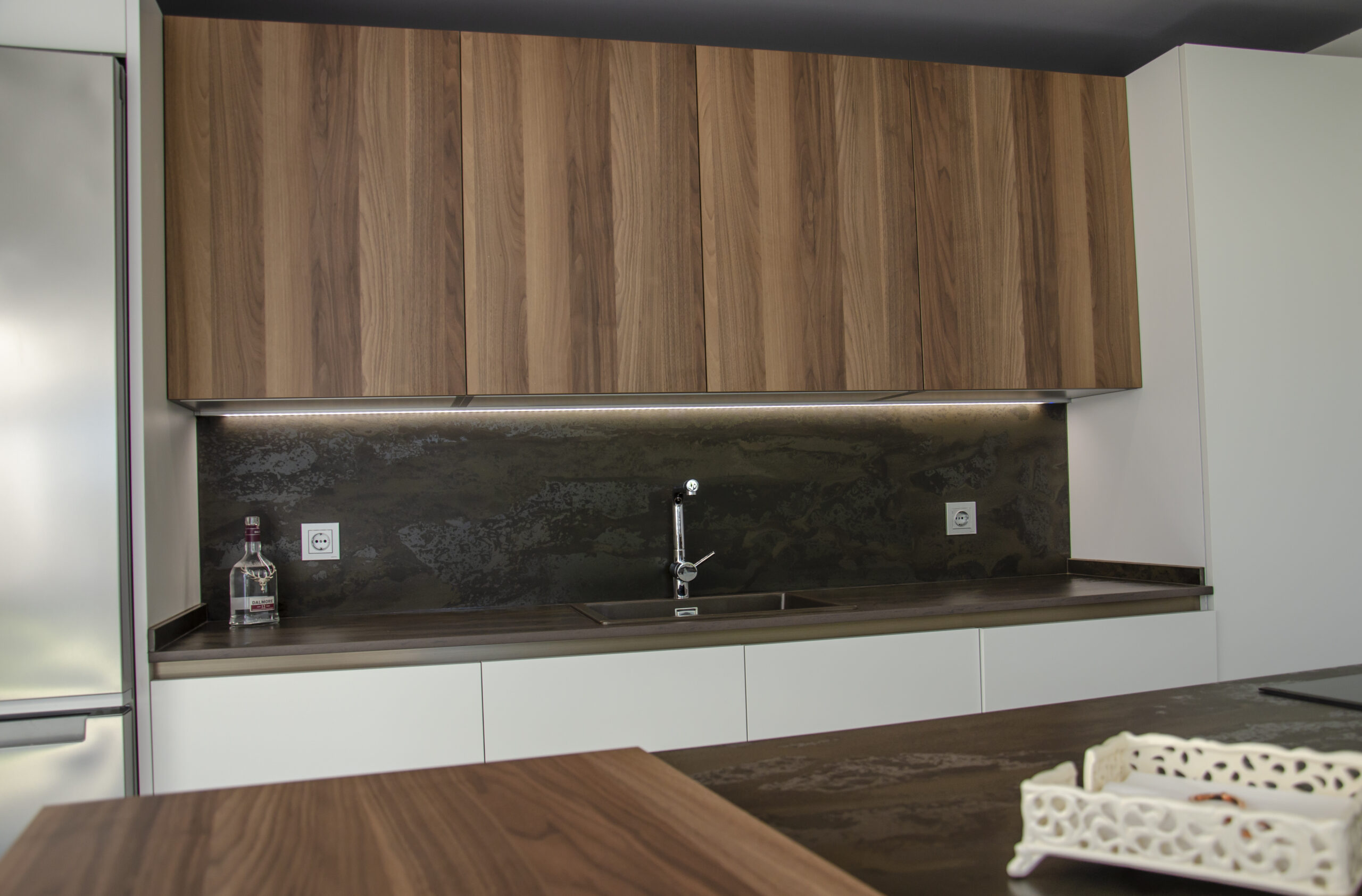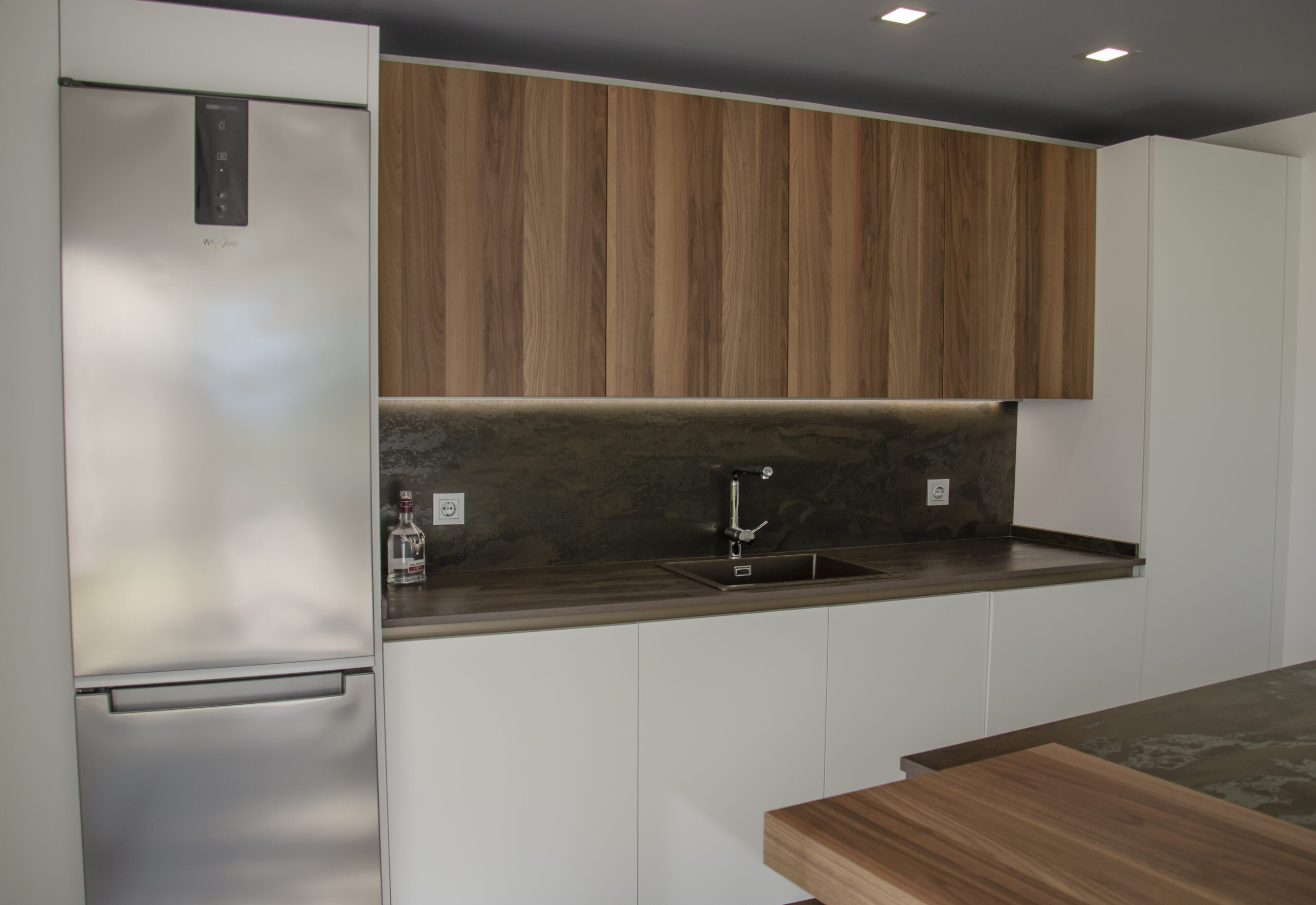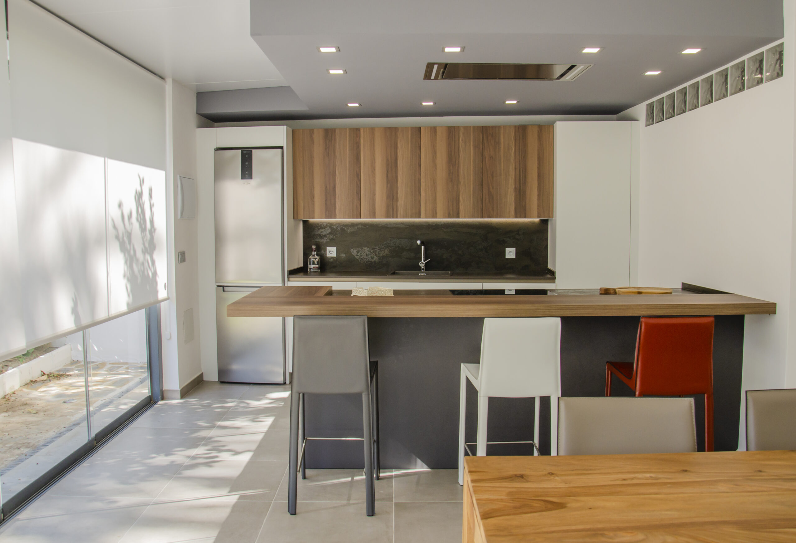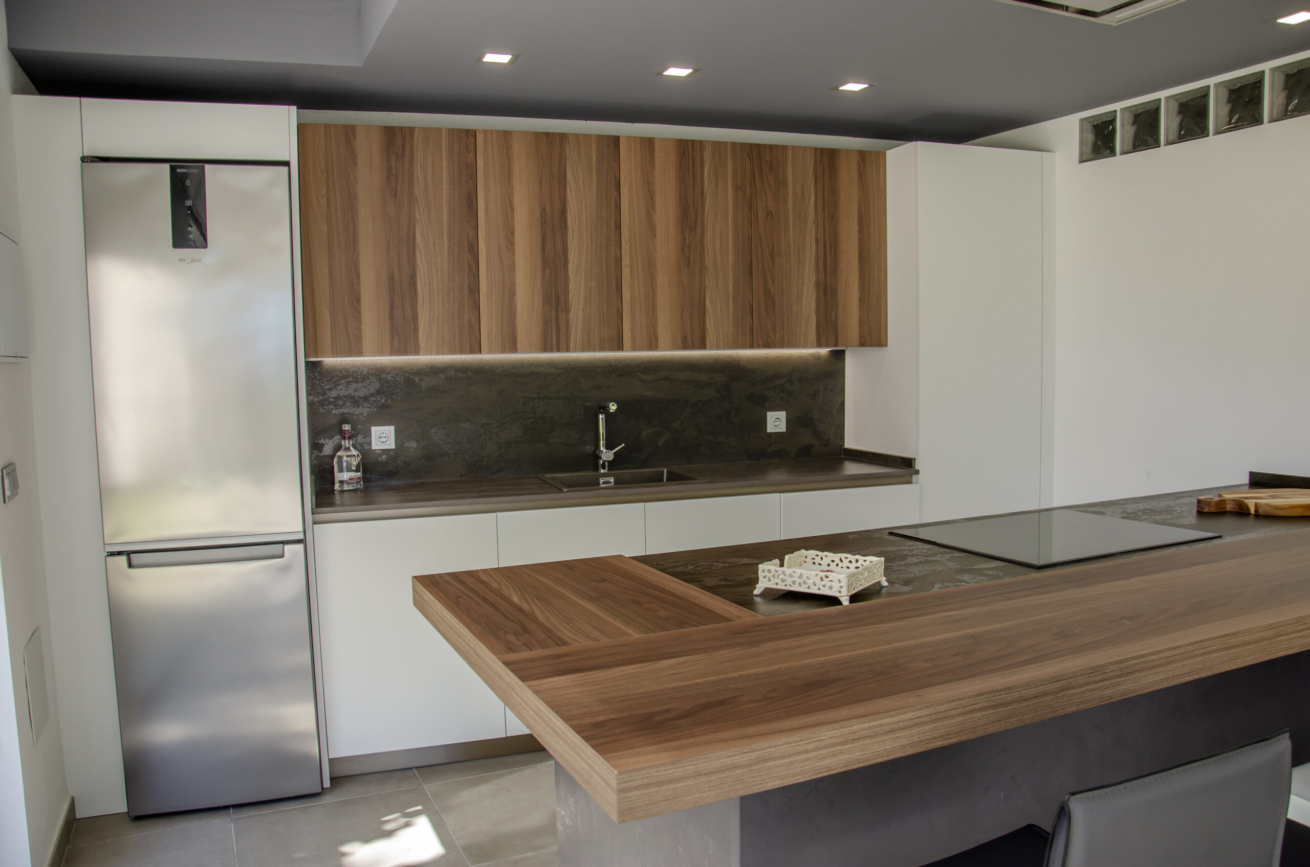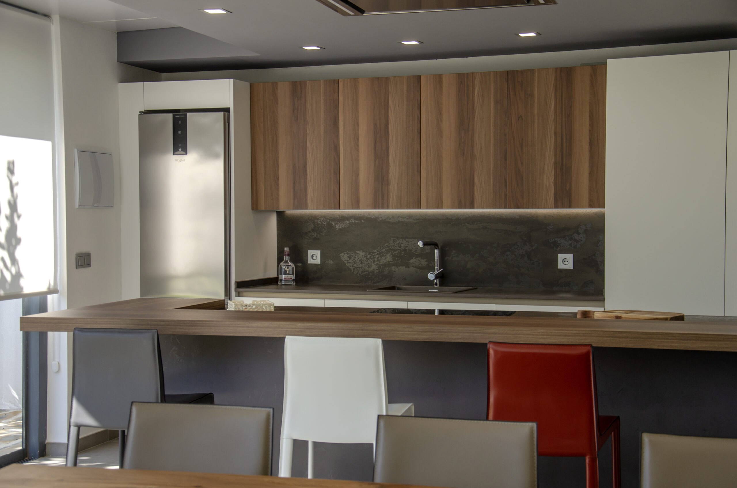 El modelo que se ha seleccionado para este ambiente ha sido Ak_Project de nuestro fabricante Arrital en dos acabados diferentes para crear contraste: un termoestructurado madera y un blanco mate en puerta de 22cm de grosor. La barra en forma de «L» también es de Arrital e imita a la madera en el color Nocce en un grosor de 6 cm.
