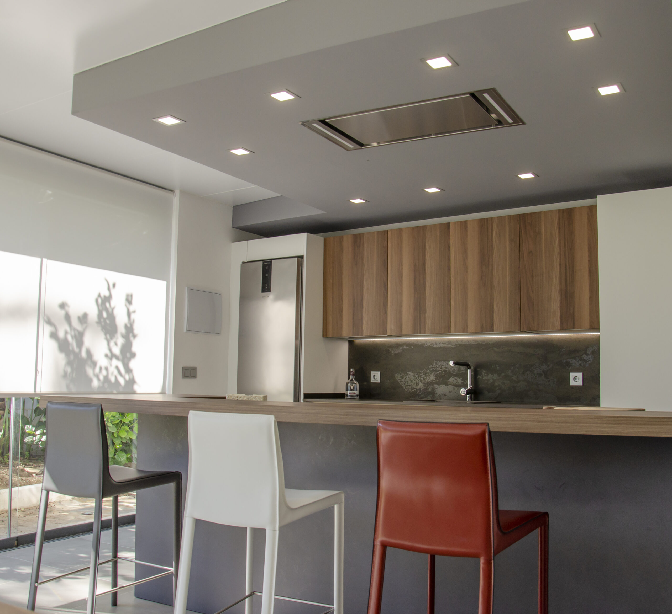 En primer lugar hablaremos de la extracción integrada en el techo en el elegante modelo Nitro de la casa Frecan, esta campana se ha seleccionado en acero inoxidable y se mimetiza a la perfección con el ambiente, dejando el espacio mucho más amplio a la vista. Como ya sabemos, la campana es esencial en una cocina no sólo para evitar malos olores, sino también para mantener en perfectas condiciones los muebles evitando la acumulación de grasa y humedad, sobre todo cuando se trata de un espacio abierto en el que se comparten distintos ambientes como es este caso. De la casa Whirpool tenemos el frigorífico combi en acero inoxidable modelo W791100X, un lavavajillas integrado en el modelo WIE2B16 y la inducción modelo ACM330DAIXL Por último en la isla tenemos una vinoteca de la casa Caple modelo WI3123.