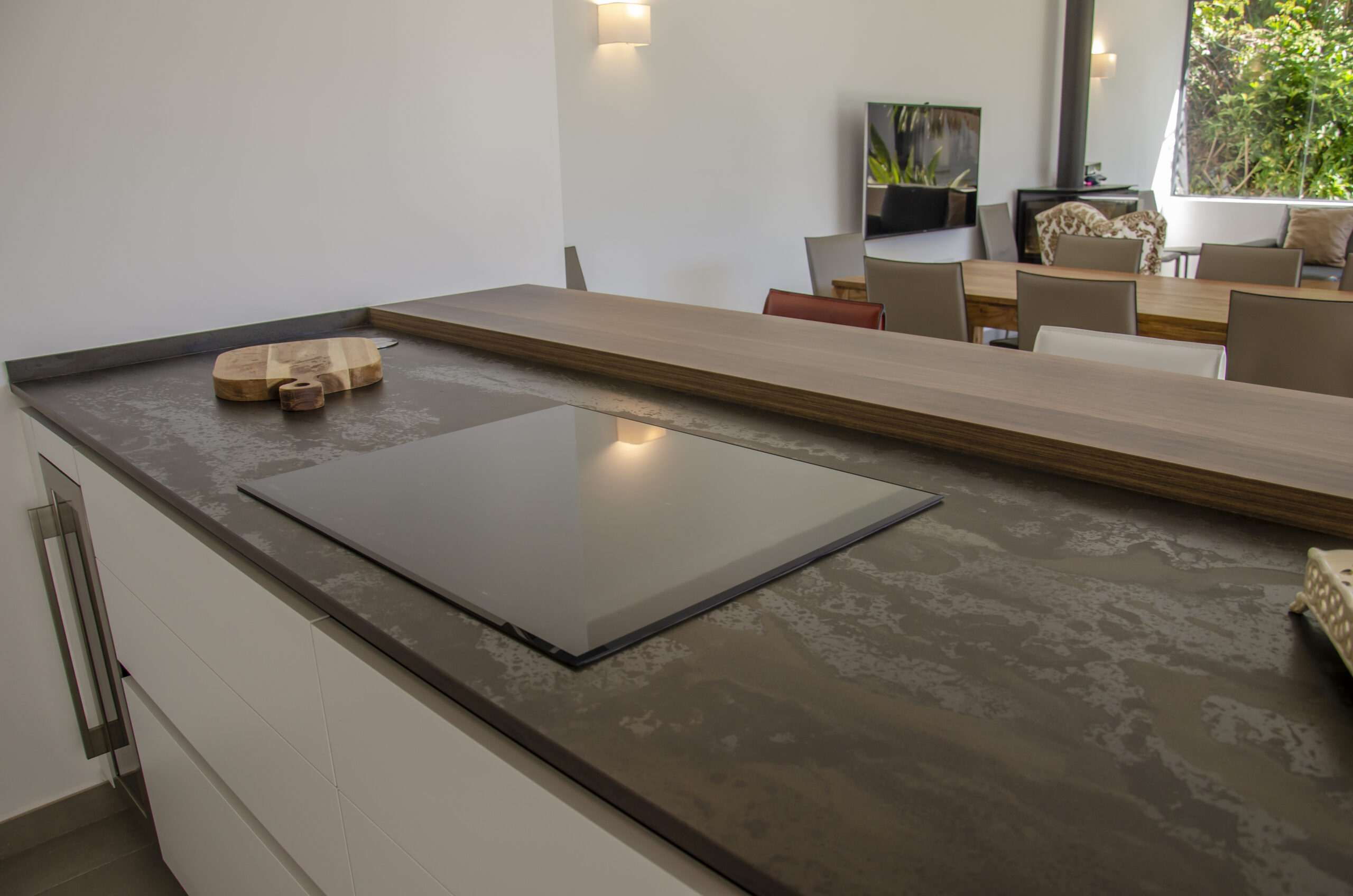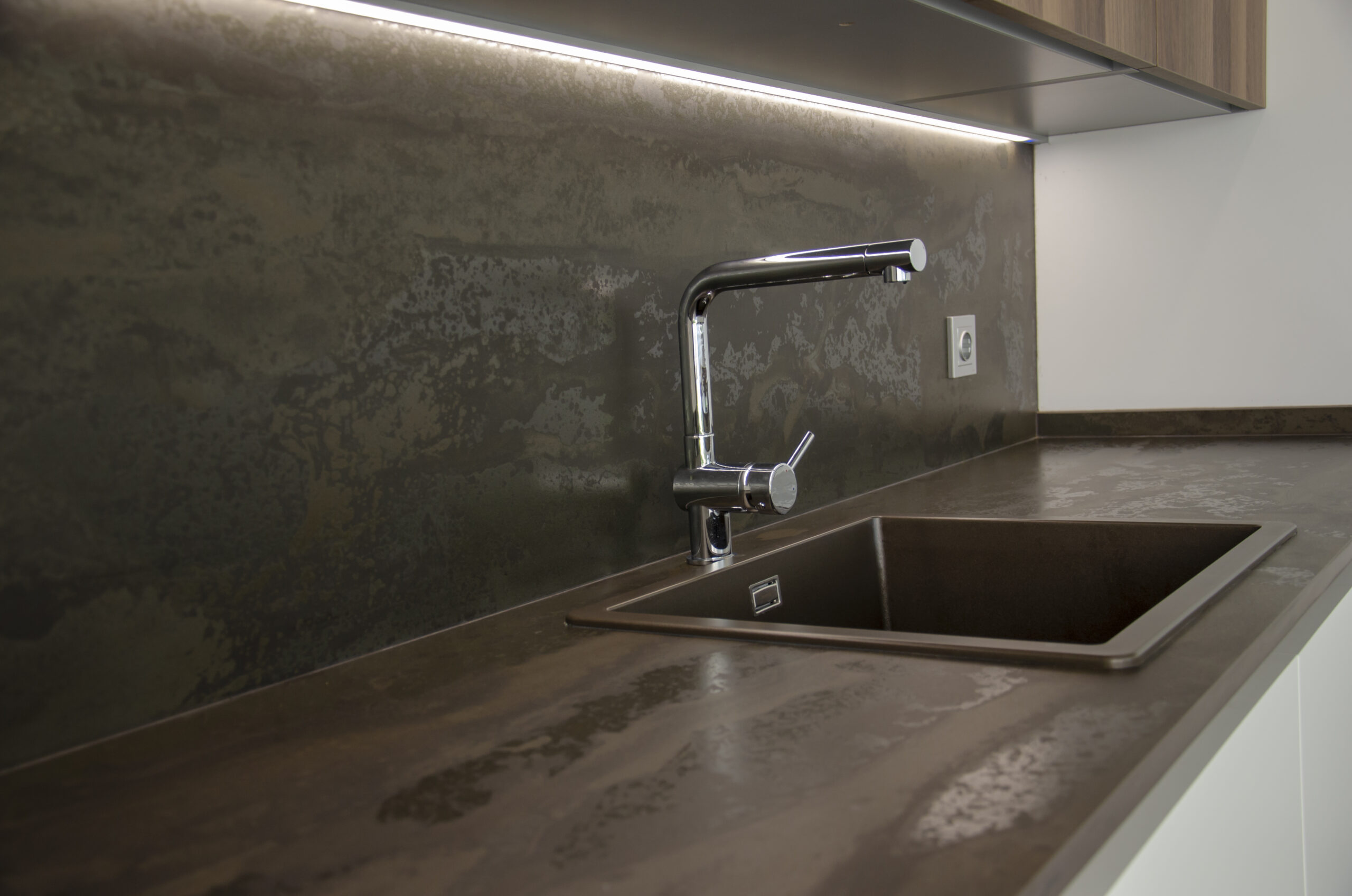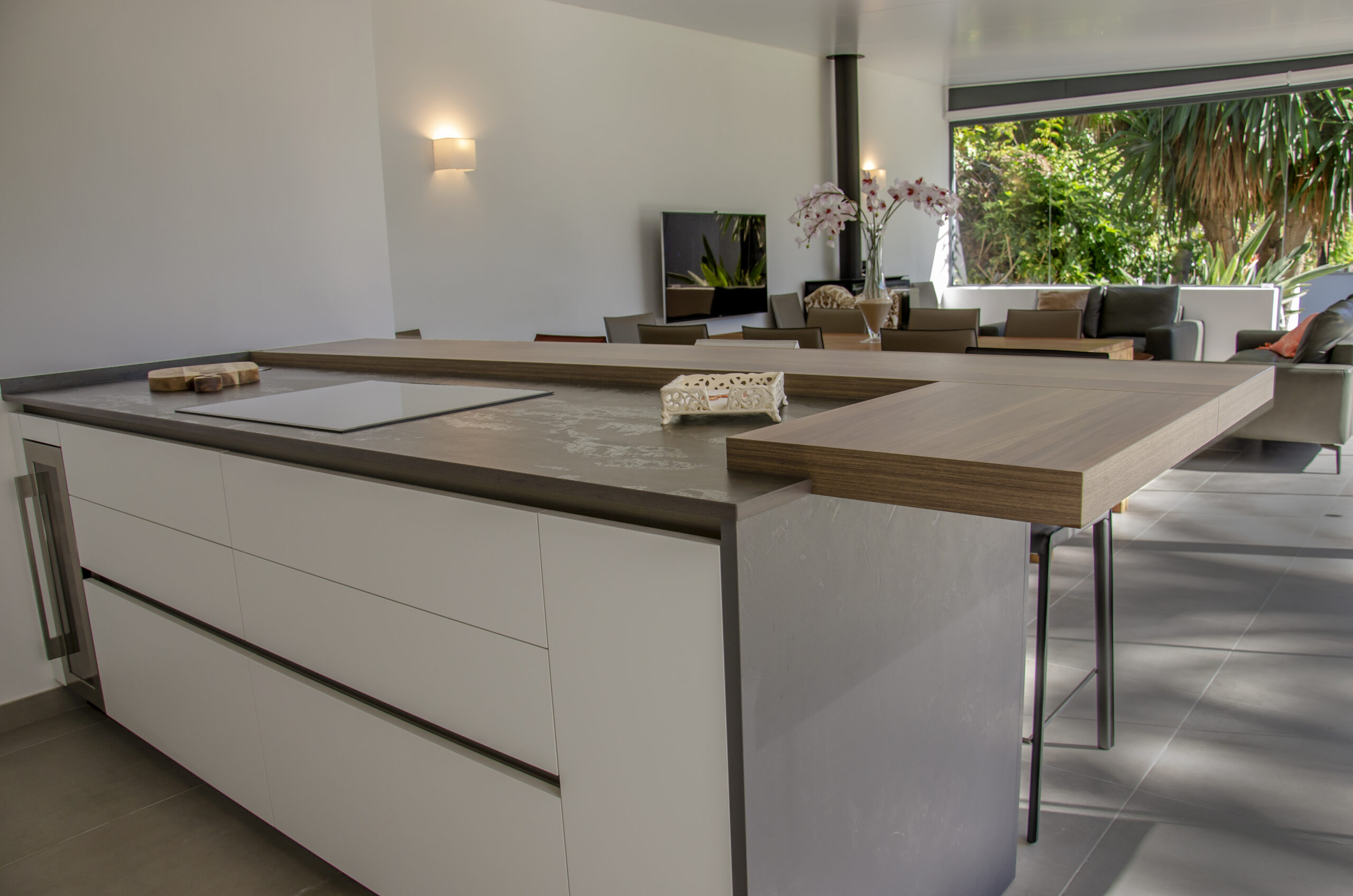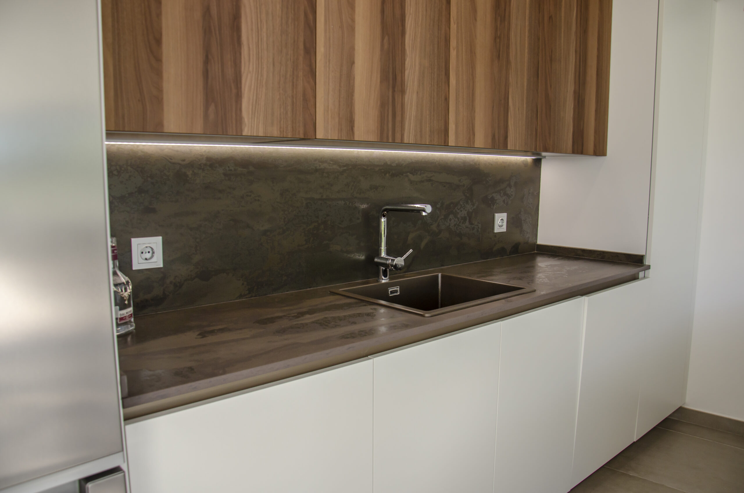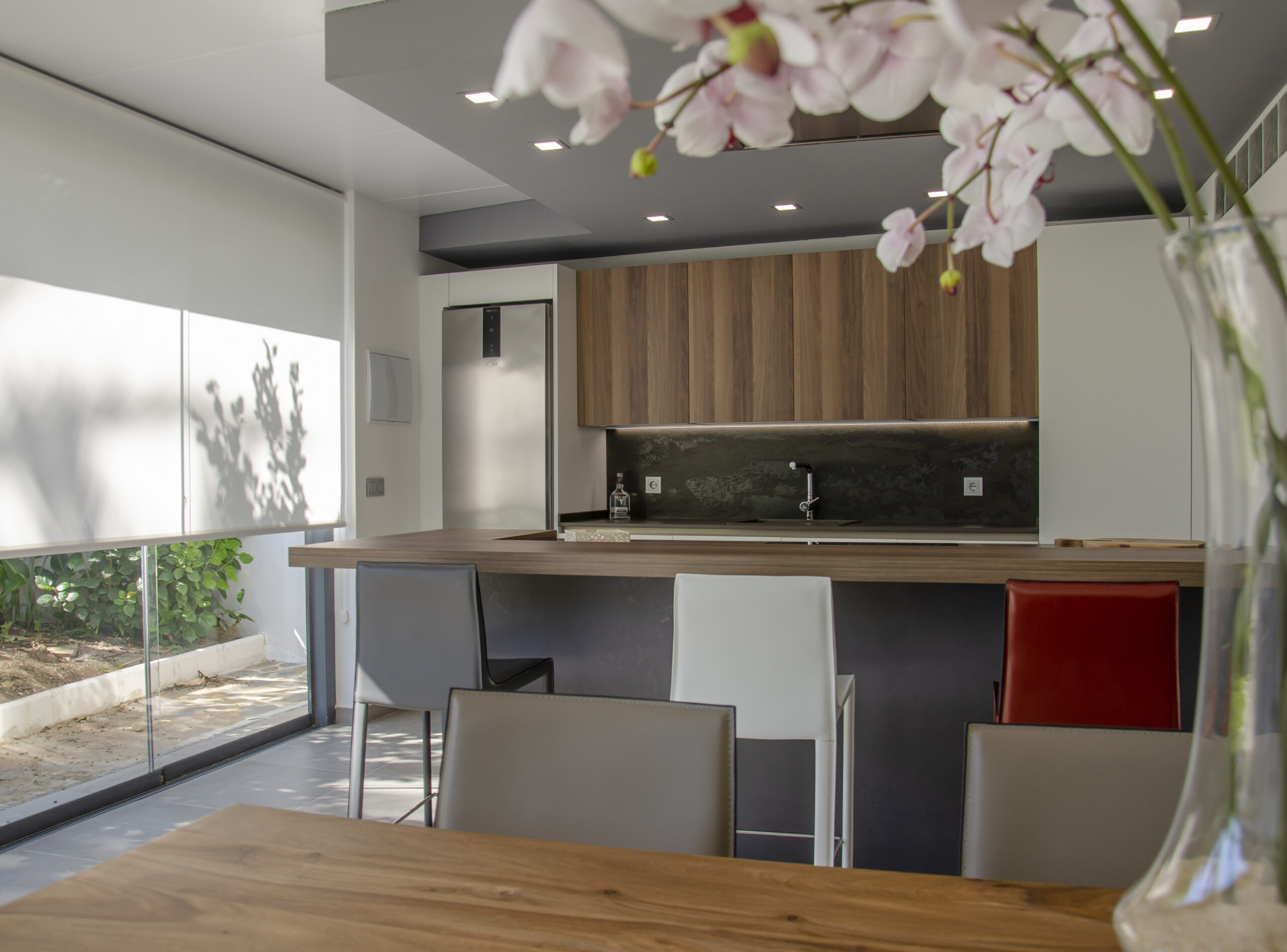 La encimera se ha elegido en Dekton modelo Radium, llegando incluso a ocupar el frente de la zona de aguas donde encontramos el fregadero Greenwich N-100L en color bronce y el grifo Pia Fix de la casa Schock. Completamos con algunos accesorios como la iluminación bajo mueble de Coggi. Esperamos que os haya gustado este proyecto que se mimetiza con el jardín para poder disfrutar de ambas zonas de una forma fluida.